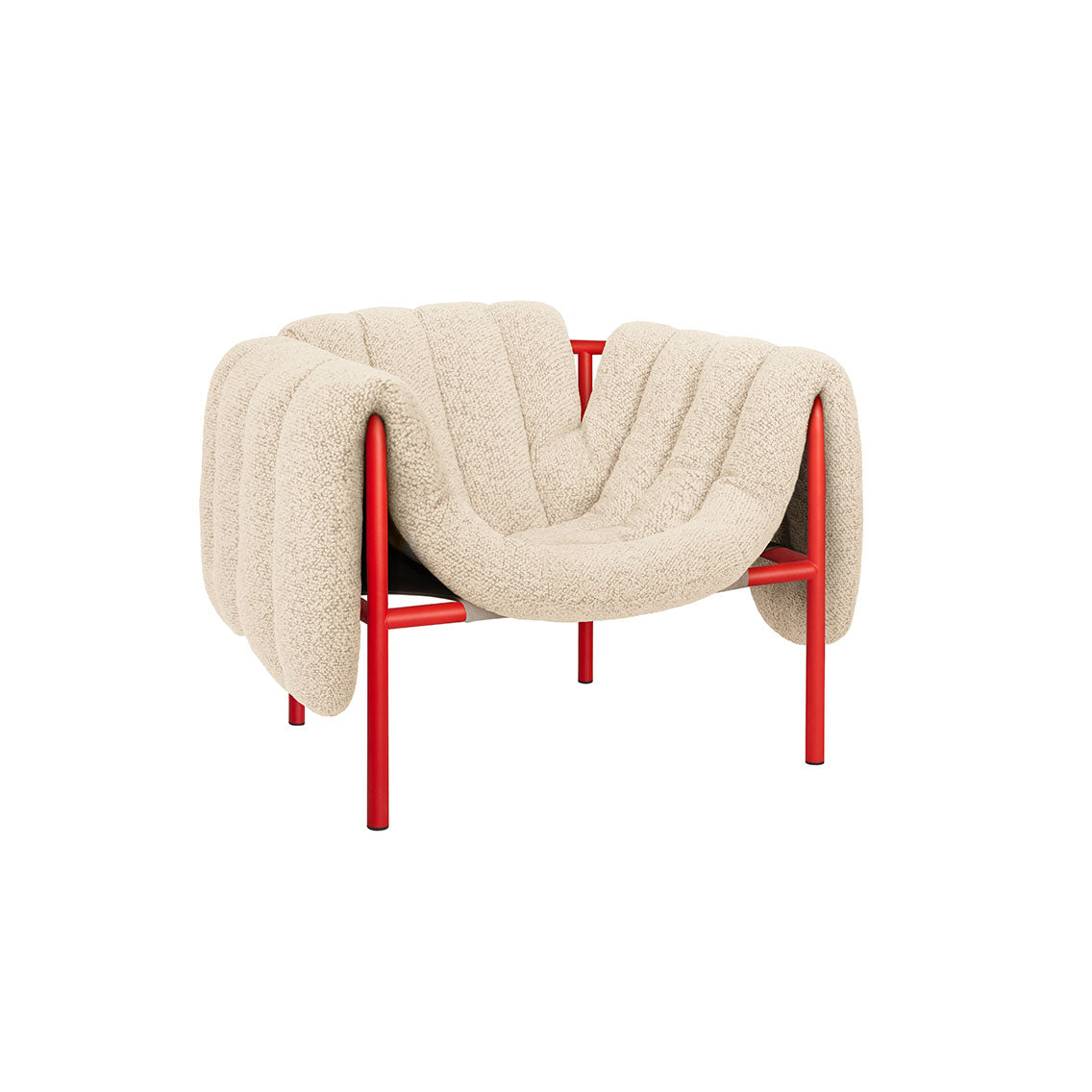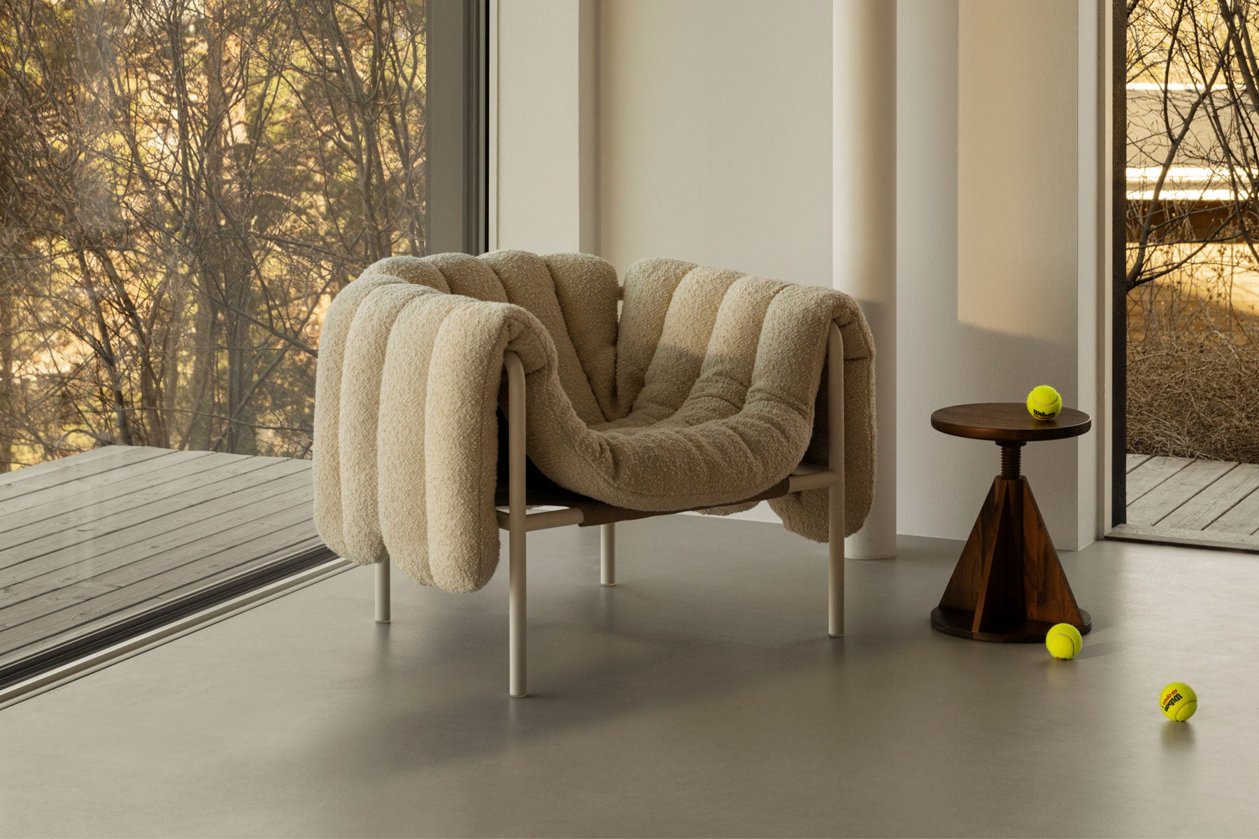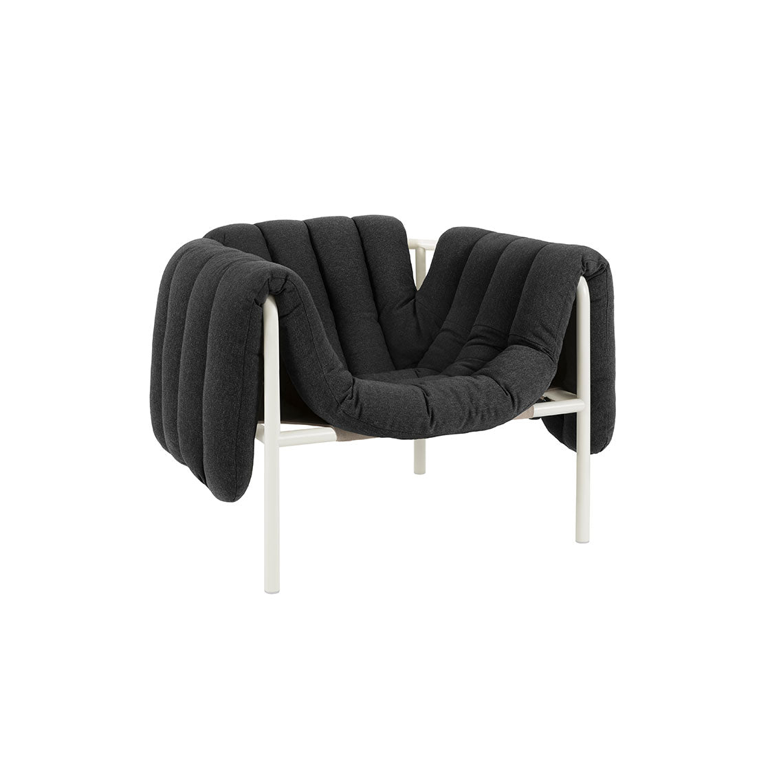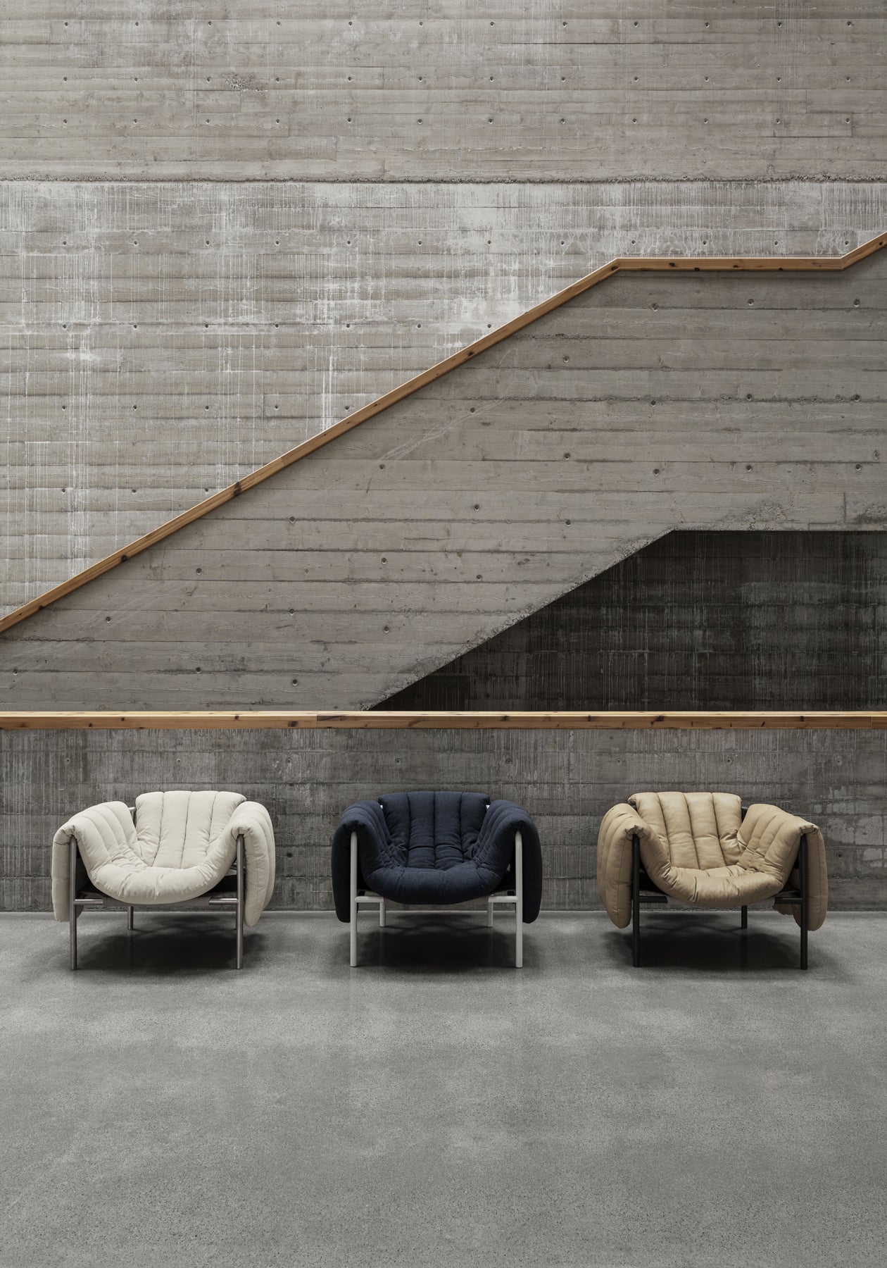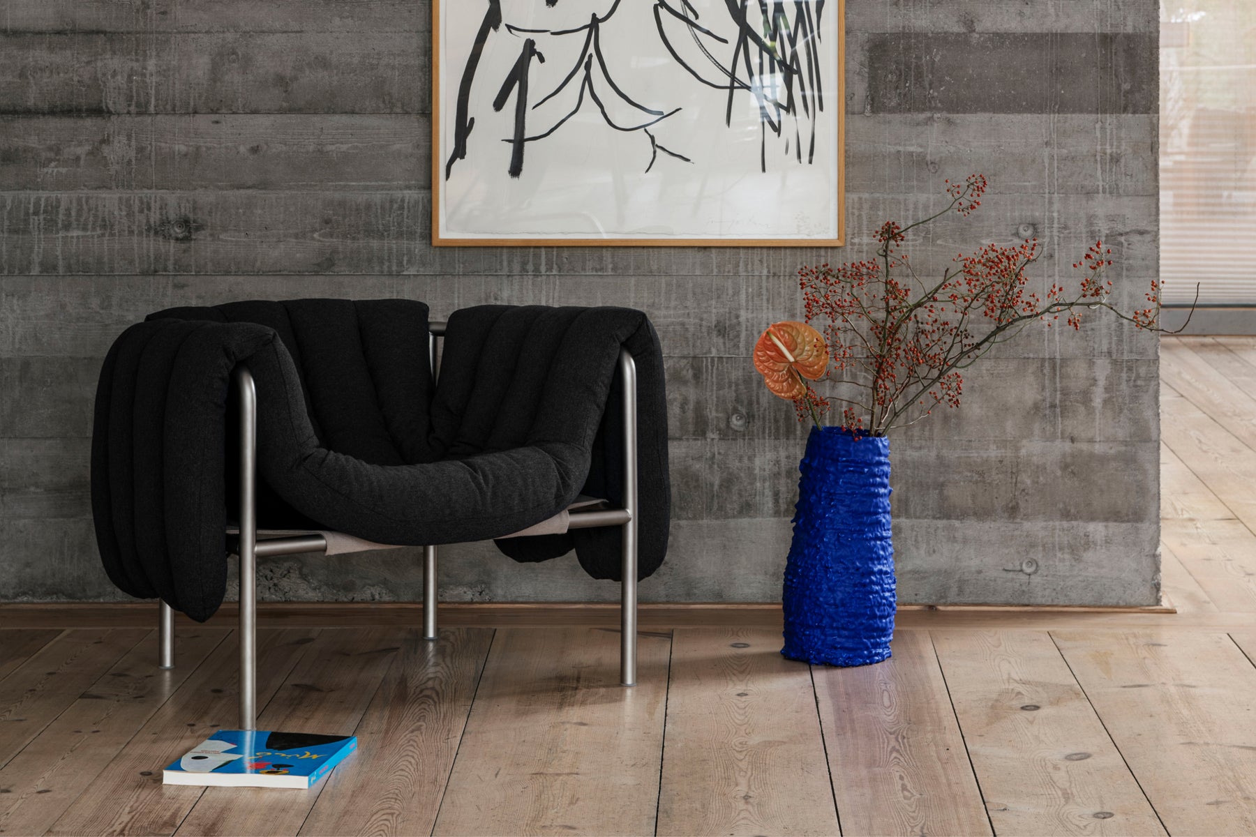 The two key elements of this seating design by Faye Toogood are in purposeful and playful juxtaposition. The elementary frame is inspired by the rational structure of classic modernist design, whilst the extravagant quilt-like upholstery warmly embraces and envelopes, is comforting and reassuring. The Puffy Chair frame is available in powder-coated or sand-blasted steel finishes and a choice of thick canvas, chunky bouclé or luxurious leather upholstery.