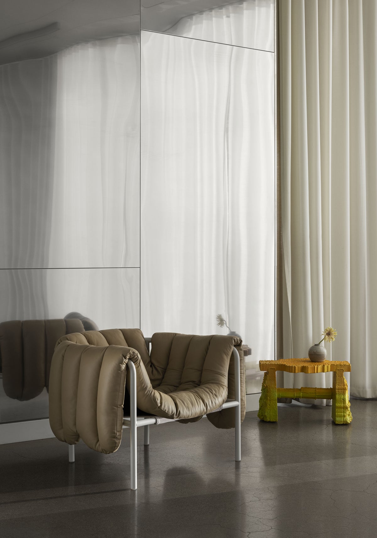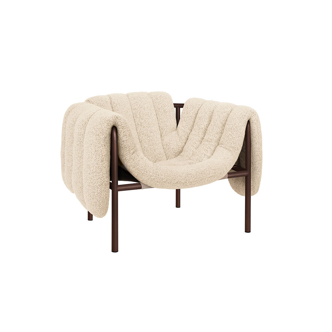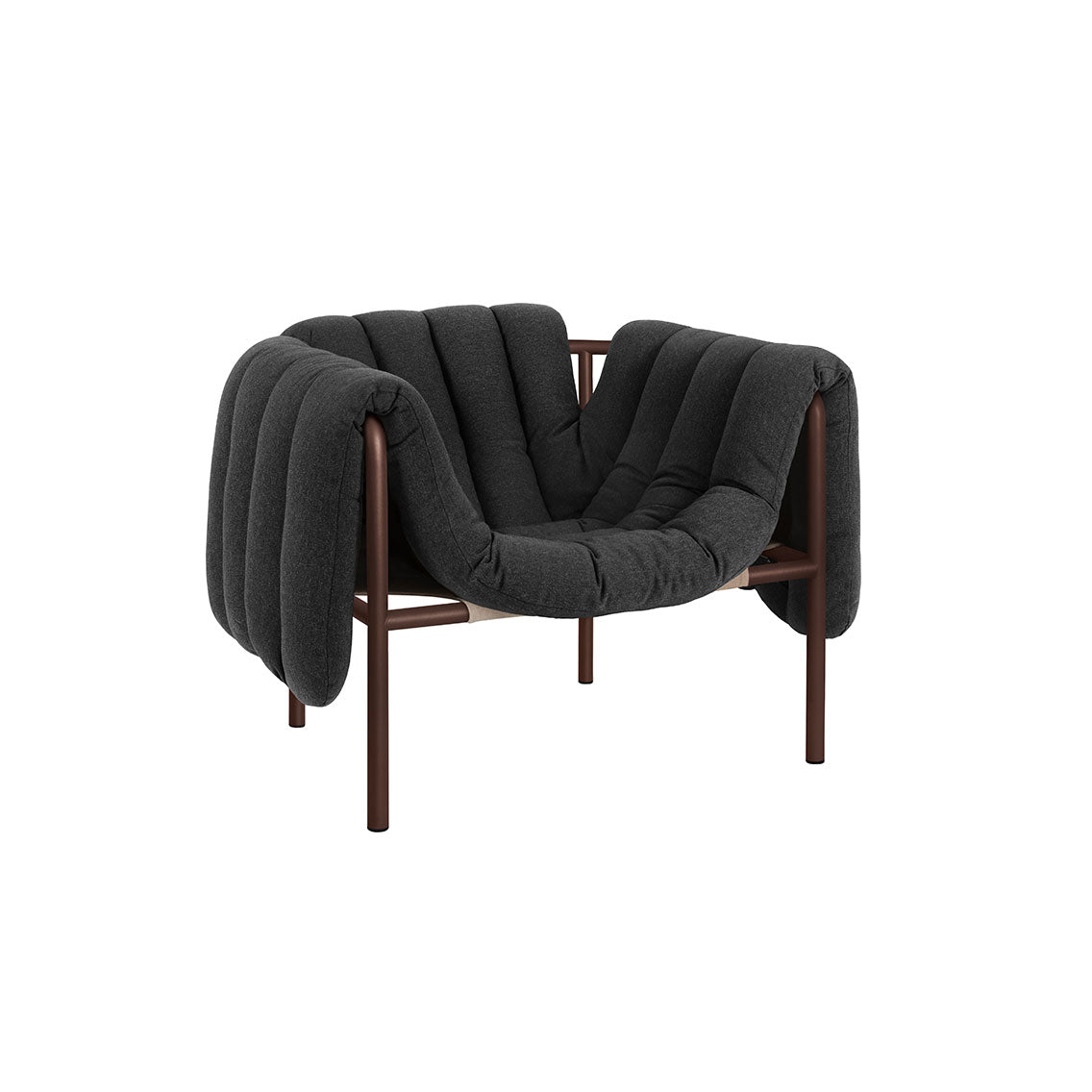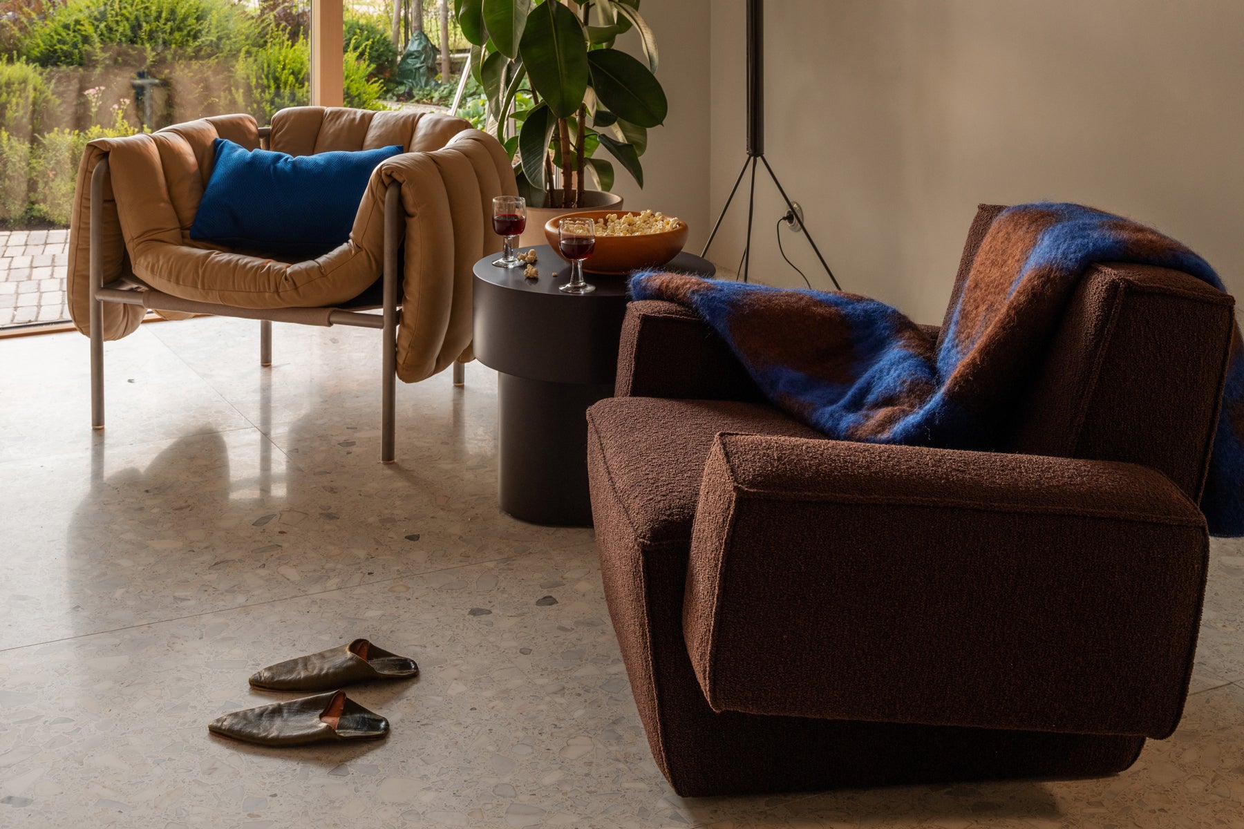 The two key elements of this seating design by Faye Toogood are in purposeful and playful juxtaposition. The elementary frame is inspired by the rational structure of classic modernist design, whilst the extravagant quilt-like upholstery warmly embraces and envelopes, is comforting and reassuring. The Puffy Chair frame is available in powder-coated or sand-blasted steel finishes and a choice of thick canvas, chunky bouclé or luxurious leather upholstery.