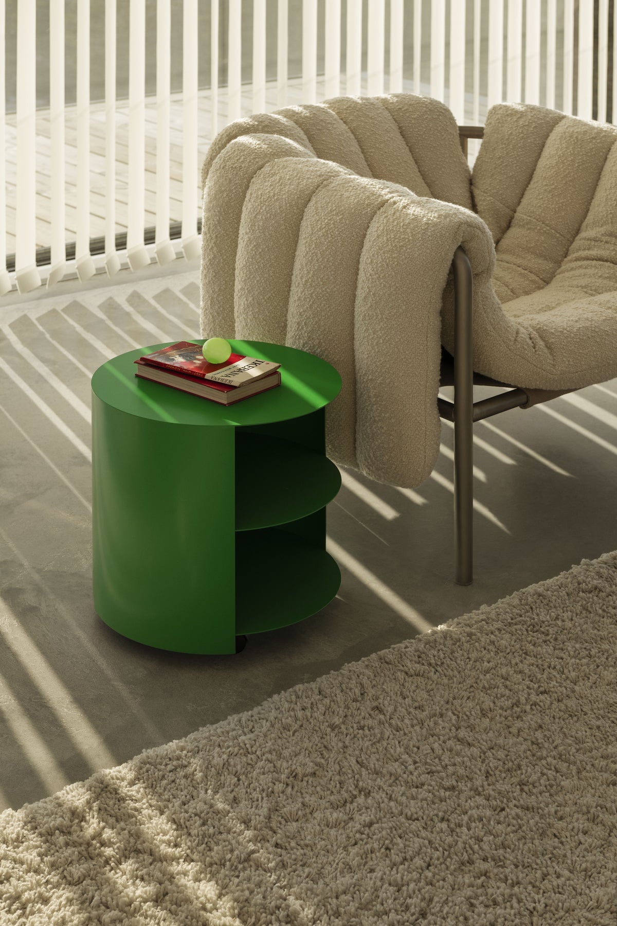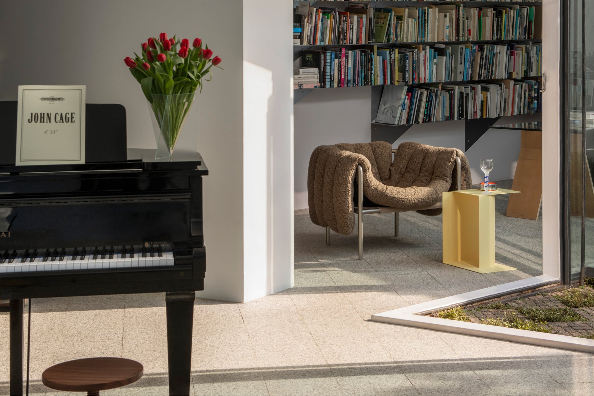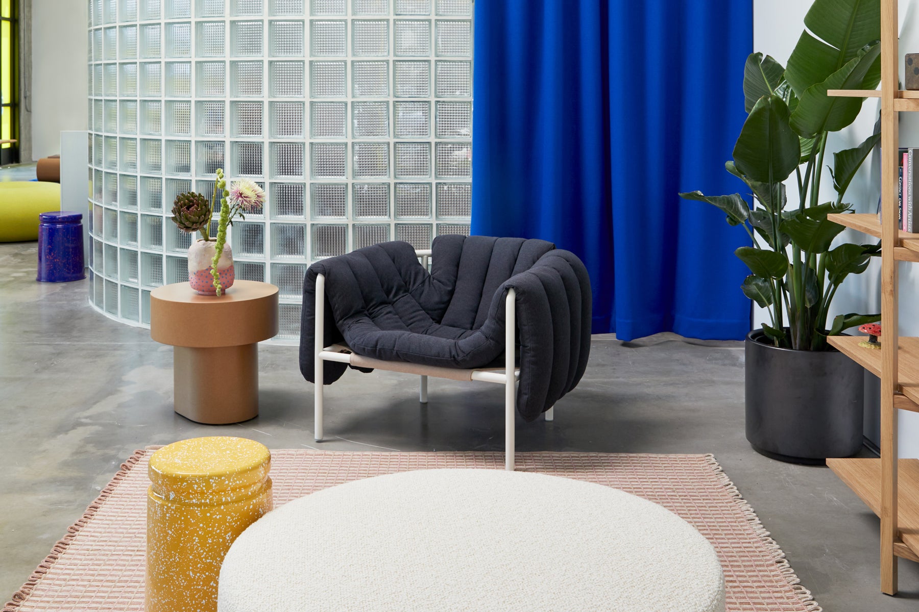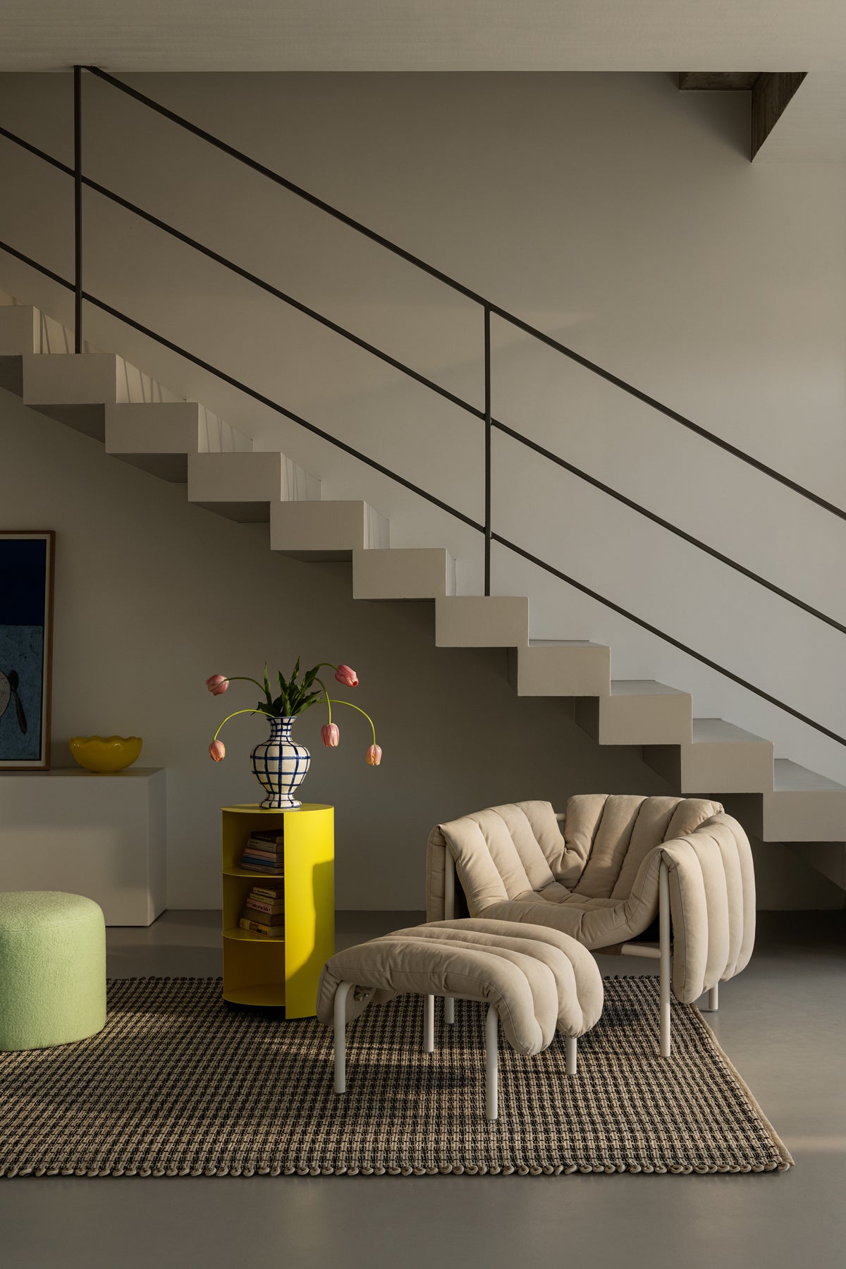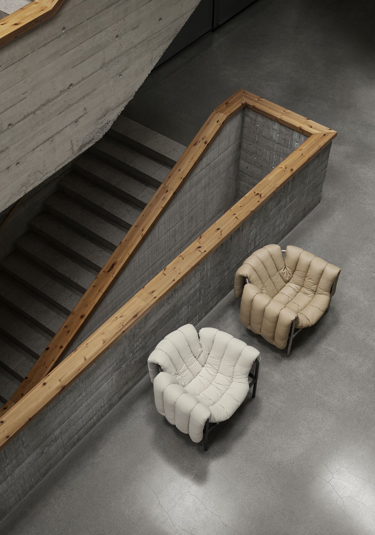 The two key elements of this seating design by Faye Toogood are in purposeful and playful juxtaposition. The elementary frame is inspired by the rational structure of classic modernist design, whilst the extravagant quilt-like upholstery warmly embraces and envelopes, is comforting and reassuring. The Puffy Chair frame is available in powder-coated or sand-blasted steel finishes and a choice of thick canvas, chunky bouclé or luxurious leather upholstery.