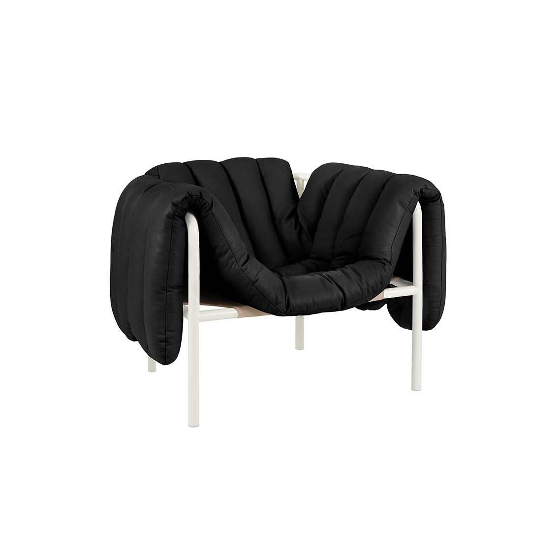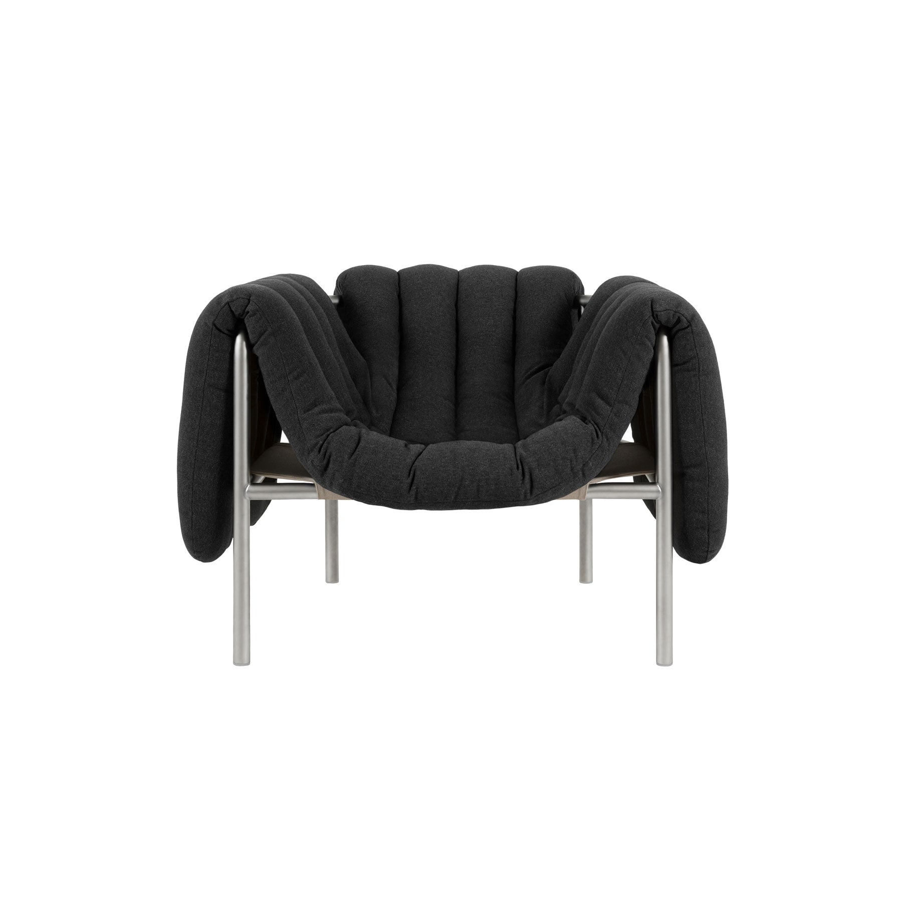 The detachable upholstery of the Puffy Lounge Chair is fat and plump, its generous shape spills freely over the sides of a tubular steel frame which, in stark contrast, is hard-lined and strong.