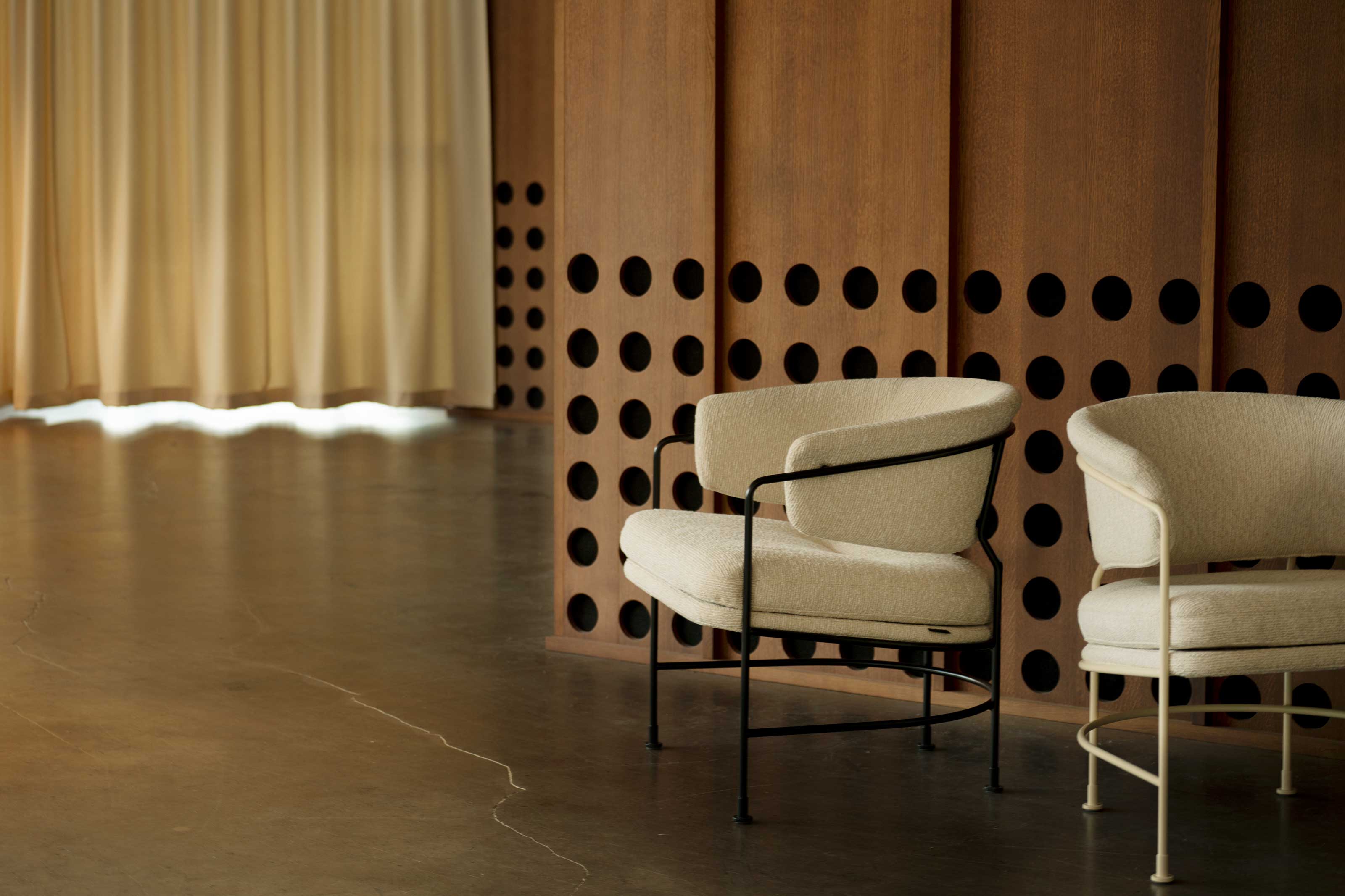 A study in balance. The Portrait Lounge Chair draws from Brutalist architecture, with squared arms and an arched back that cantilever over a timber base. Its proportions are generous but measured, offering presence without excess. Designed for both residential and commercial spaces, it holds its own.