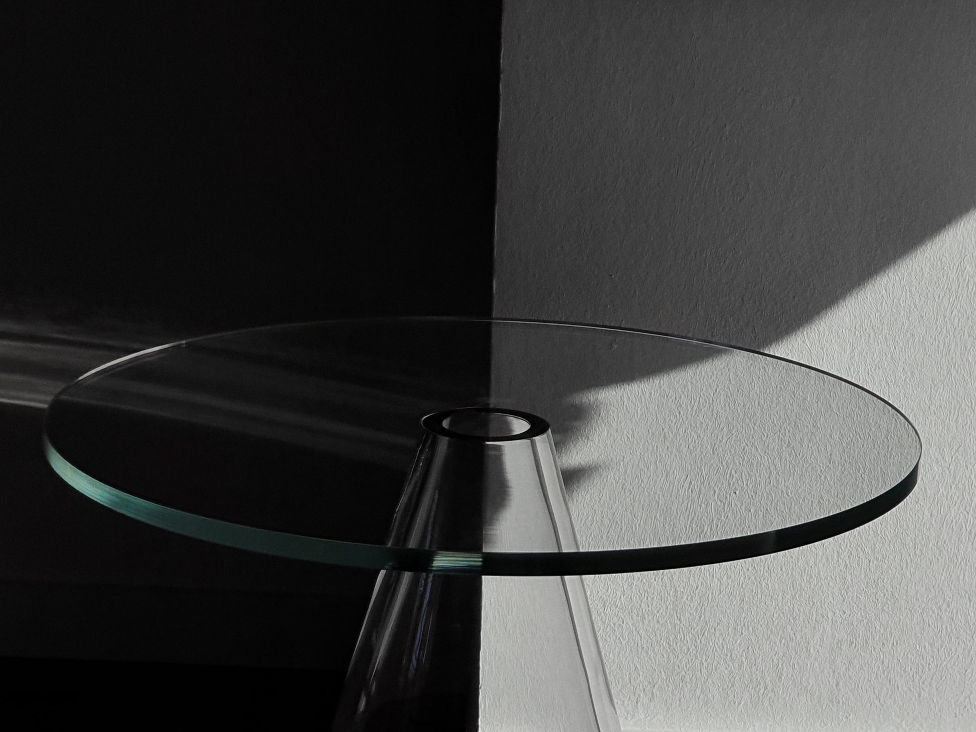 Sander Table by Massproductions. The manufacturing process of joining the mouth-blown conical base with the round tempered glass top using a special UV-cured adhesive, making the join seamless & stronger than the glass itself.