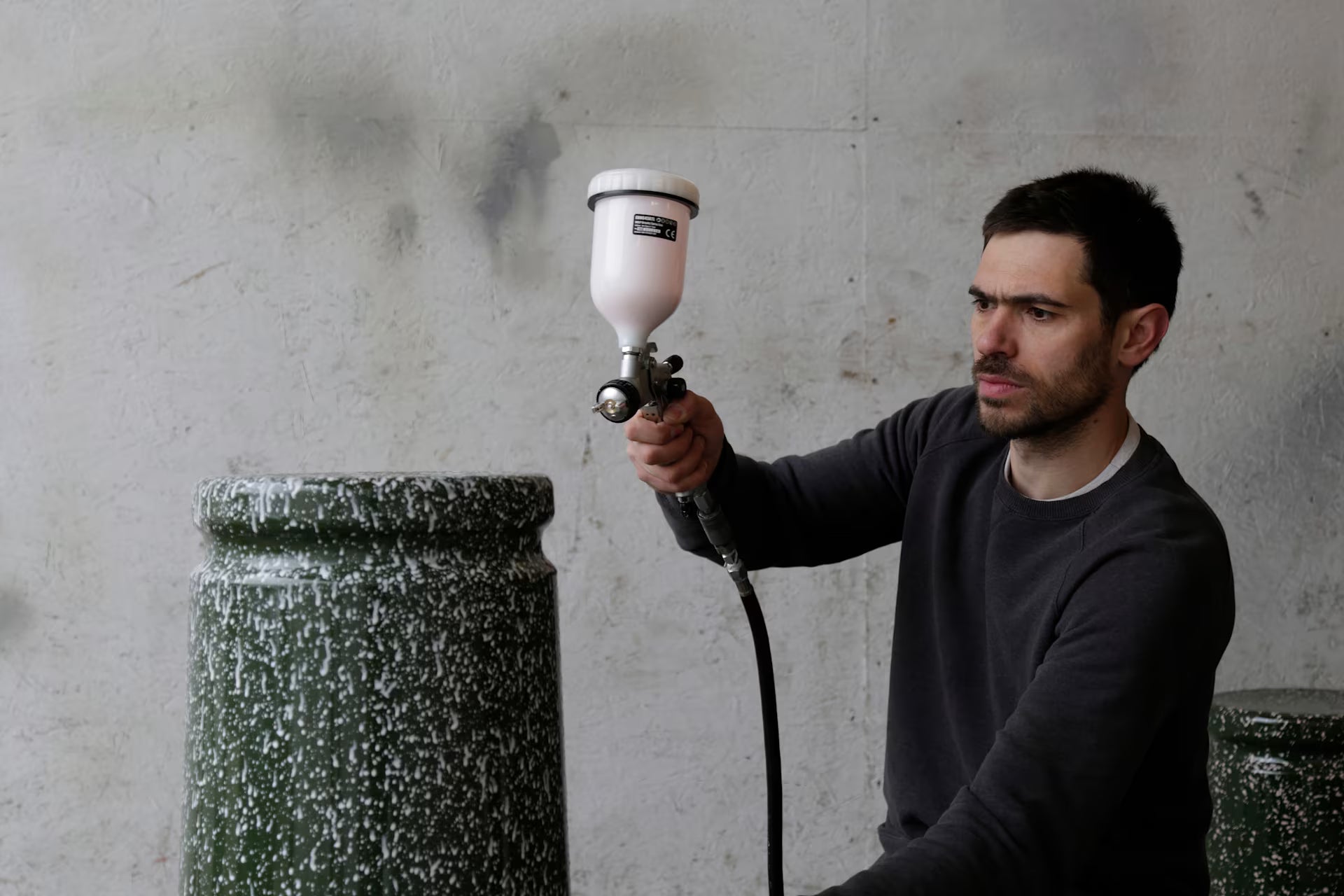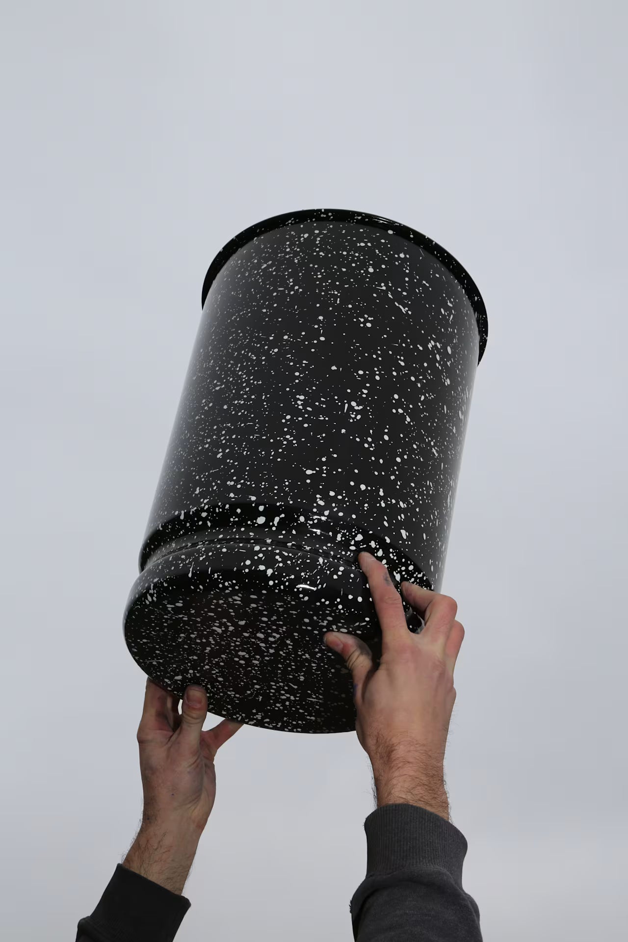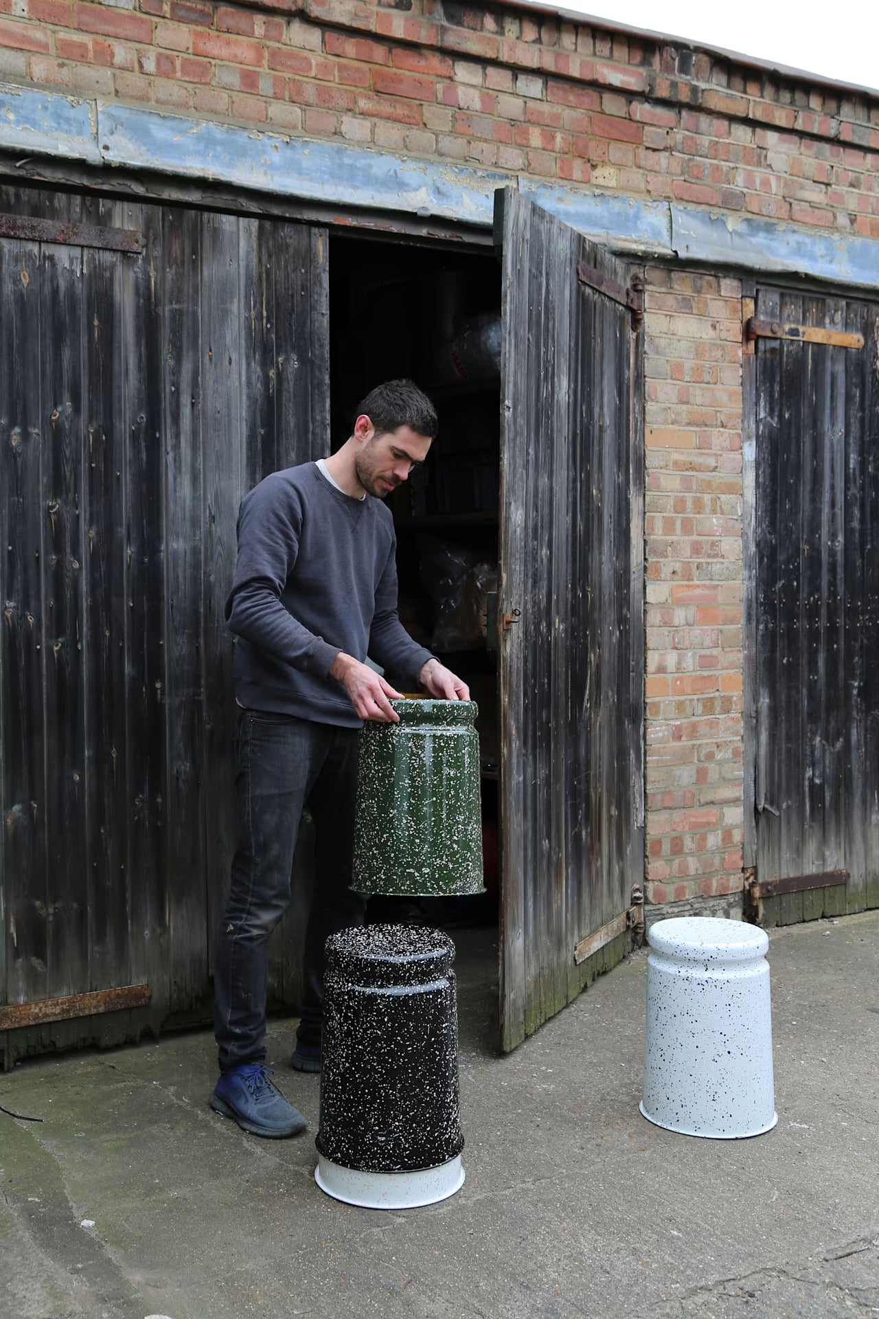 The Last Stool Splatter is hand-painted, then fired at 800 degrees Celsius to get a perfect enamel finish.