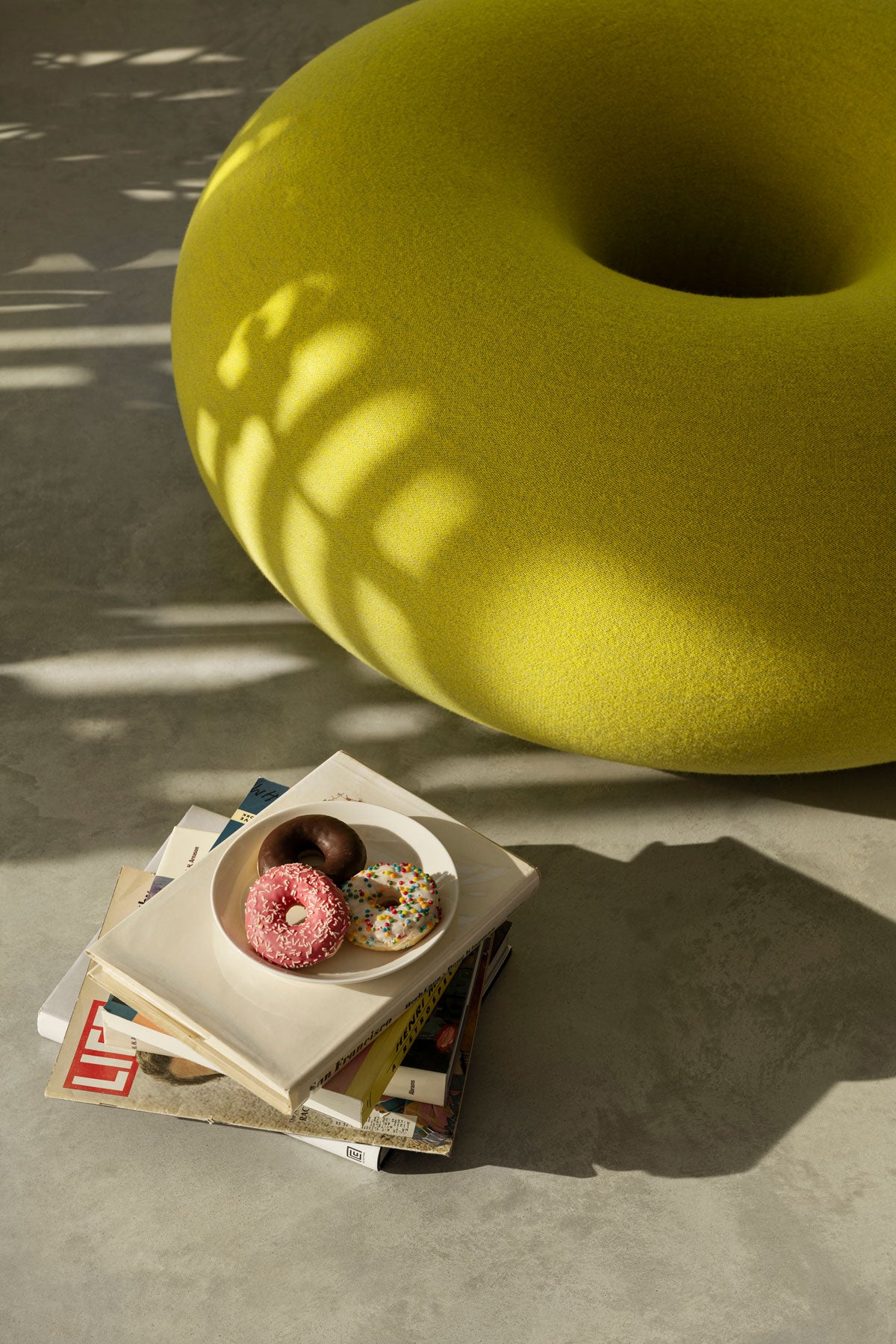 The donut-shaped Boa Pouf by Sabine Marcelis is perfectly sculptural; a bold graphic form that interrupts interior landscapes with its faultless chunky geometry.