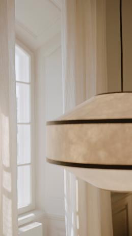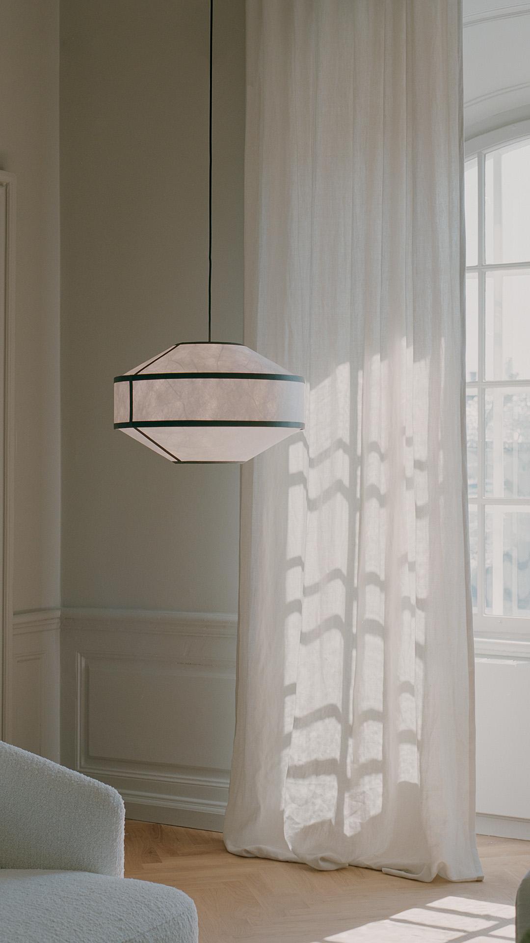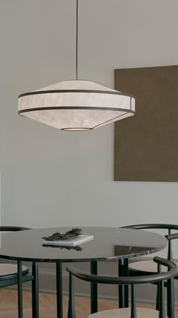 The same structural elements are adapted into three different sizes, each echoing the other like a tale that alters subtly with each retelling. Delicate taping contours the silhouettes, a technical refinement that enriches depth and contrast. Whether displayed together or separately, the Kite Pendant Lamps serve as a luminous sculptural element.