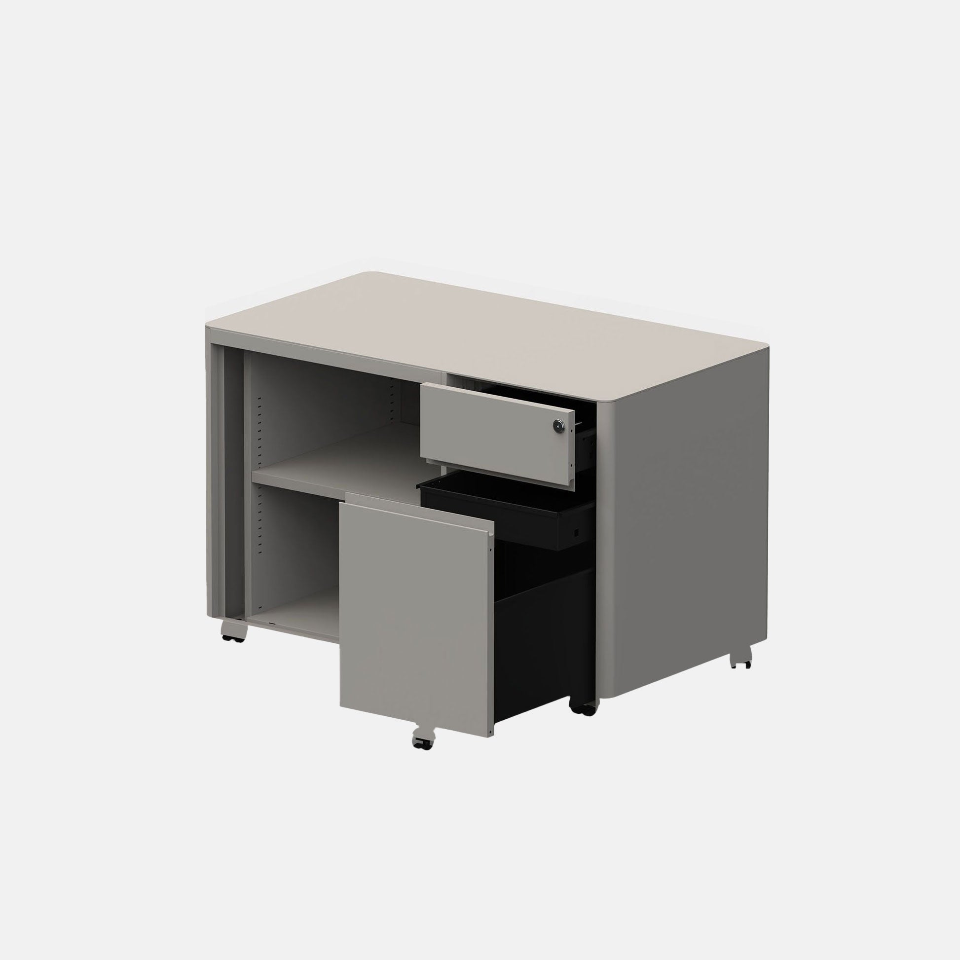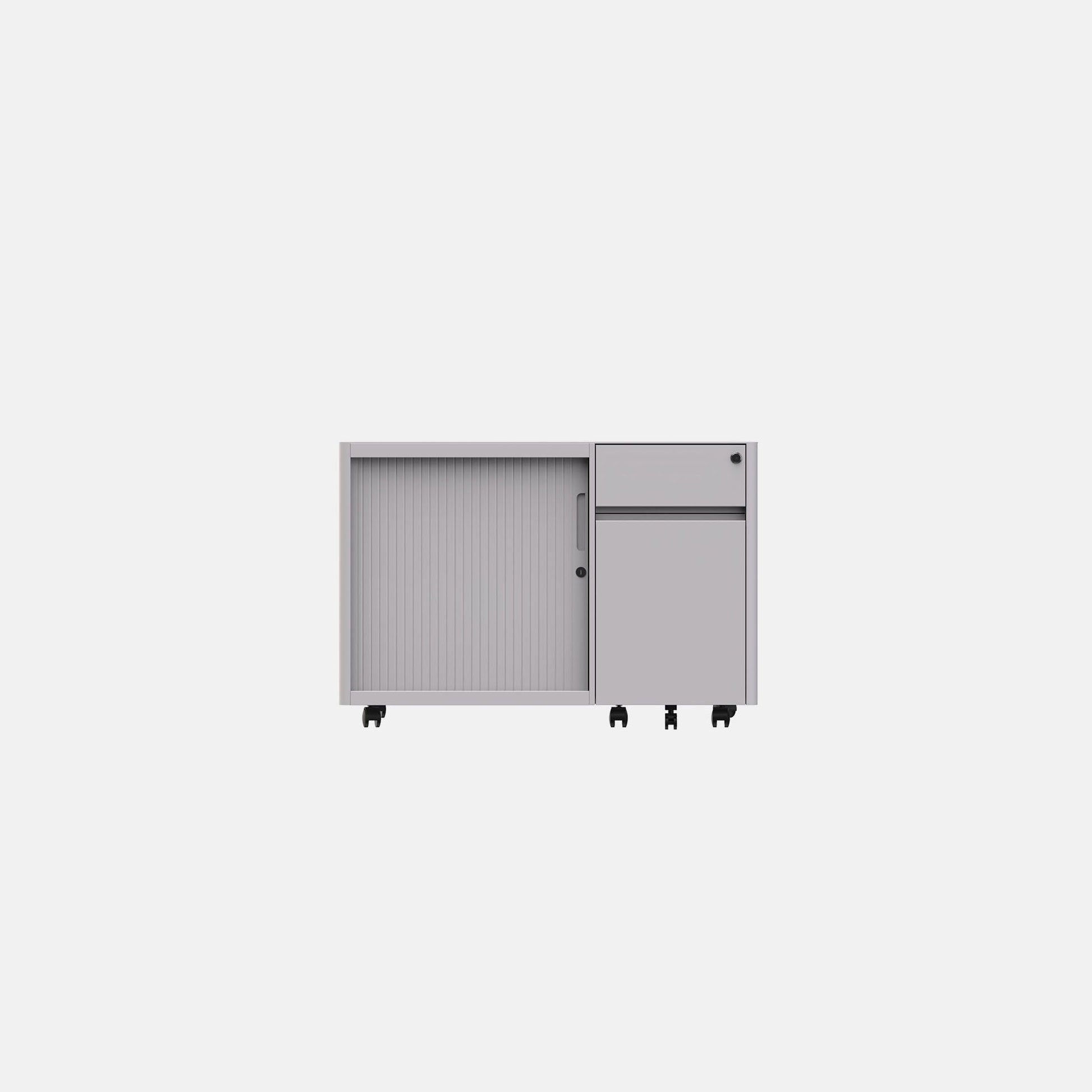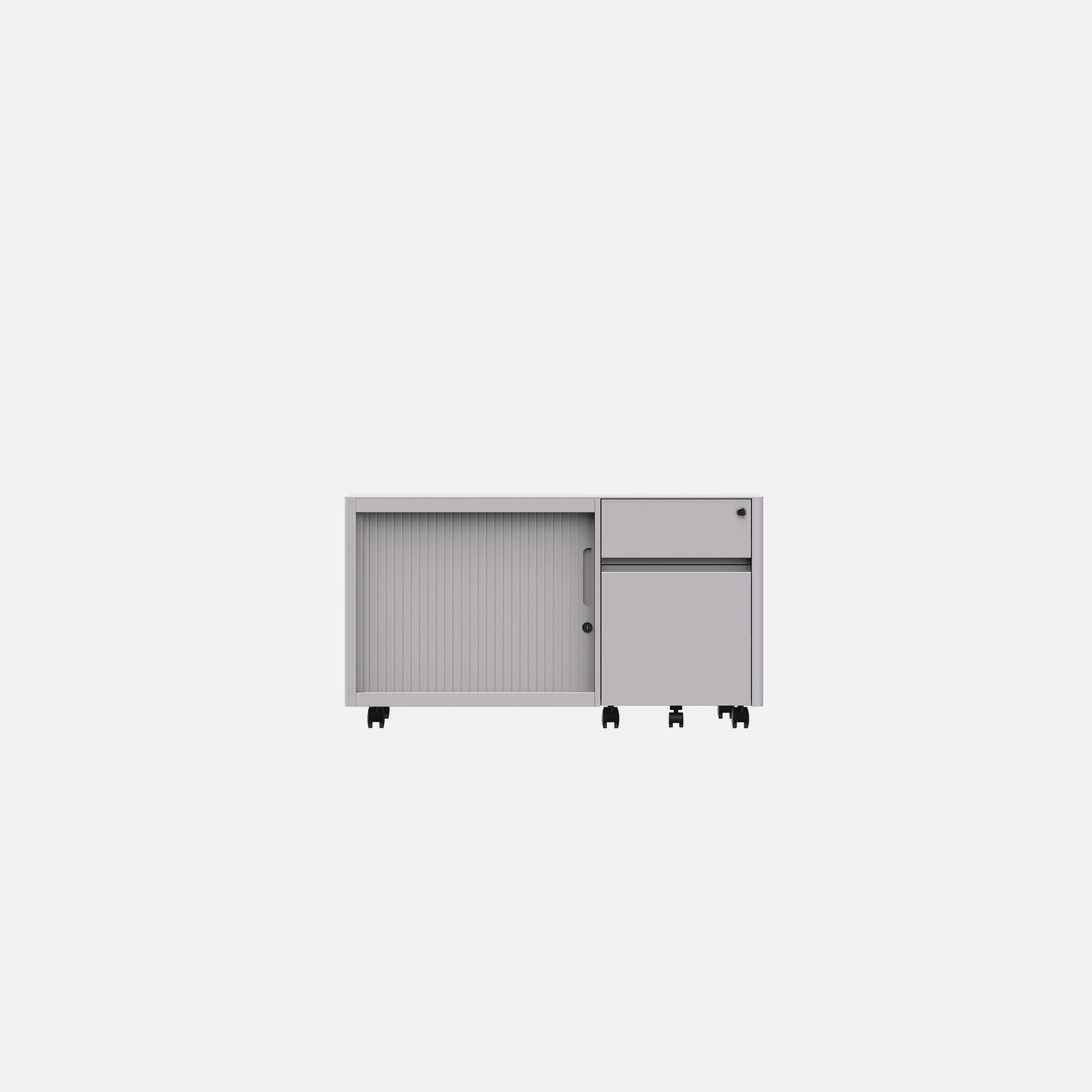 Soft caddy, a blend of tambour and pedestal, shaping a mobile storage unit with more capacity. The combination of shelves and drawers can fulfil individual office requirements whilst being ready to move in a flexible workspace.
