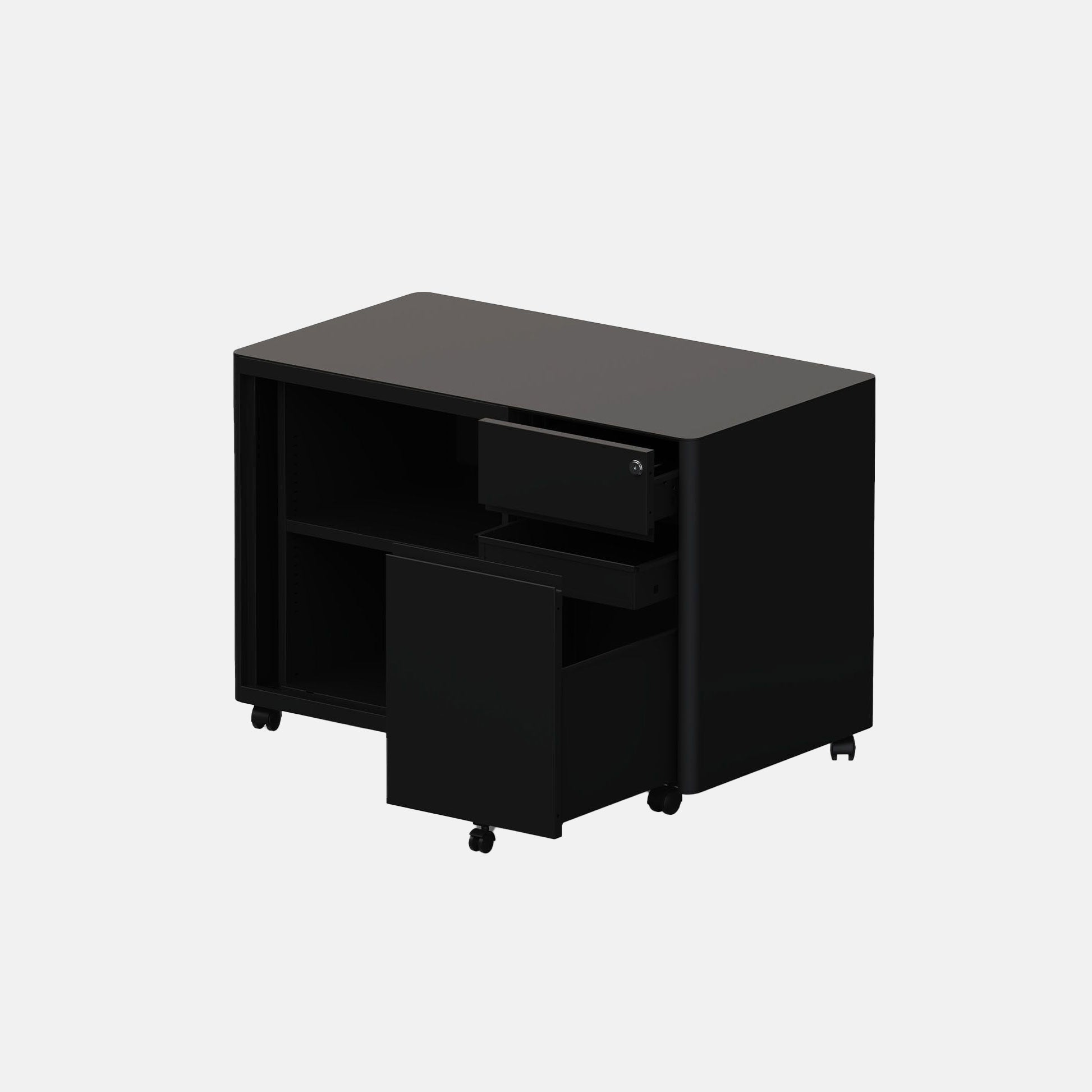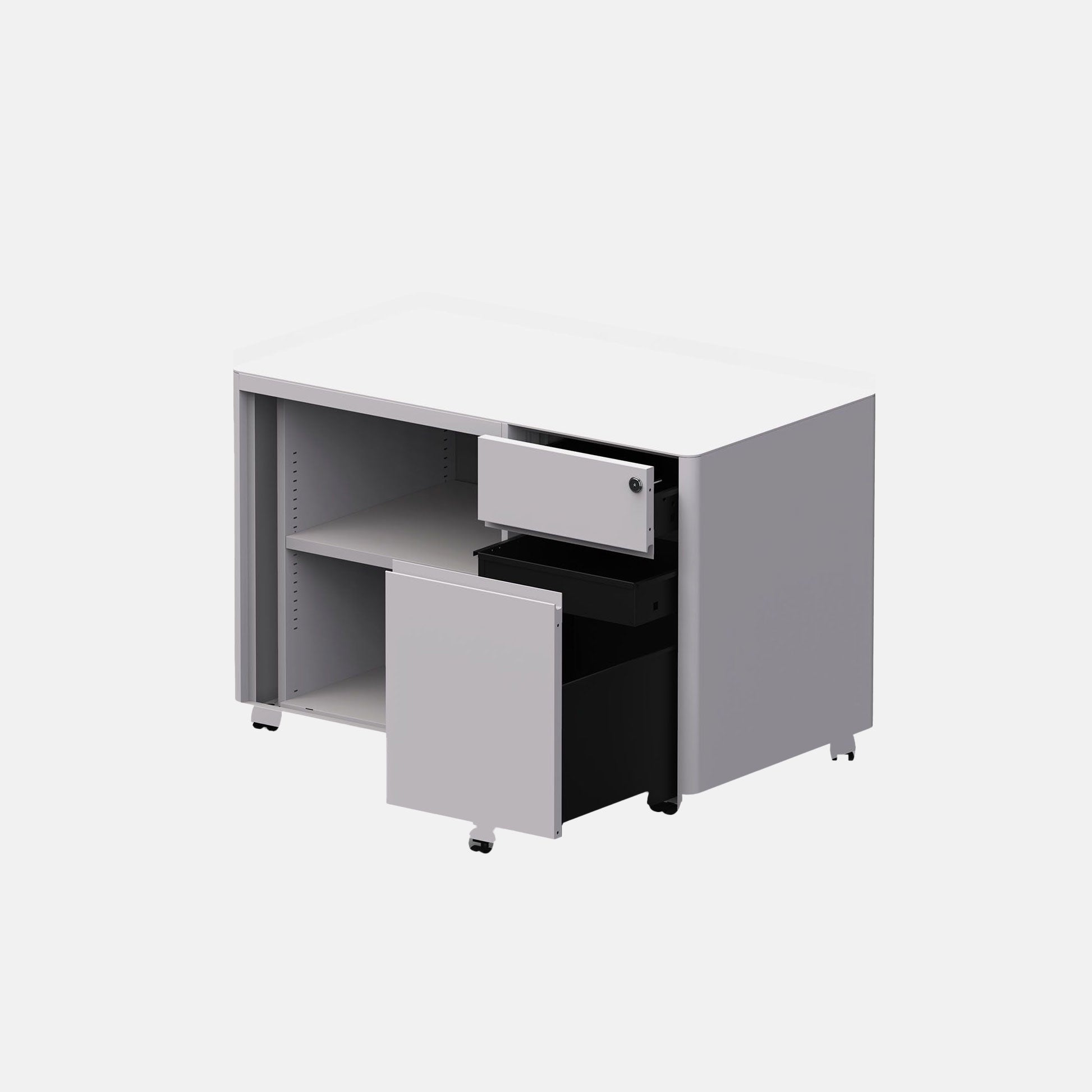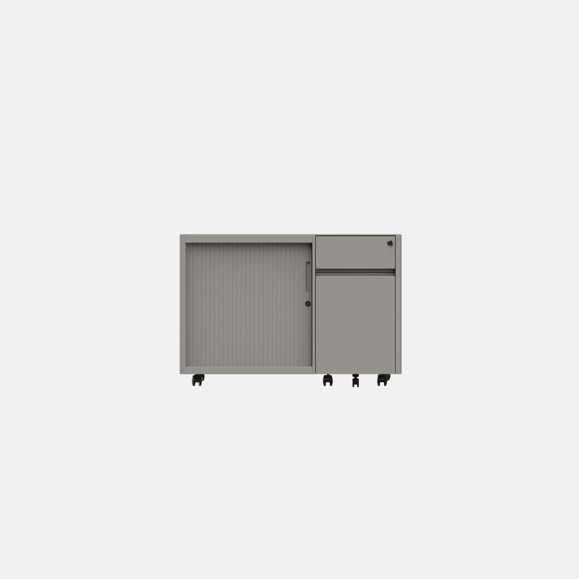 Soft caddy, a blend of tambour and pedestal, shaping a mobile storage unit with more capacity. The combination of shelves and drawers can fulfil individual office requirements whilst being ready to move in a flexible workspace.