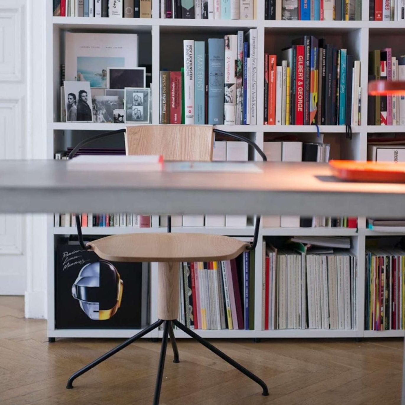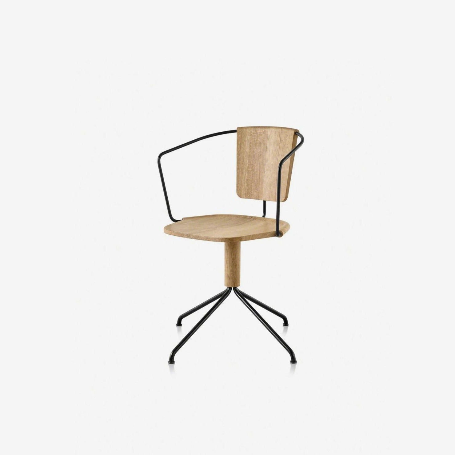 It is a family of wooden task chairs with two different backrests and a four-star swivel base. The gently carved wooden pieces are held in place by bent metal rods - while wood remains the main actor, the metal parts play a fundamental role in the construction. The metal structure joins the pieces of wood in an almost organic overlap. The wood embraces the metal rods whose form subtlety appears on the wooden surface like a prominence.