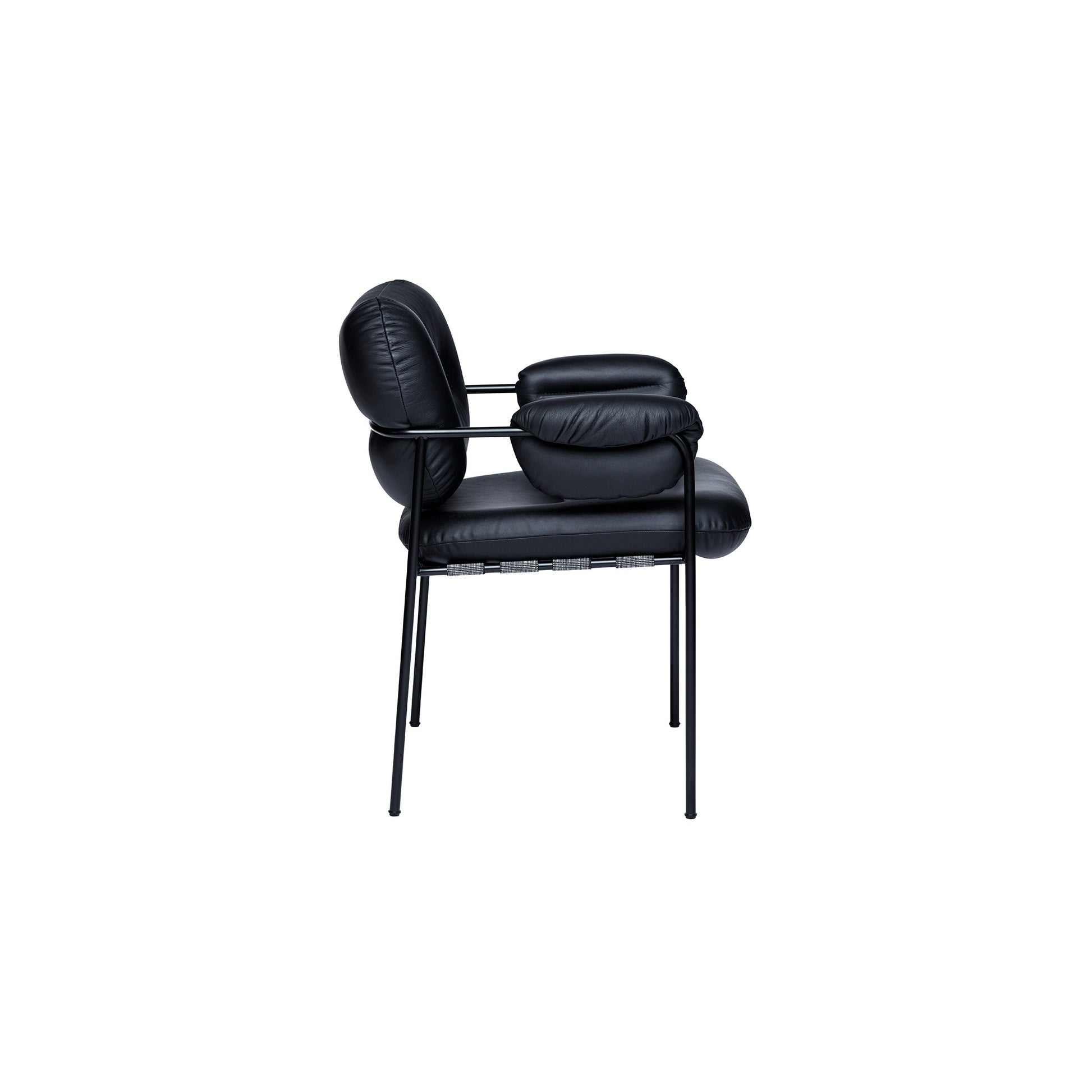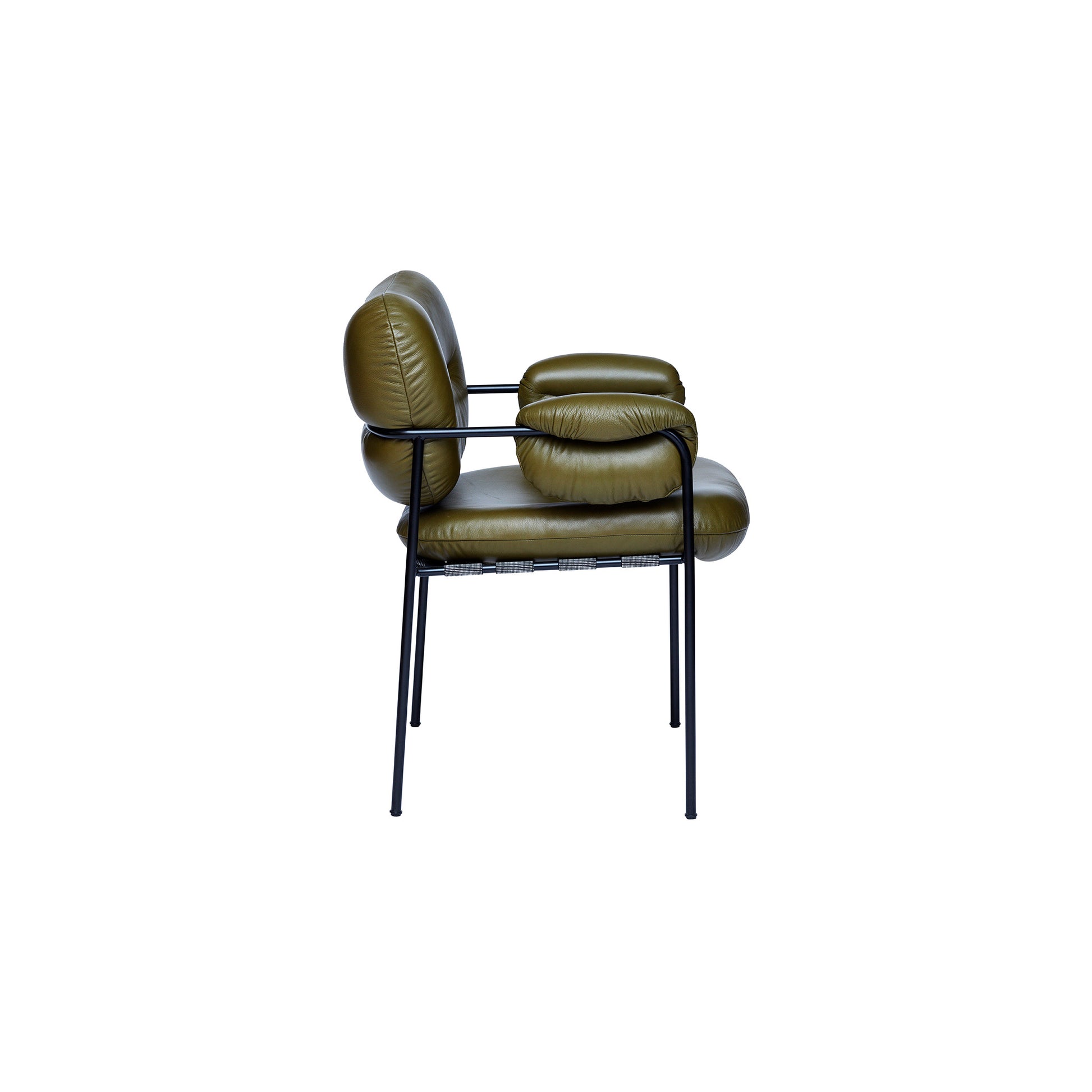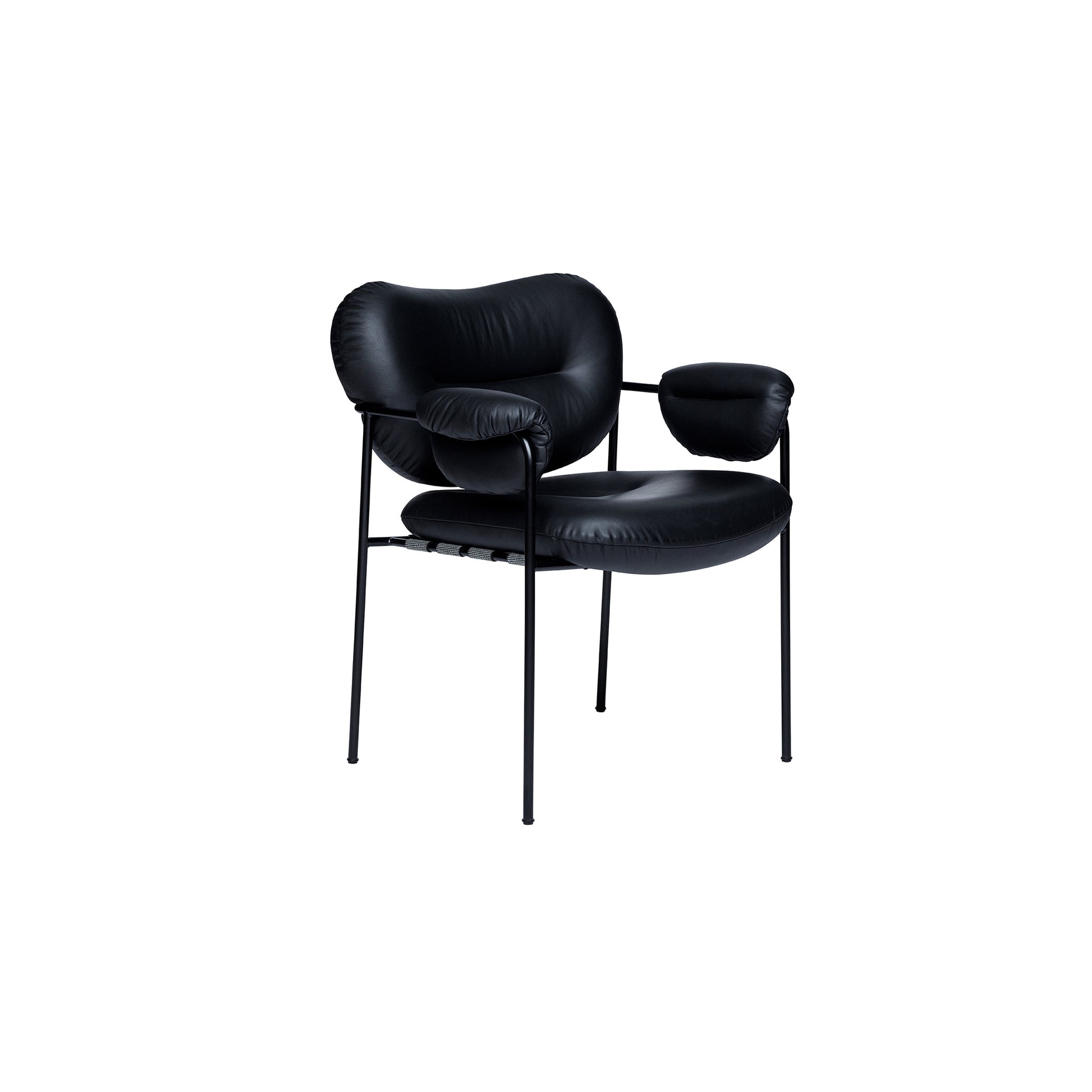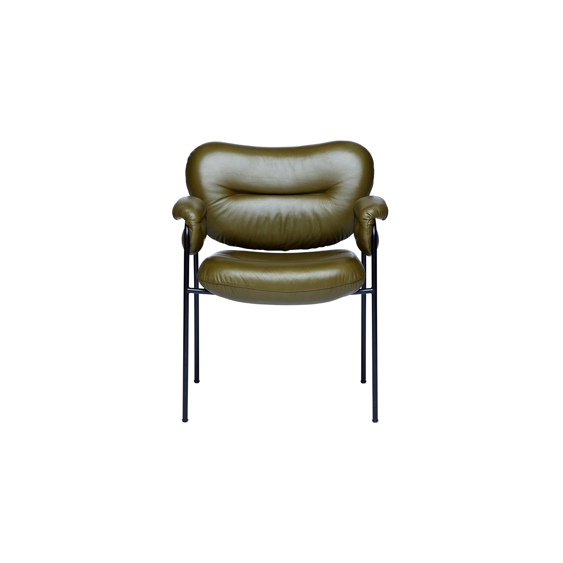 Like its sibling Bollo Lounge Chair, it is informed by mid-century lounge chairs with deep cushioning wrapped generously around a distinctive metal tubing frame. Its armrests and upright position make it ideal for dining.