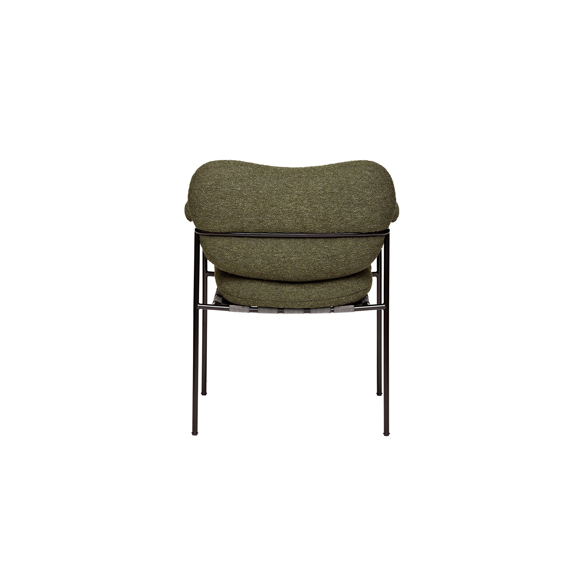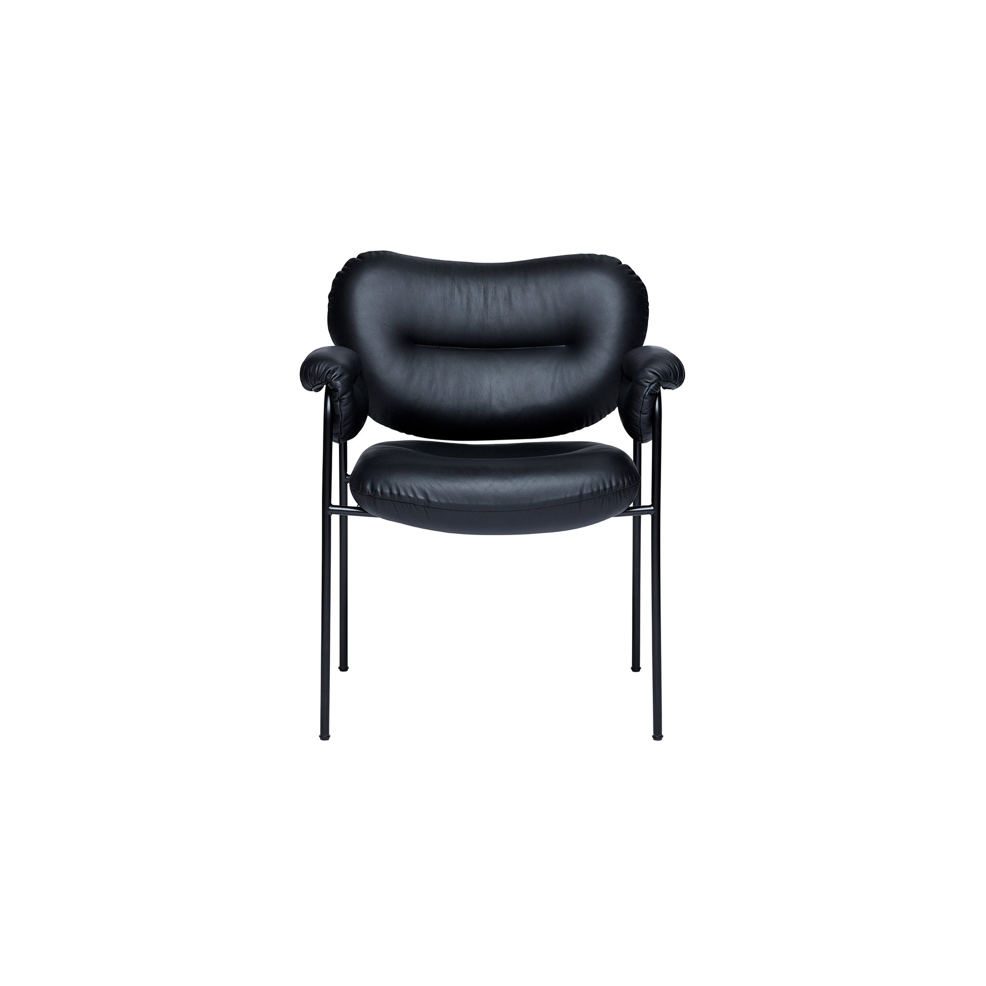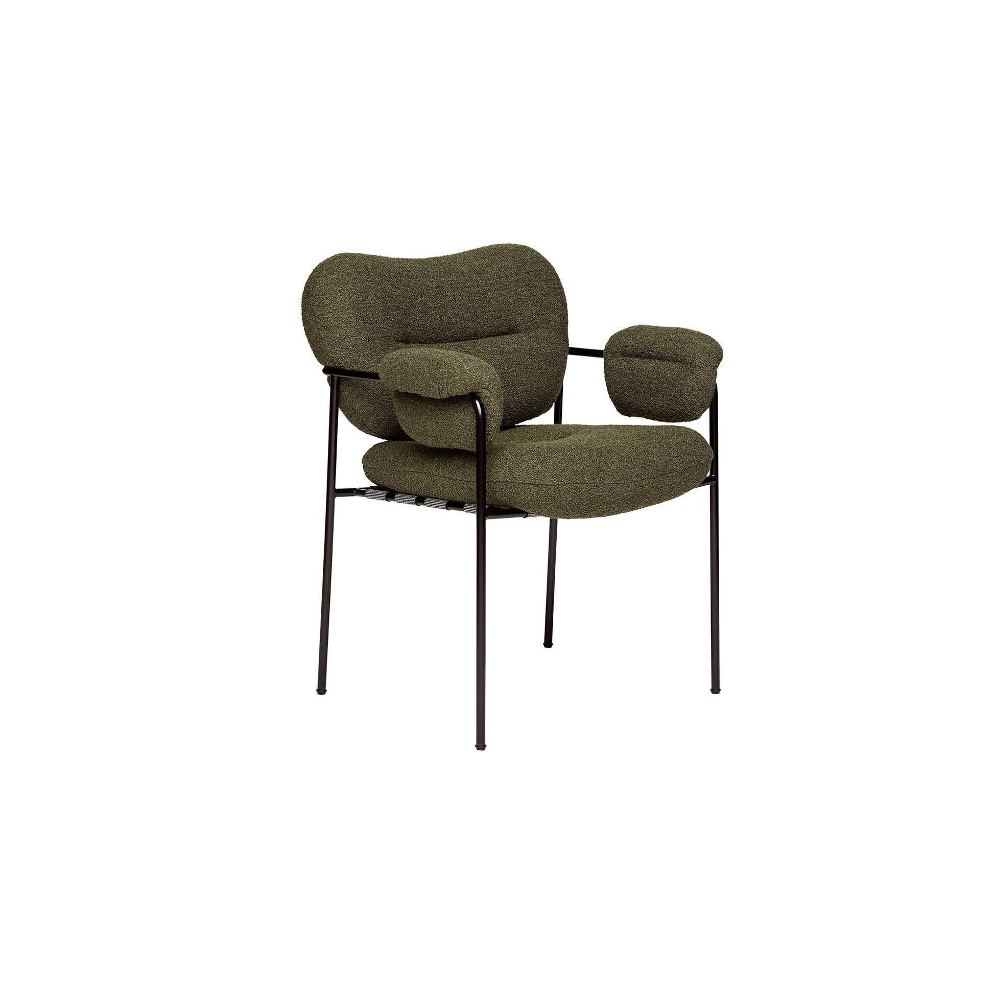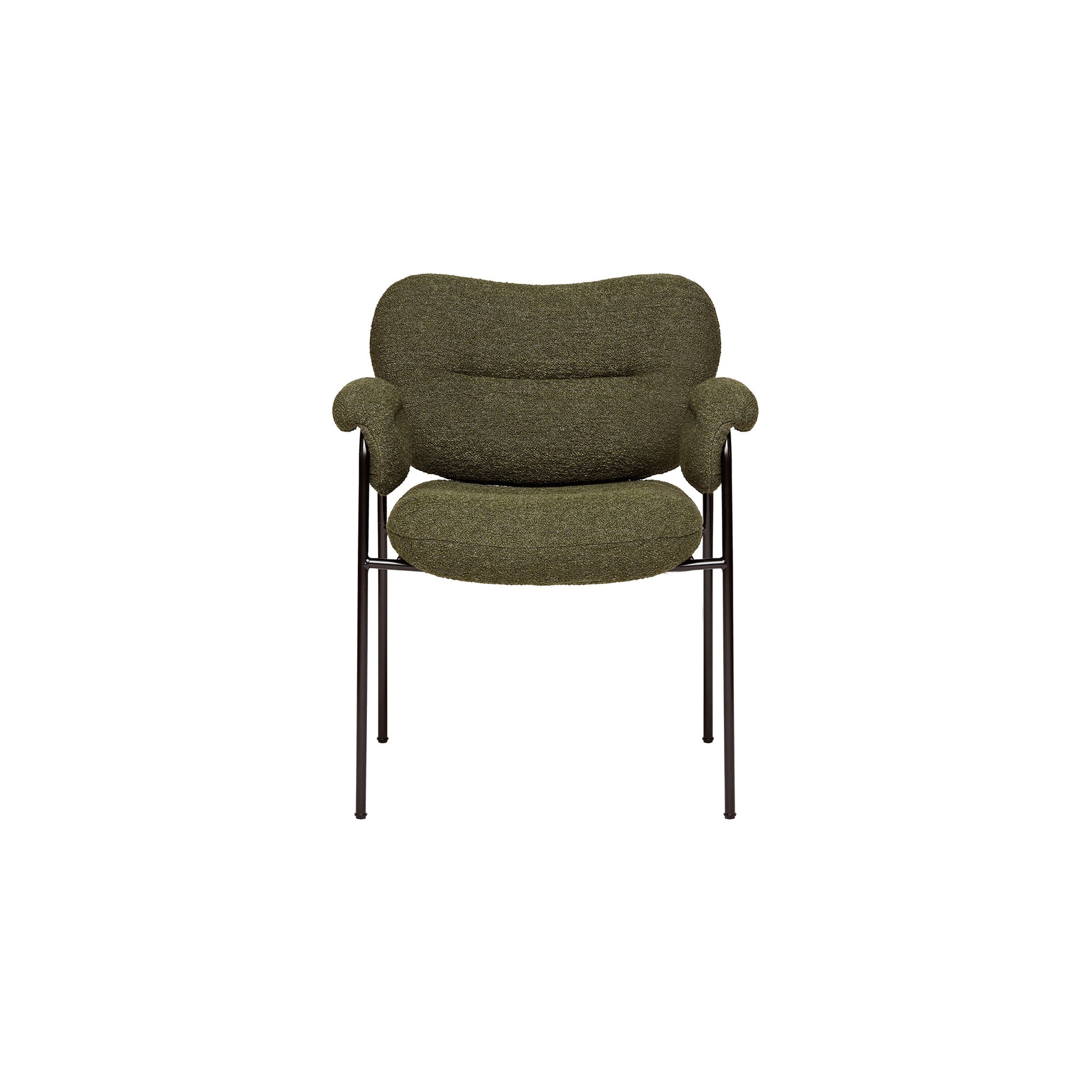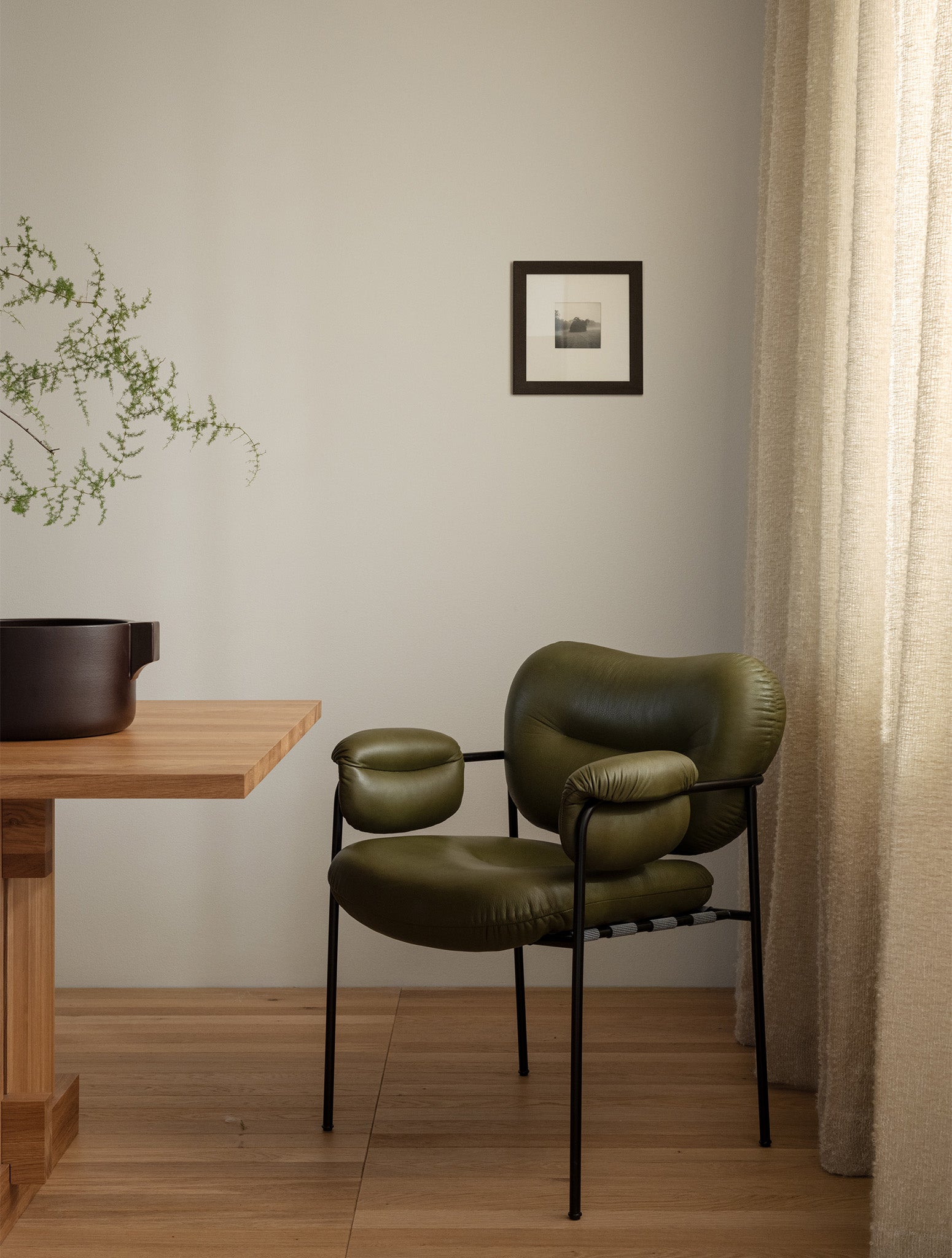Like its sibling Bollo Lounge Chair, it is informed by mid-century lounge chairs with deep cushioning wrapped generously around a distinctive metal tubing frame. Its armrests and upright position make it ideal for dining.