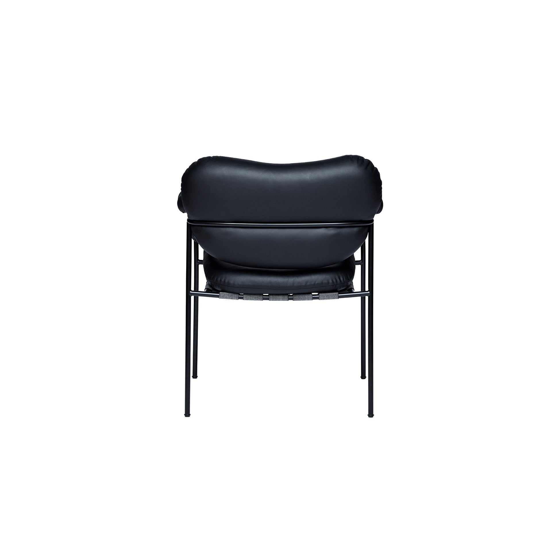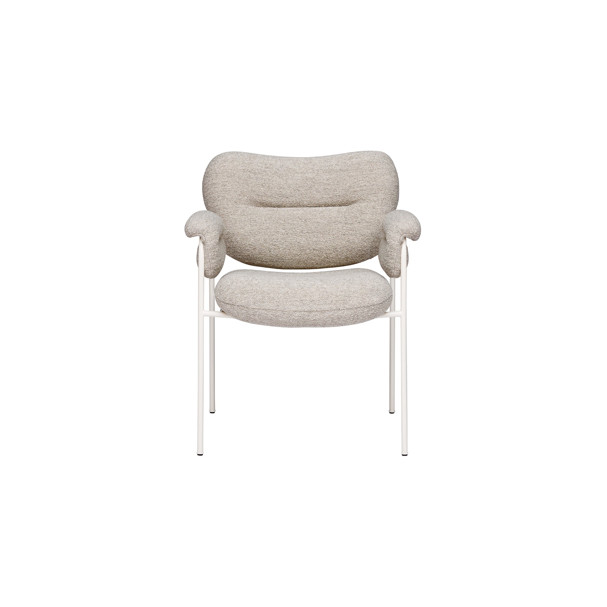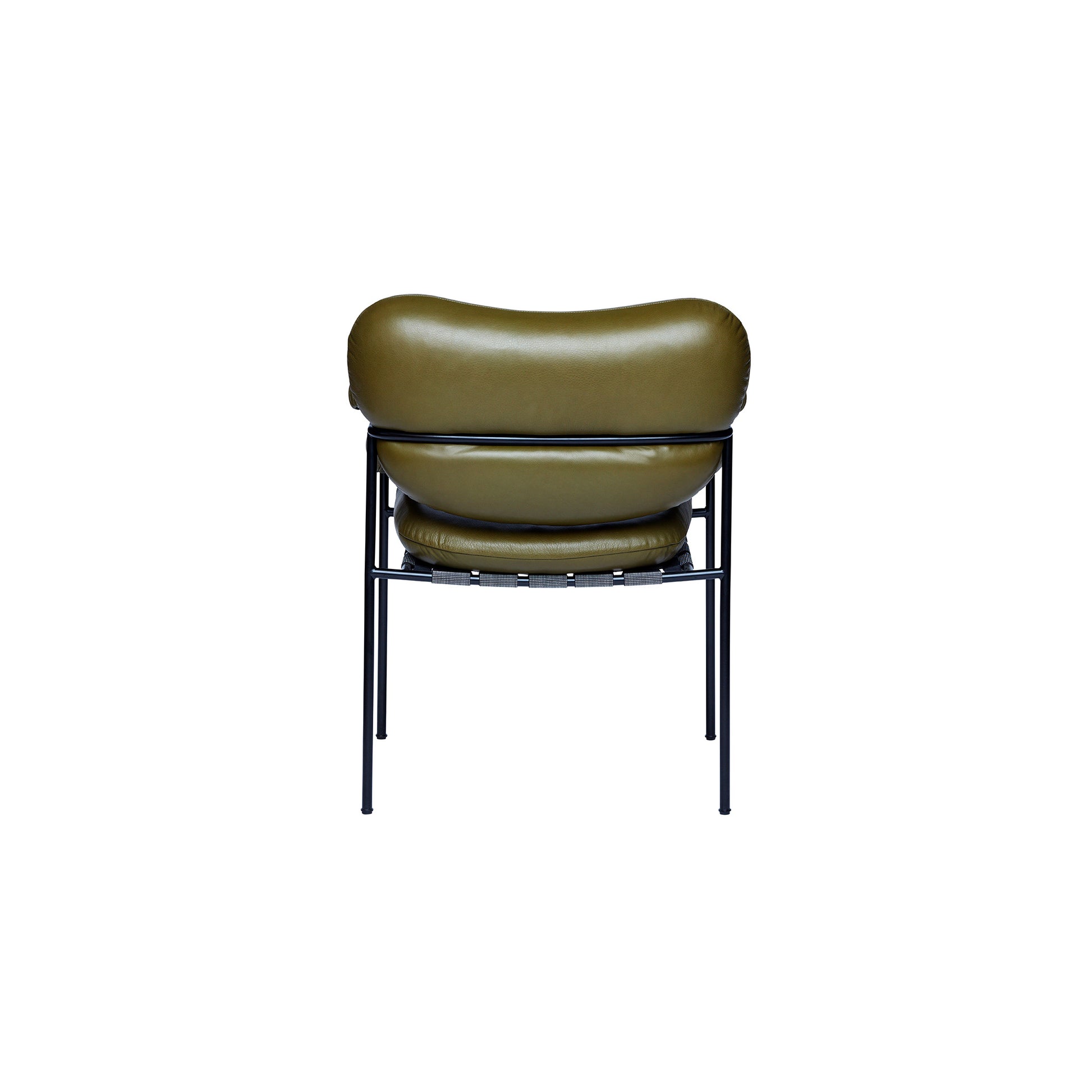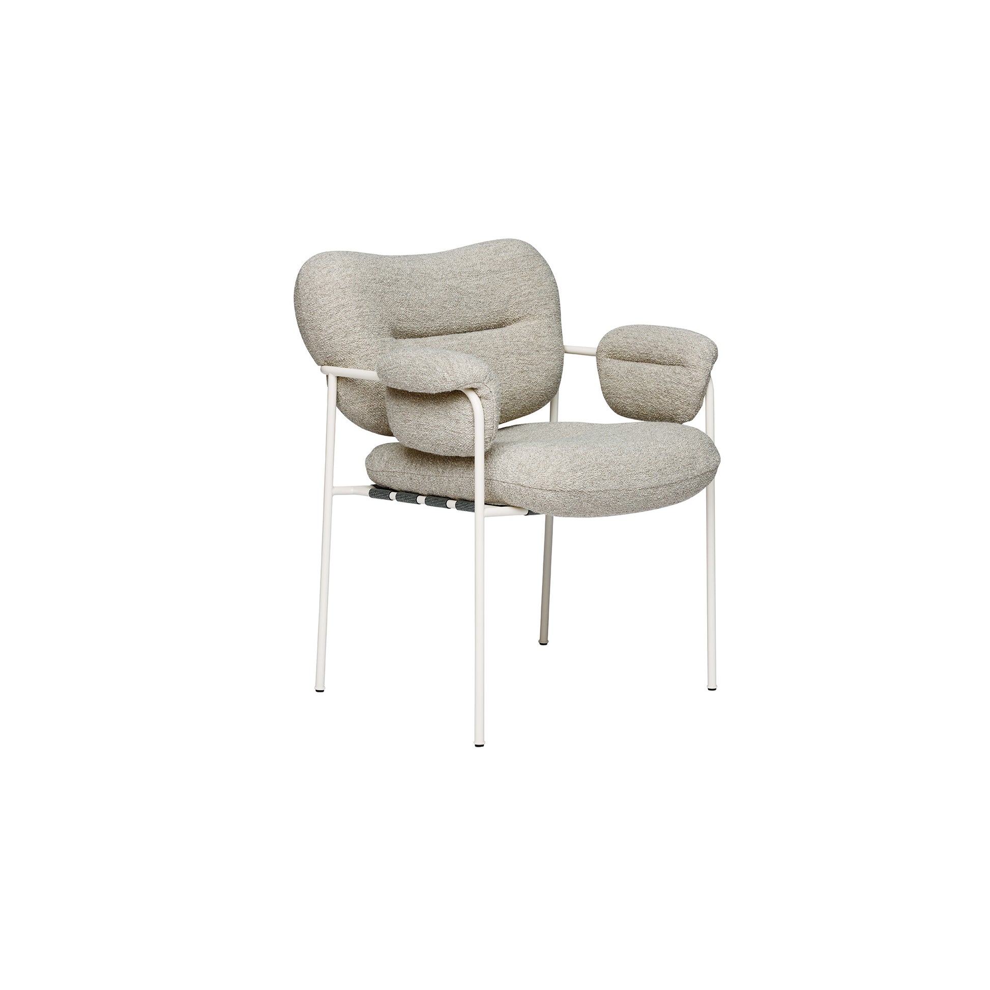 Like its sibling Bollo Lounge Chair, it is informed by mid-century lounge chairs with deep cushioning wrapped generously around a distinctive metal tubing frame. Its armrests and upright position make it ideal for dining.