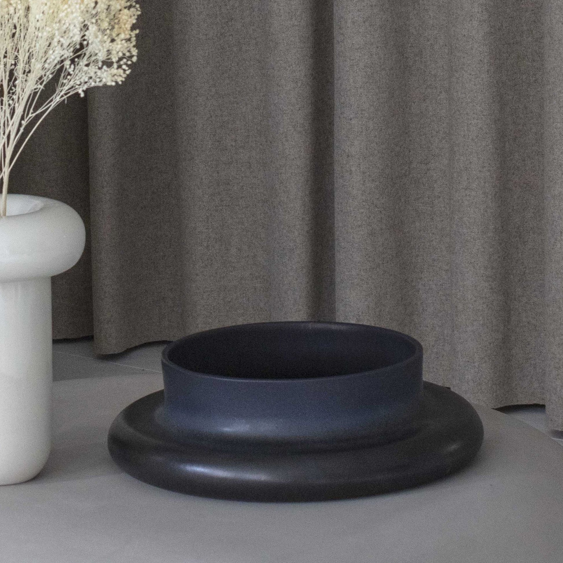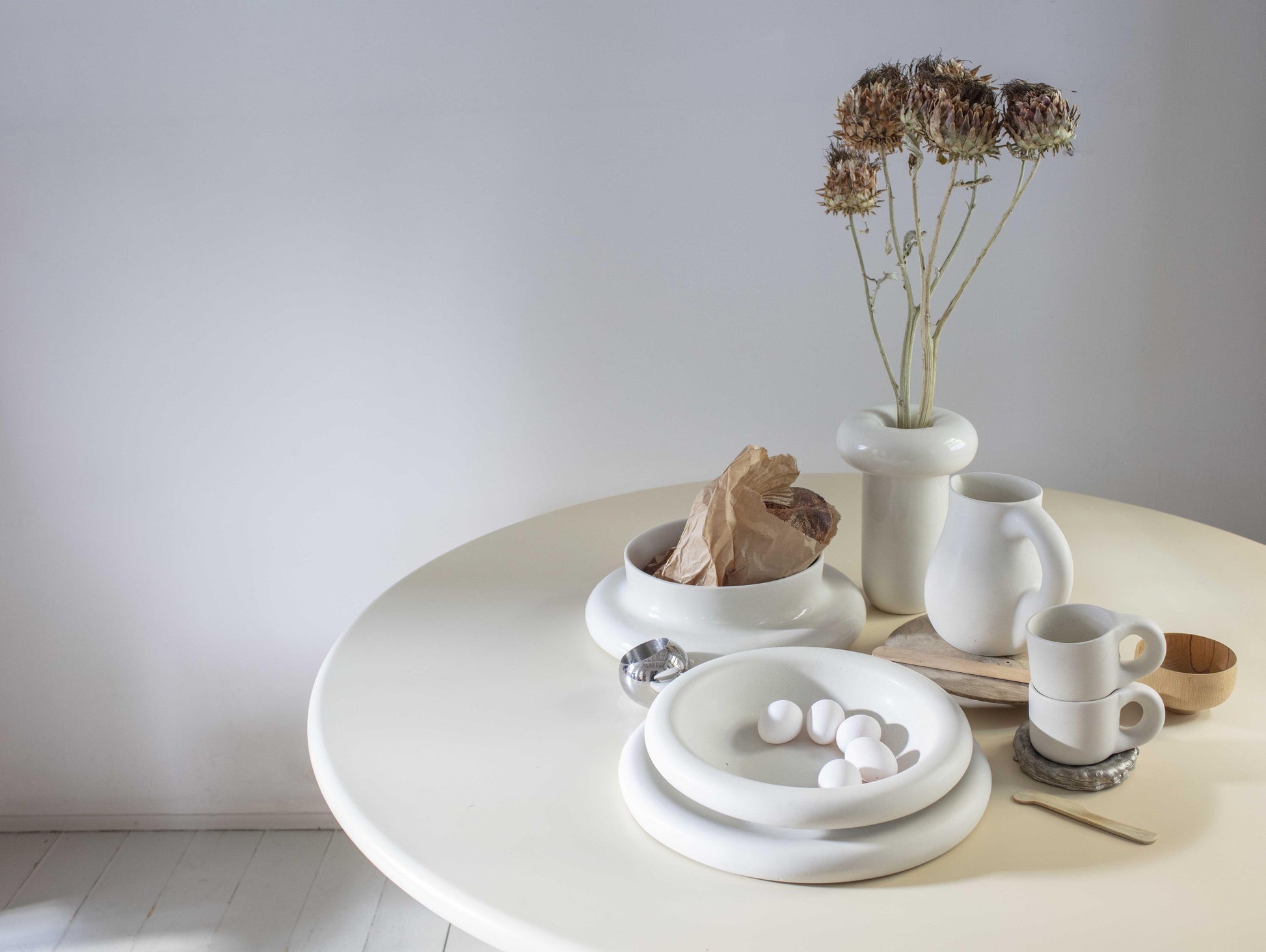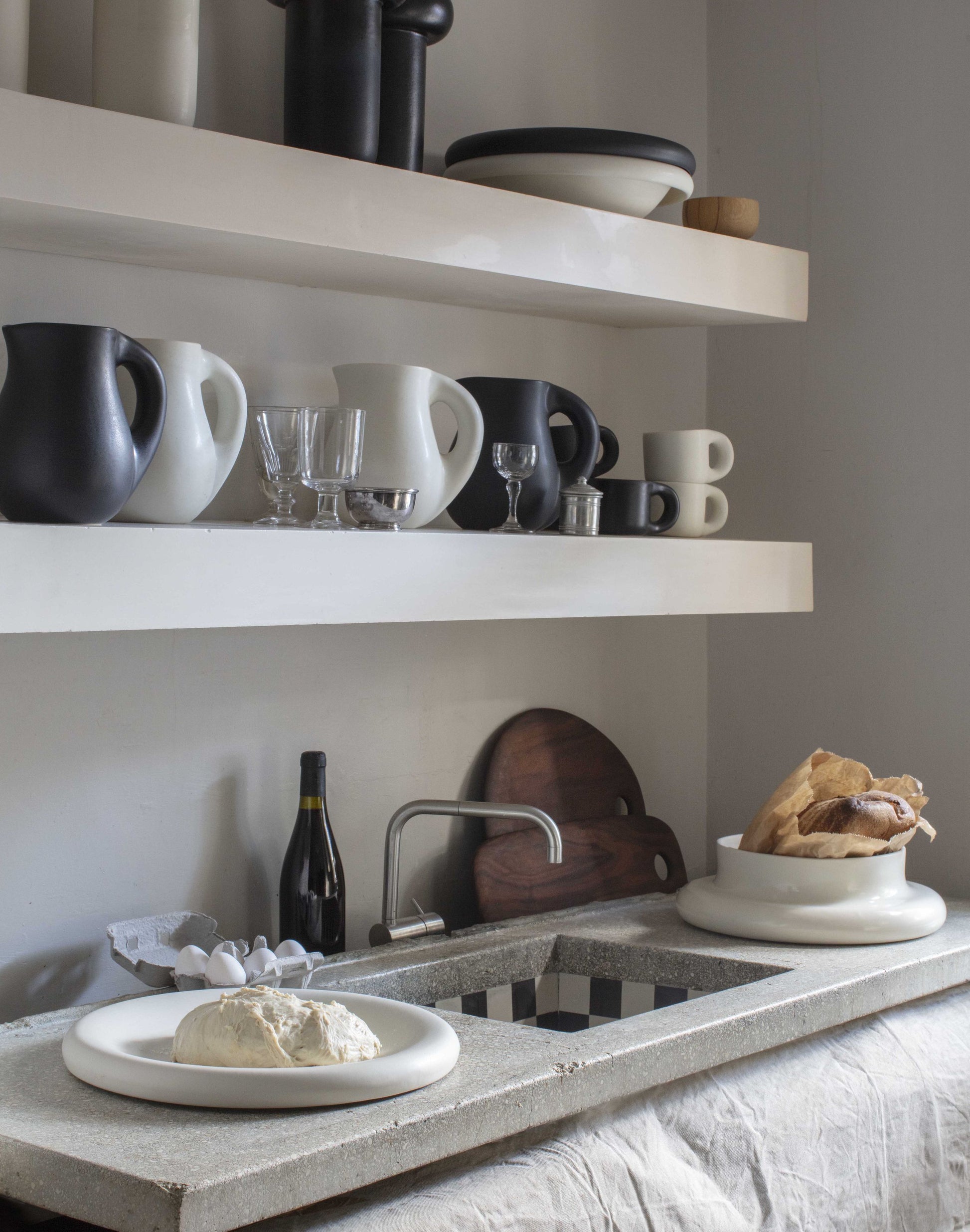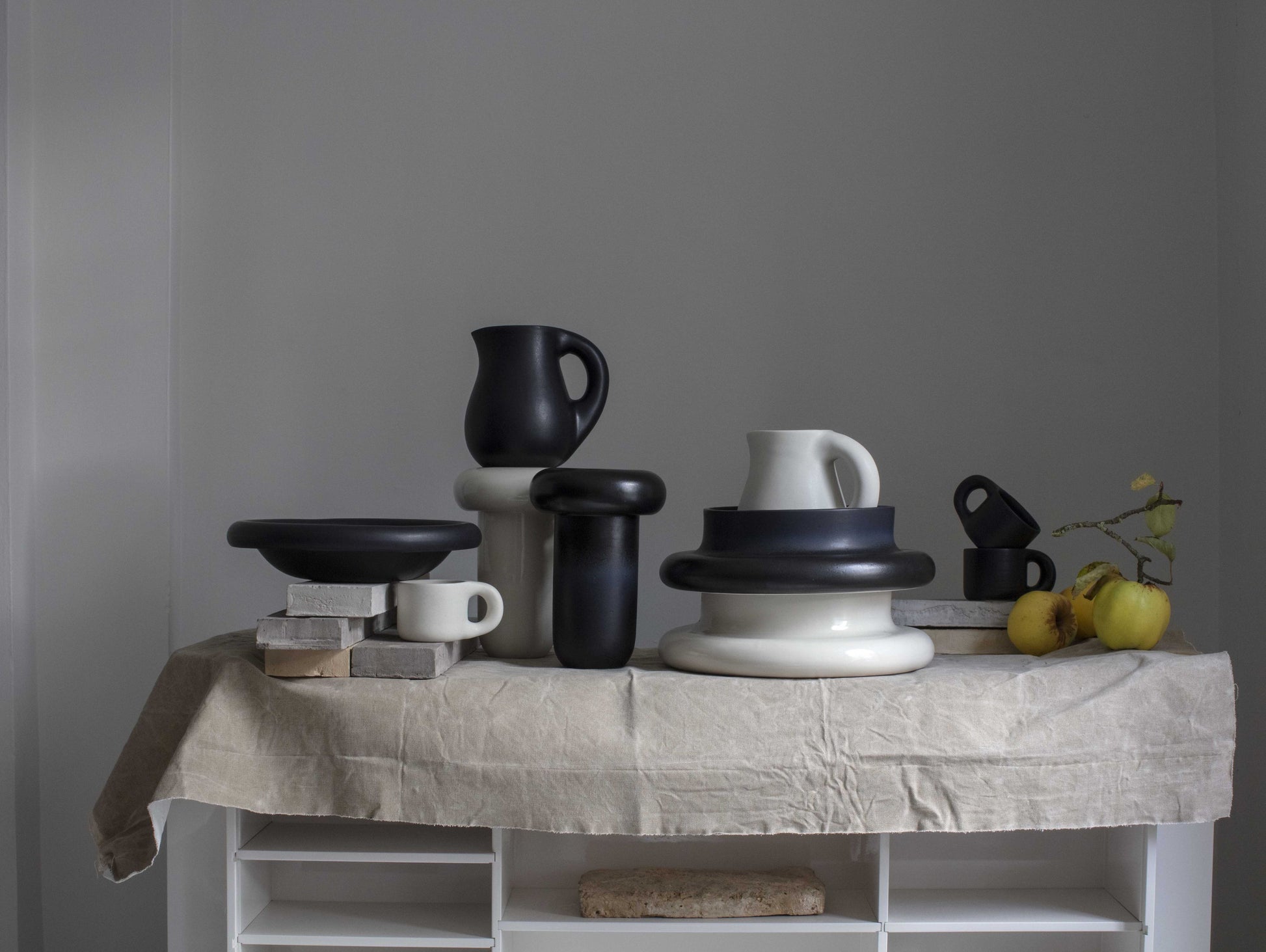 The Dough Ceramics range of six sculptural pieces - a mug, jug, bowl, platter, vase and centrepiece, is available in cream and charcoal matt glazes.