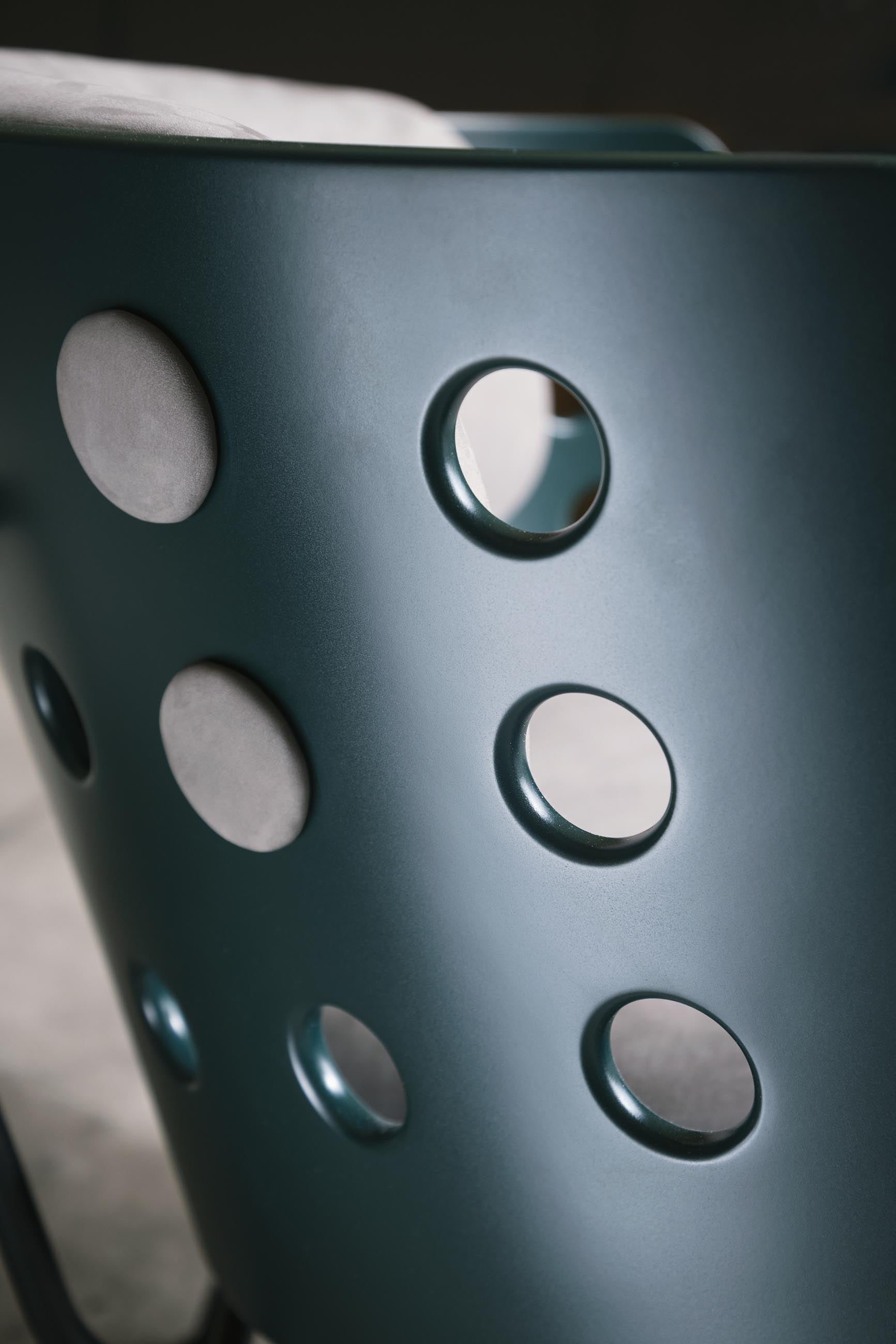A linear metal structure, running from the legs up to support the back, stands as a distinctive element of the design. Two enveloping shells for the seat and the backrest echo of a timeless elegance, while their pattern made by circular holes adds a modern architectural flare, functioning also as a grid where to attach additional paddings.