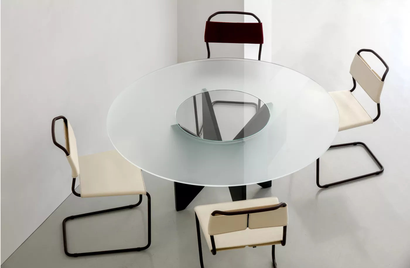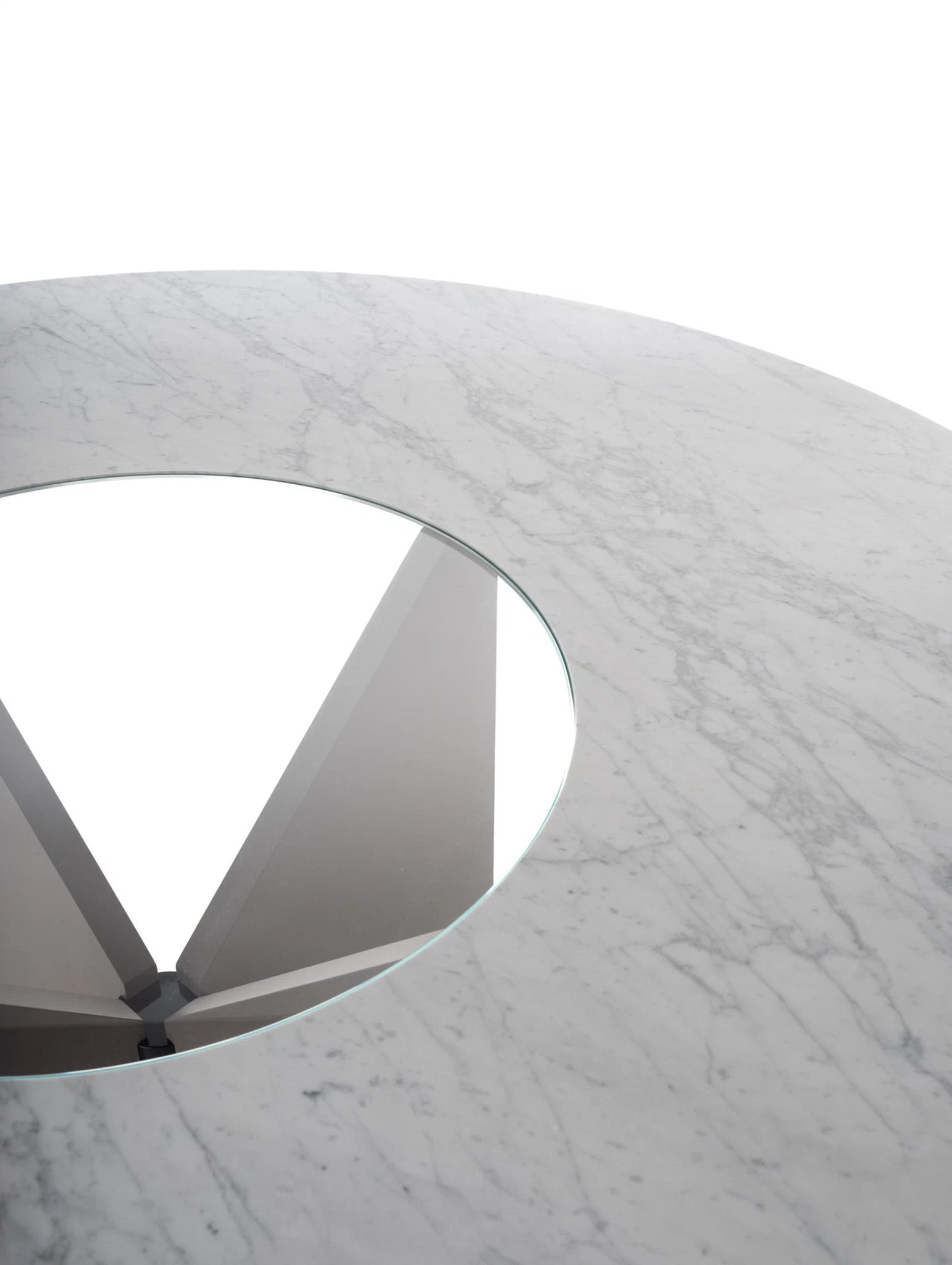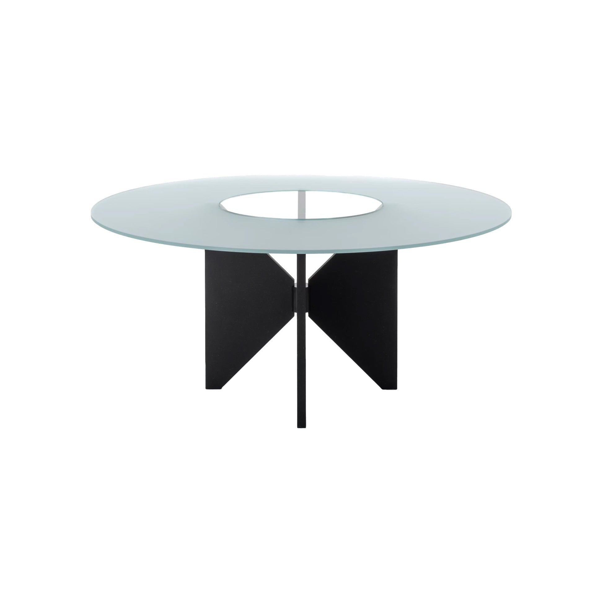 The table and coffee table system is characterised by an architectural design in an artful interplay of solids and voids that gives the product lightness and visual dynamism. The solid central base characterises the entire collection: four mass-coloured MDF elements are anchored to a shiny black powder-coated steel cylinder. The result is a sculptural structure, characteristic of Botta's architectural language, on which the table tops rest, available in various sizes and finishes.