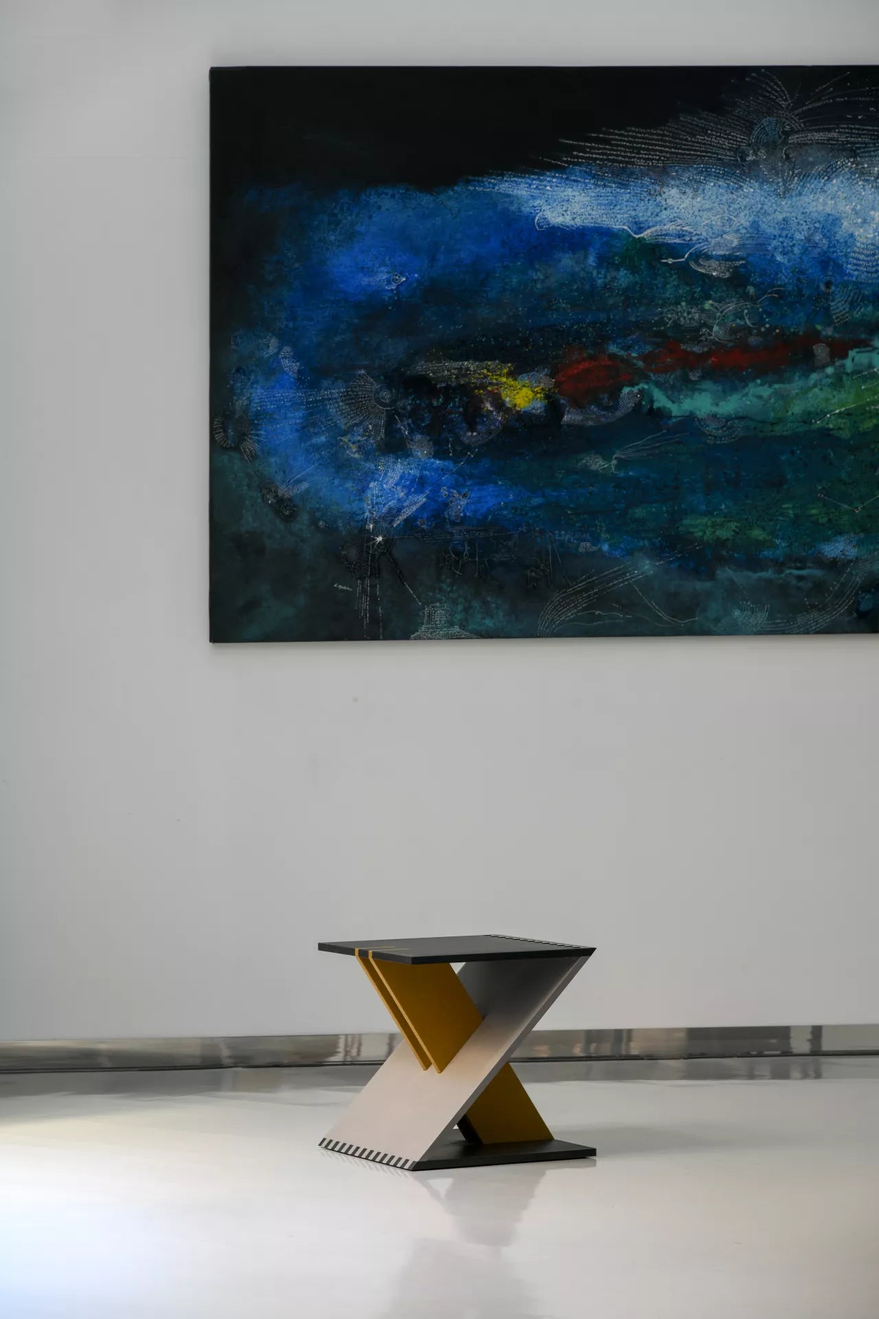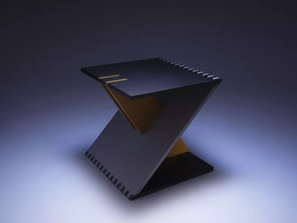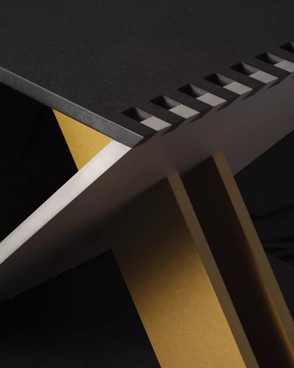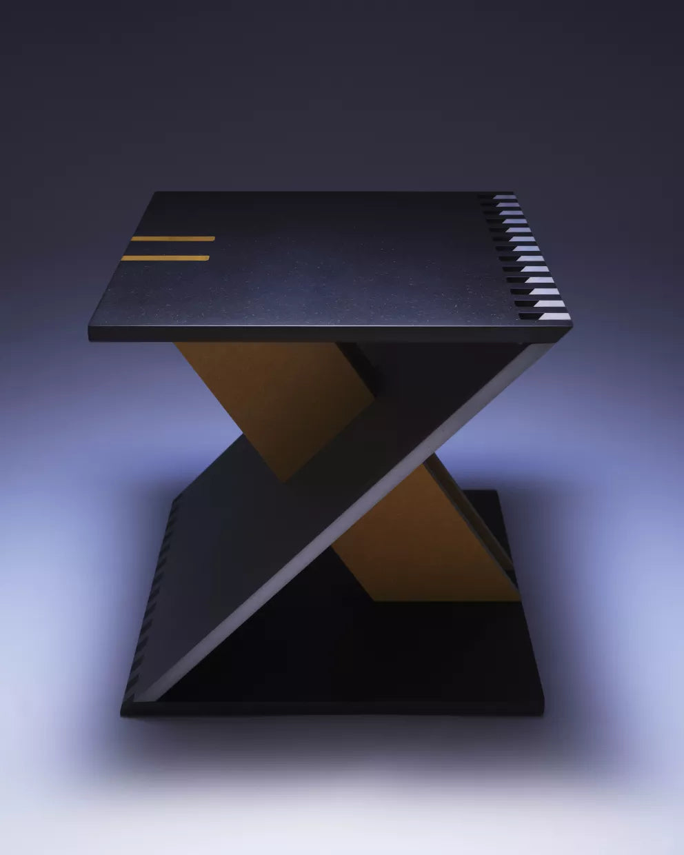 The Zeta stool recalls the letter from which it takes its name: two square elements, serving as base and seat, are joined by a diagonal element secured by a comb joint at each end.