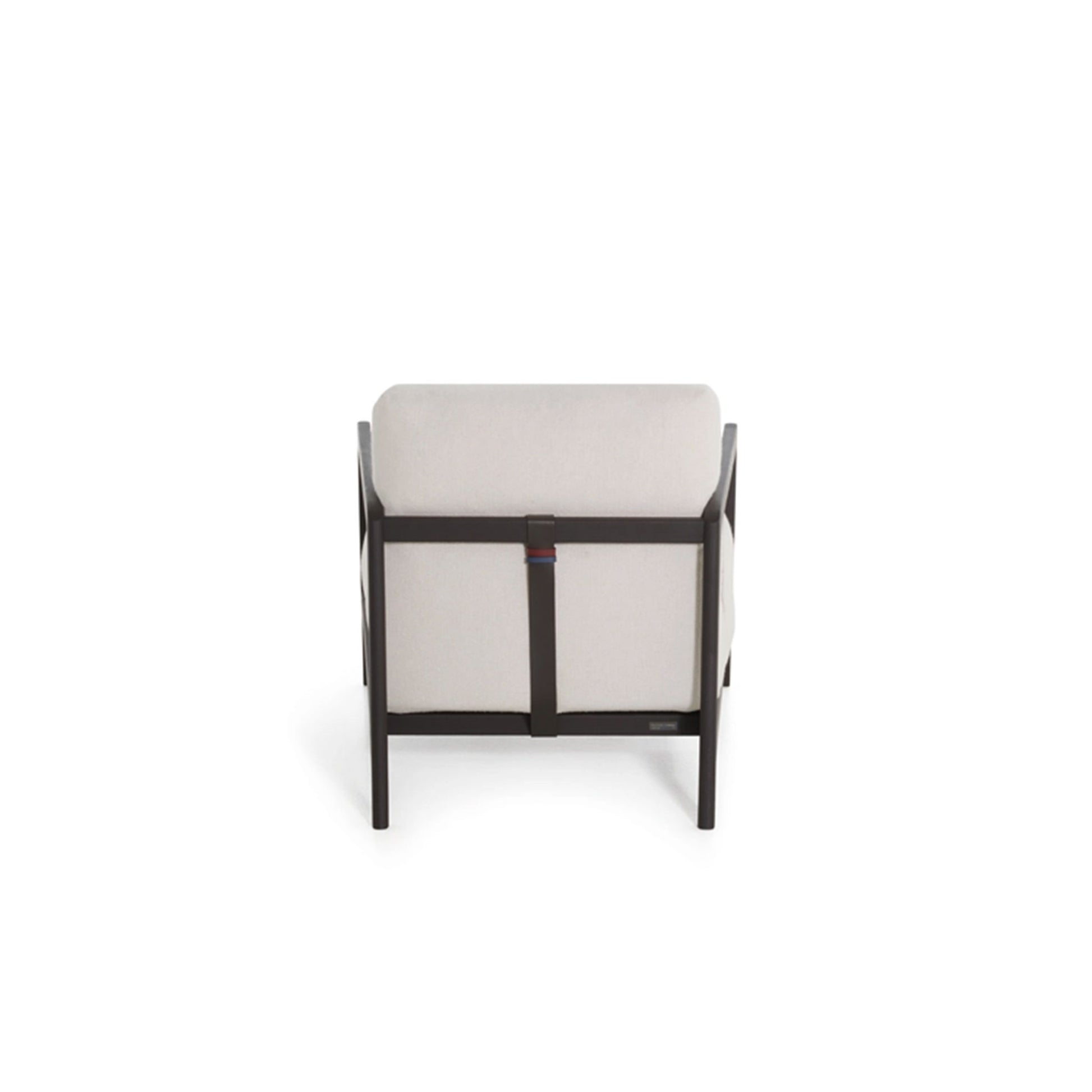The armchair’s frame is made of solid ash with a charcoal stain, while the seat and backrest – traversed by an exposed leather strap – are upholstered in multi-density polyurethane foam with a removable fabric or leather cover featuring the typical contrast stitching. A wide, comfortable and cosy modern armchair, to converse in, read a book or simply unwind.