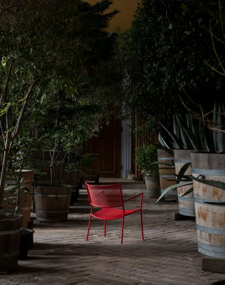 A collection of seating products in painted steel tubes and expanded sheet metal.