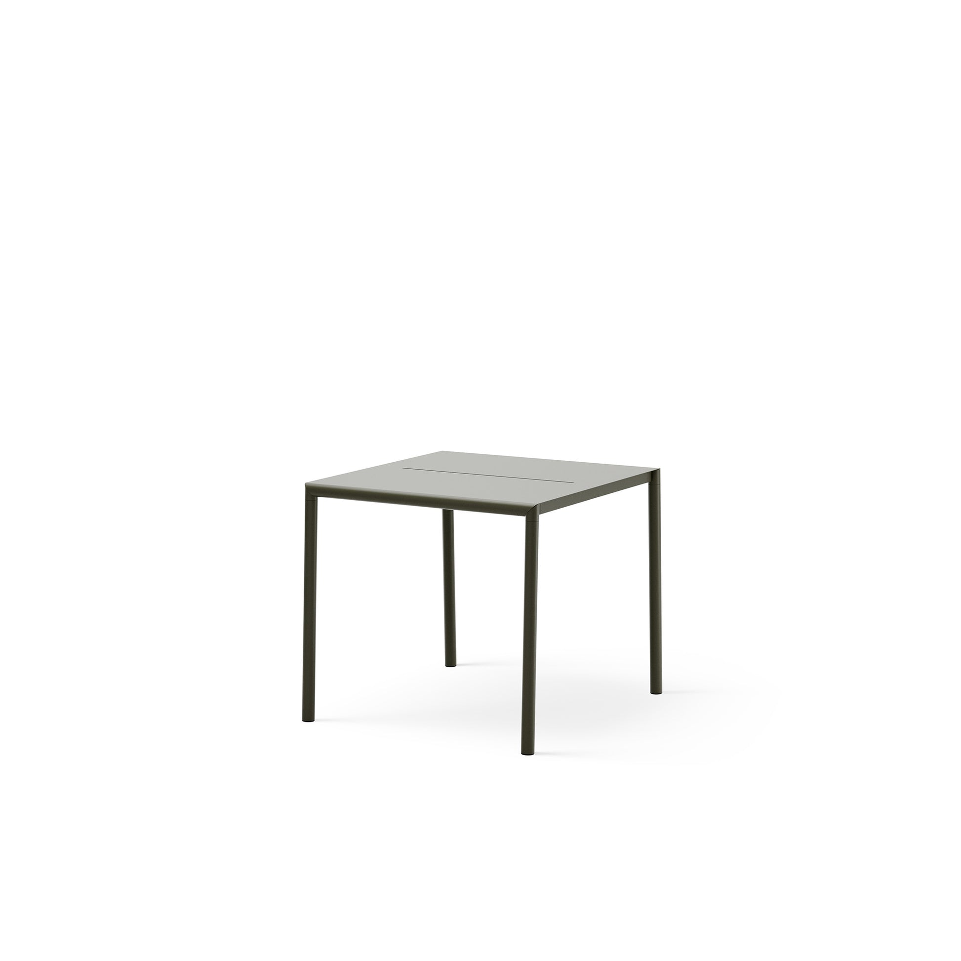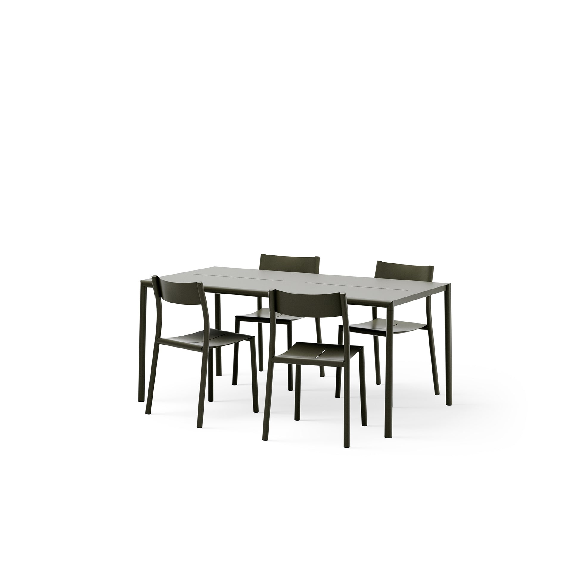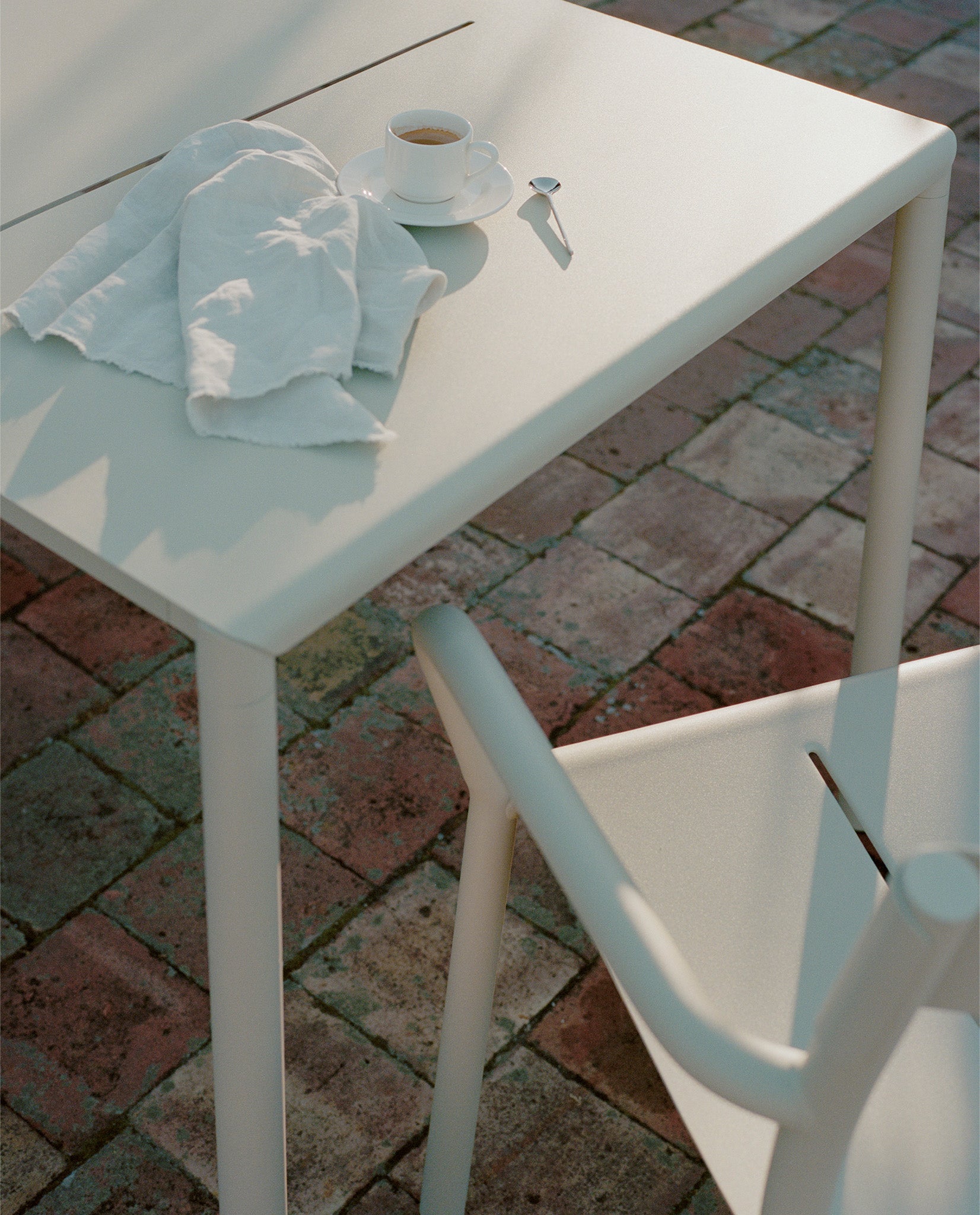 The understated, monochromatic appearance of the May family is detailed without being technical. The chair leads the way for the defining interactions of the design in which a delicate surface meets a bold frame - two opposing elements which somehow comfortably coexist. As the light steel sheet tightly wraps itself around the chunky steel frame, it forms a strong and comfortable seat, slightly curved so that it gently hugs the body. A slit through the seat allows for water drainage and adds a subtle detail to the otherwise uniform surface. Mirrored in the tables, it creates a repetition of lines that brings lightness, direction, and unity to the family.