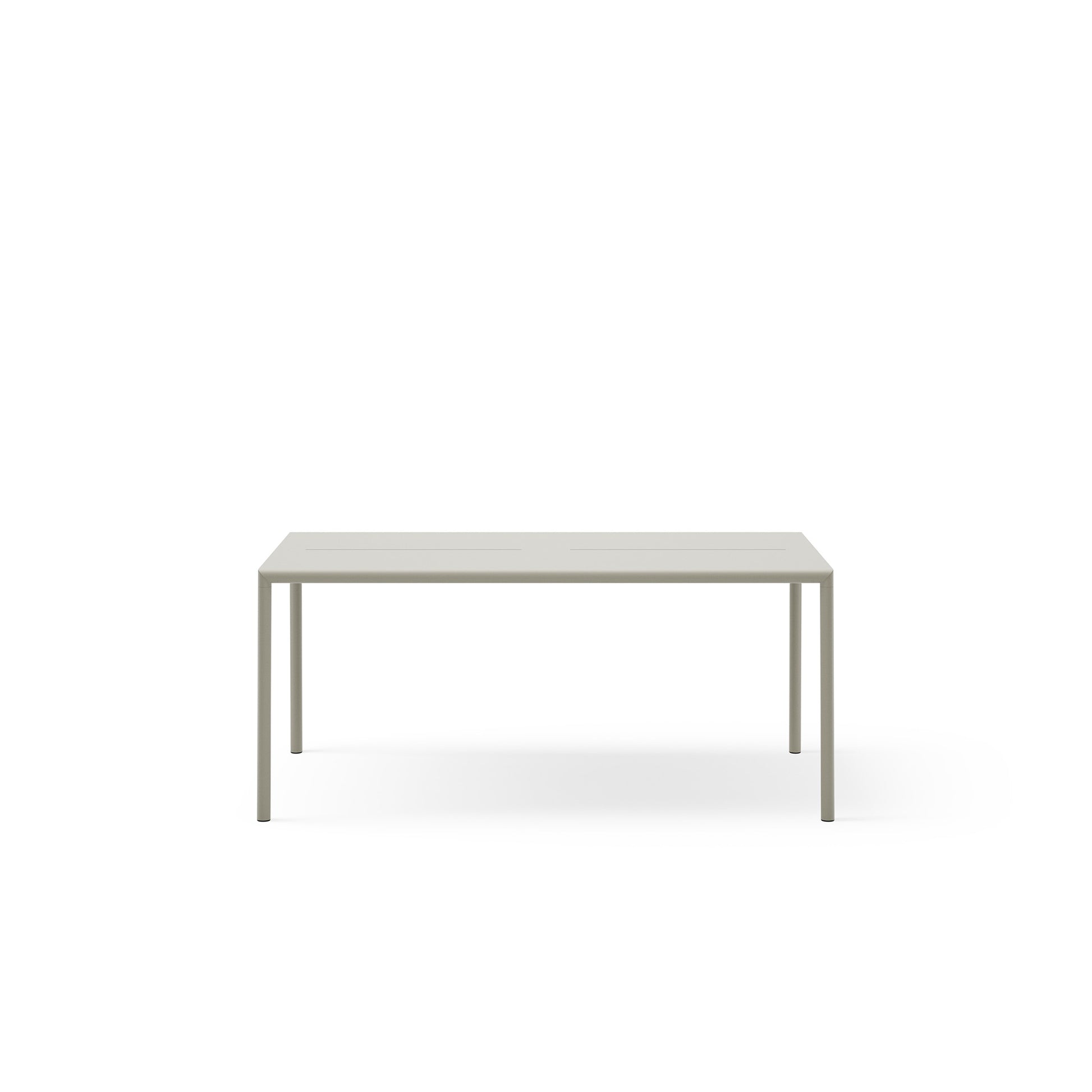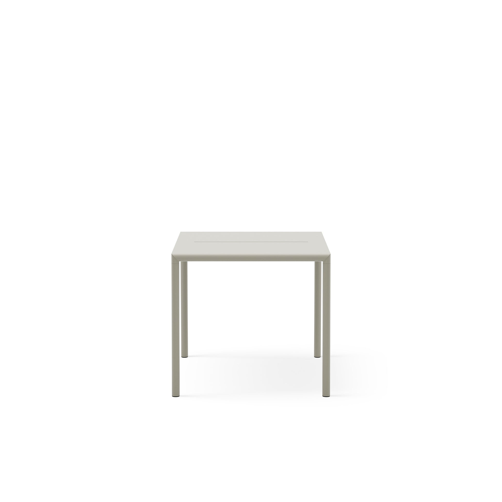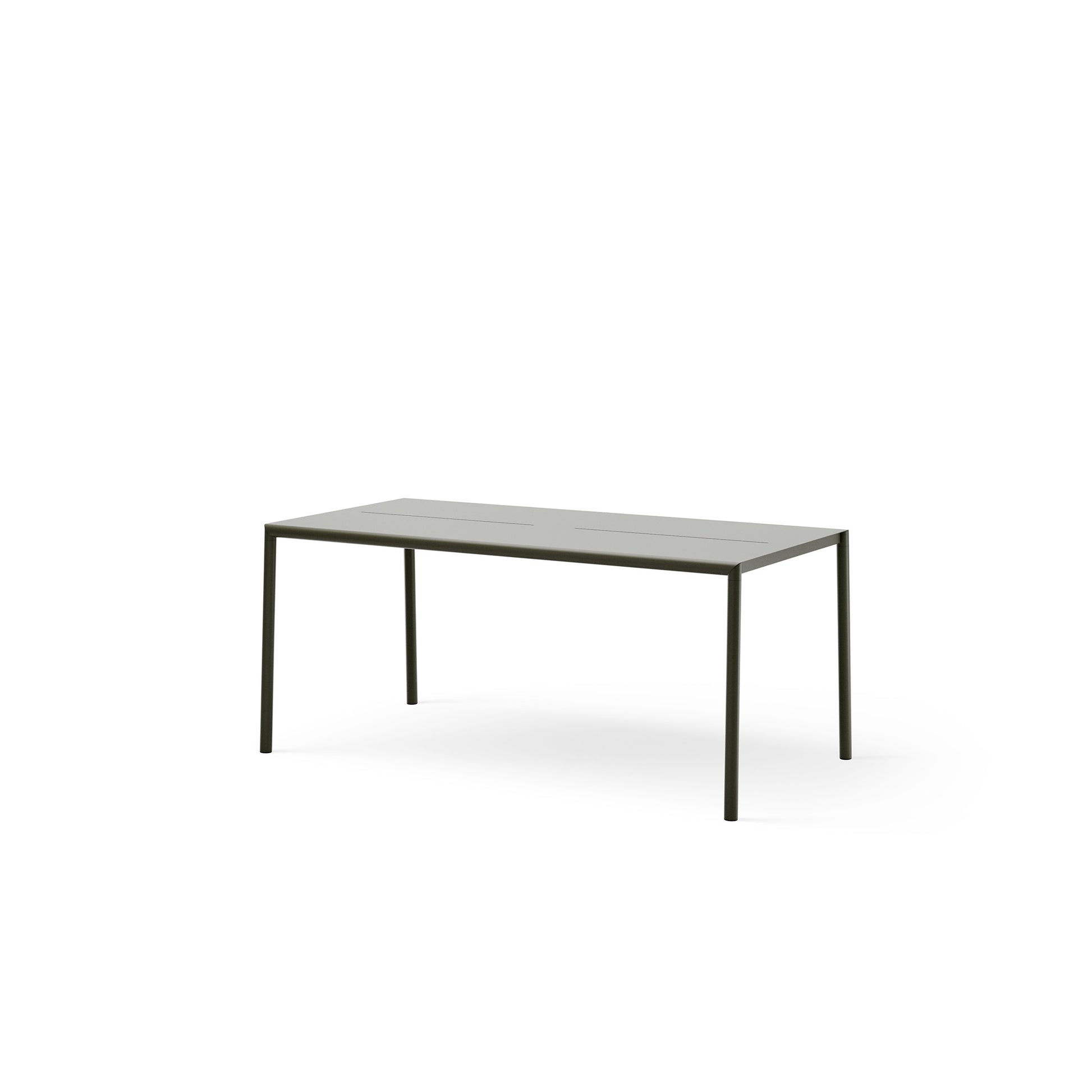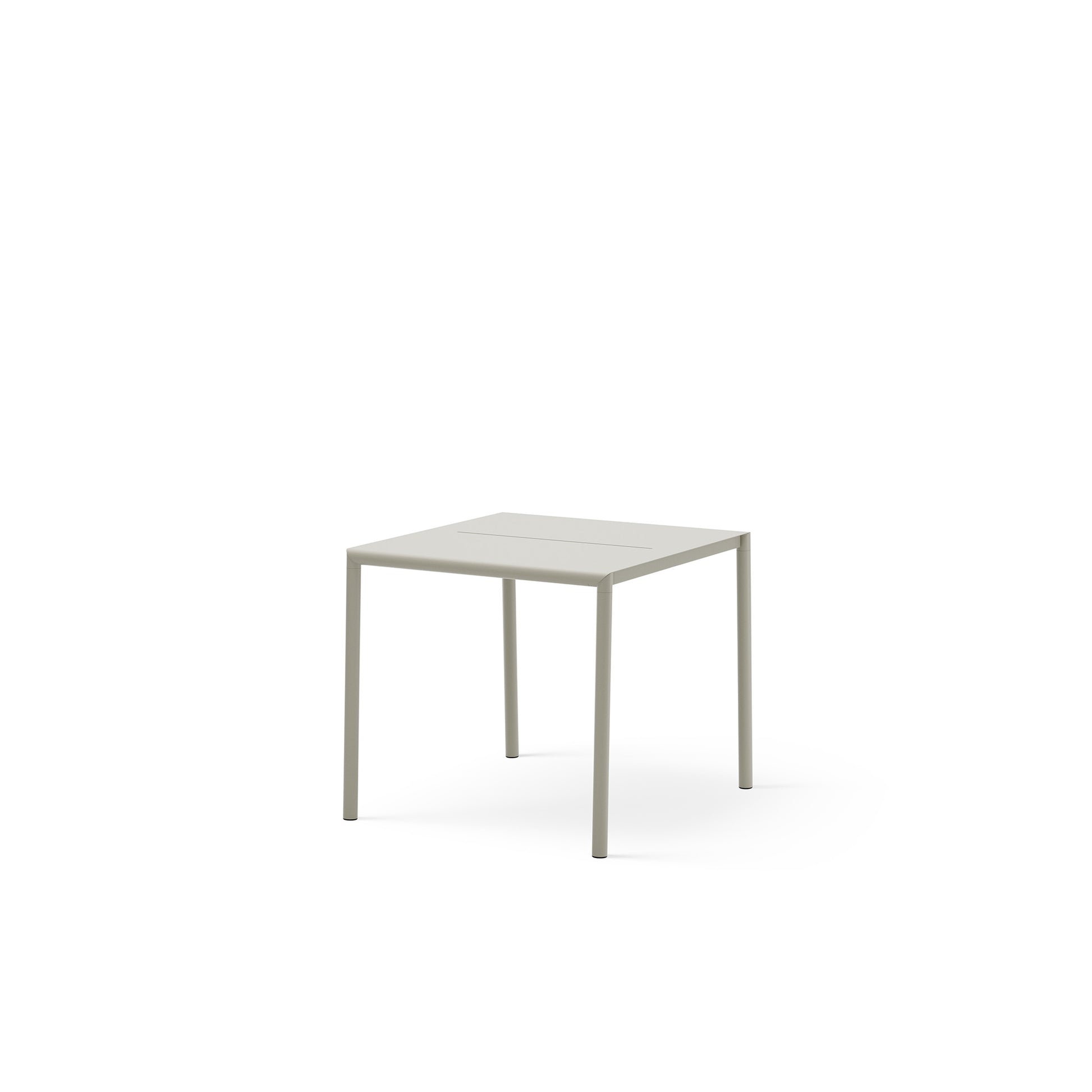 The understated, monochromatic appearance of the May family is detailed without being technical. The chair leads the way for the defining interactions of the design in which a delicate surface meets a bold frame - two opposing elements which somehow comfortably coexist. As the light steel sheet tightly wraps itself around the chunky steel frame, it forms a strong and comfortable seat, slightly curved so that it gently hugs the body. A slit through the seat allows for water drainage and adds a subtle detail to the otherwise uniform surface. Mirrored in the tables, it creates a repetition of lines that brings lightness, direction, and unity to the family.
