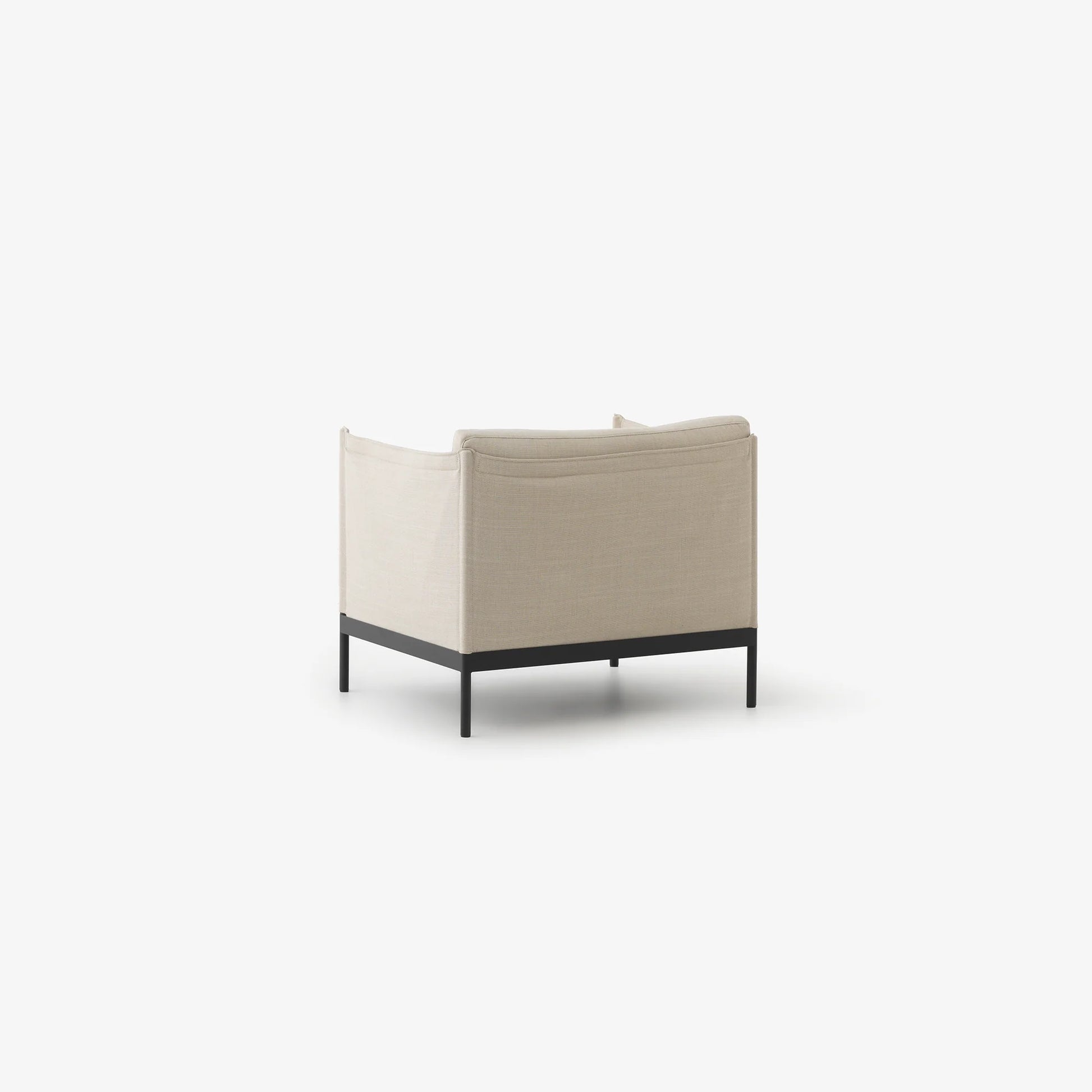 November's stainless steel frame supports a fabric slung back and arm, finding a delicate balance between structure and comfort. The unique sling-frame construction is designed to soften over time for comfort and a relaxed aesthetic.