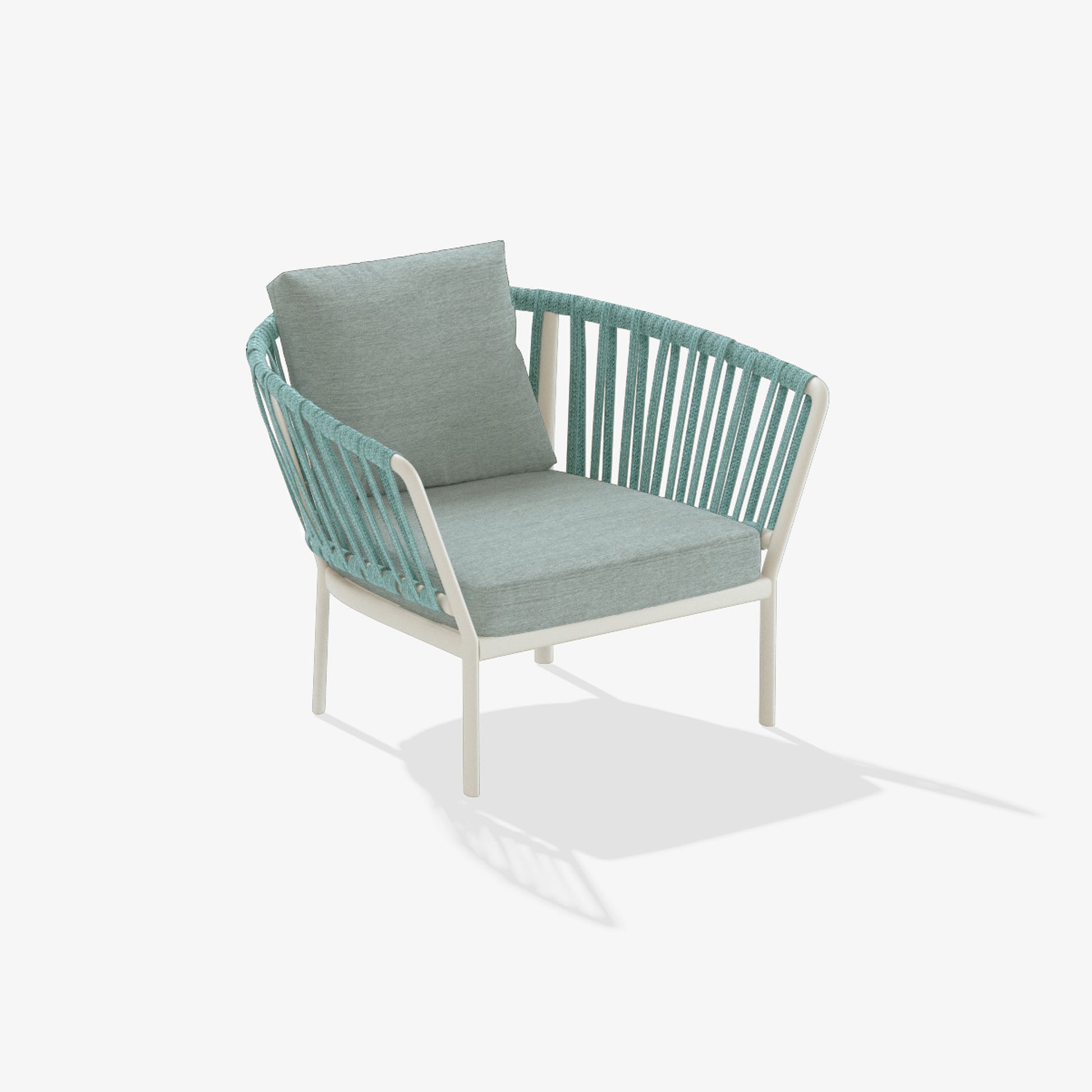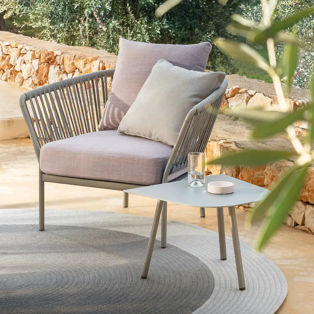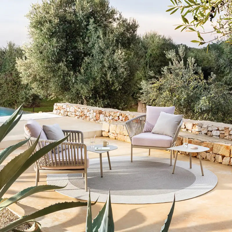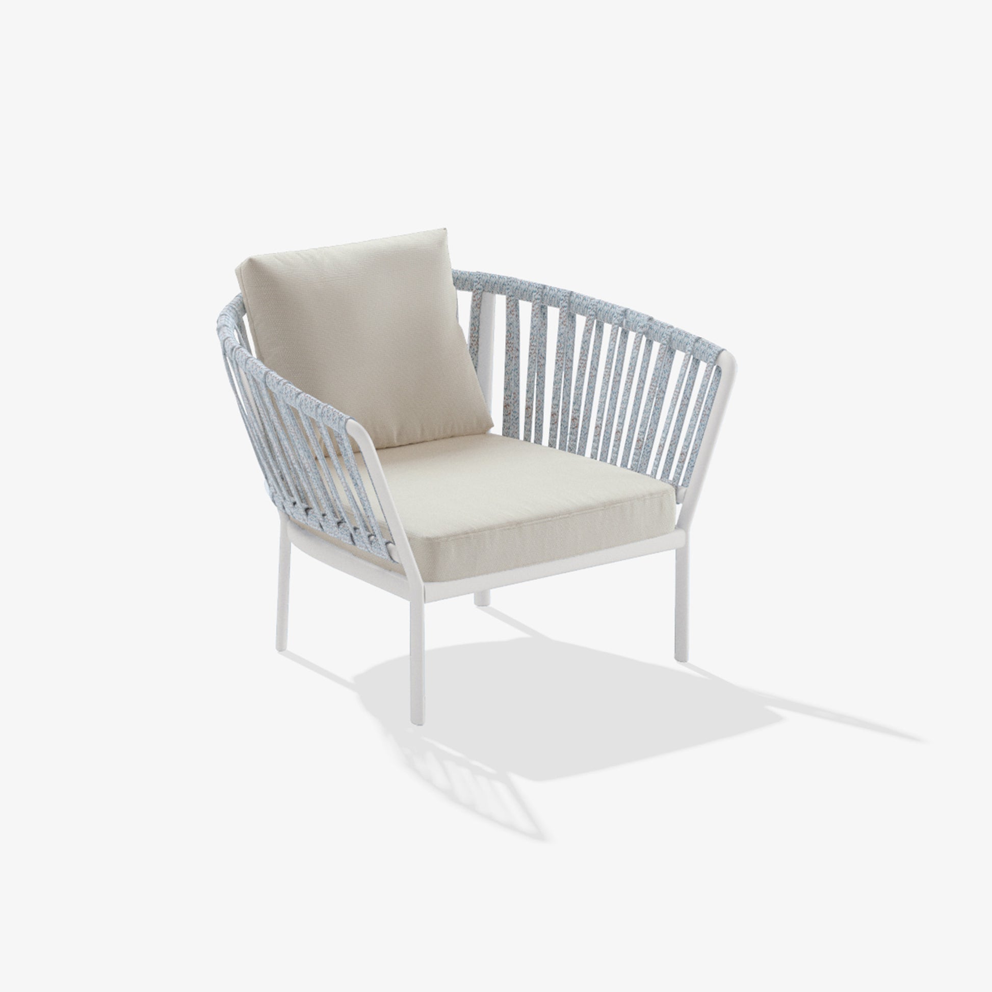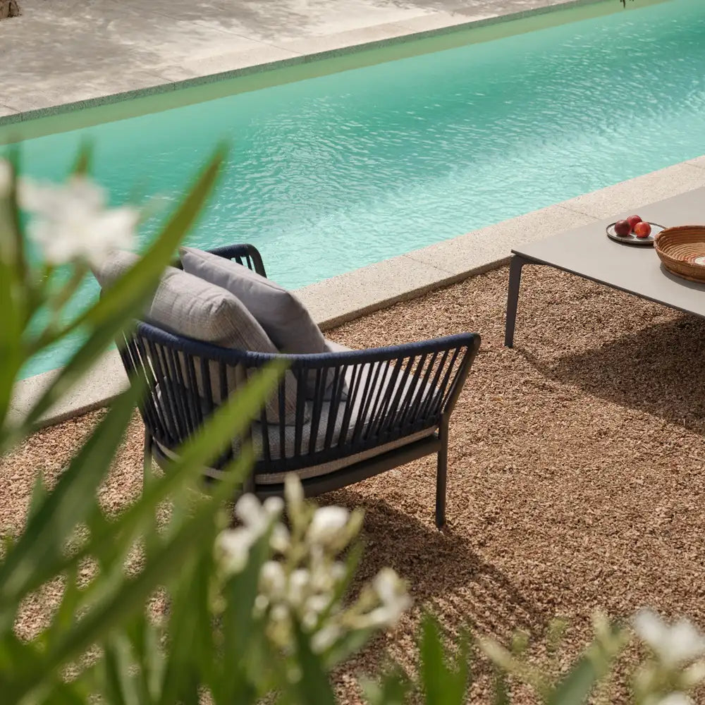 The Ria collection includes: dining armchair in the aluminium, partially woven rope, fully woven rope and with quilted backrest versions, 2/3-seater sofas, armchair, lounge chair and daybed in the woven rope versions.