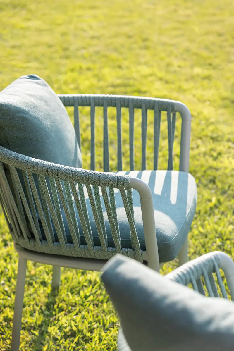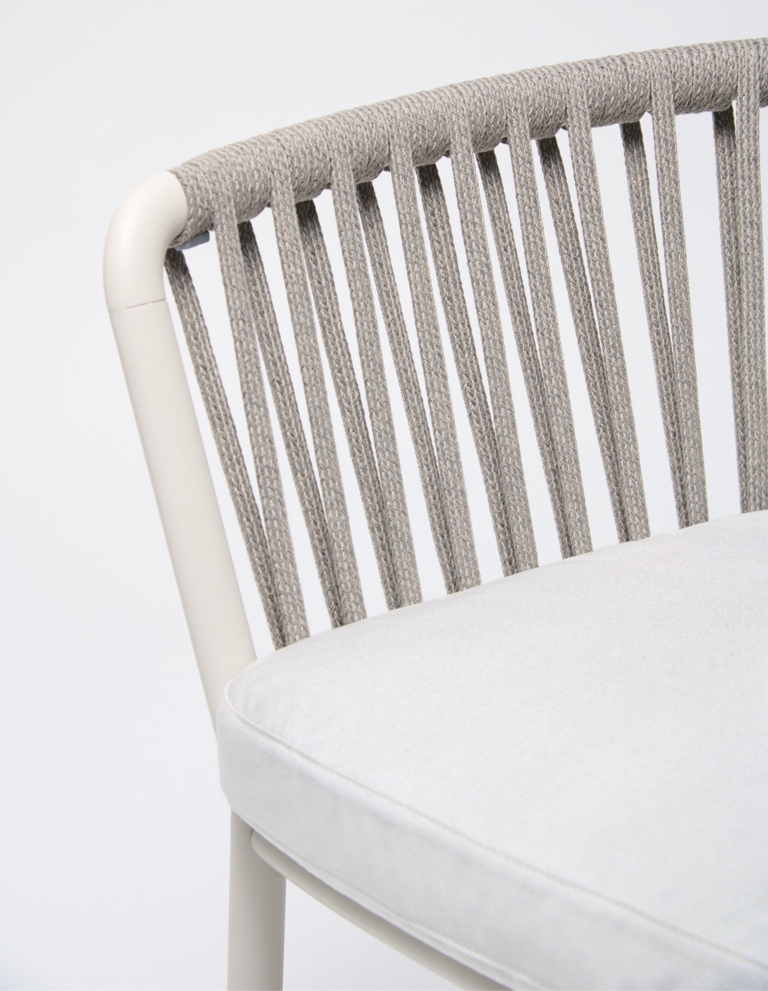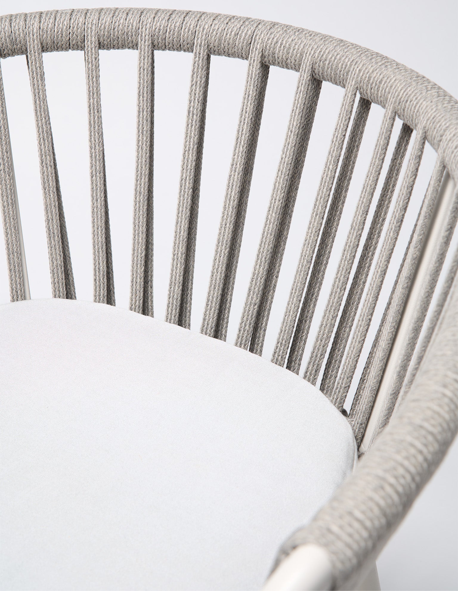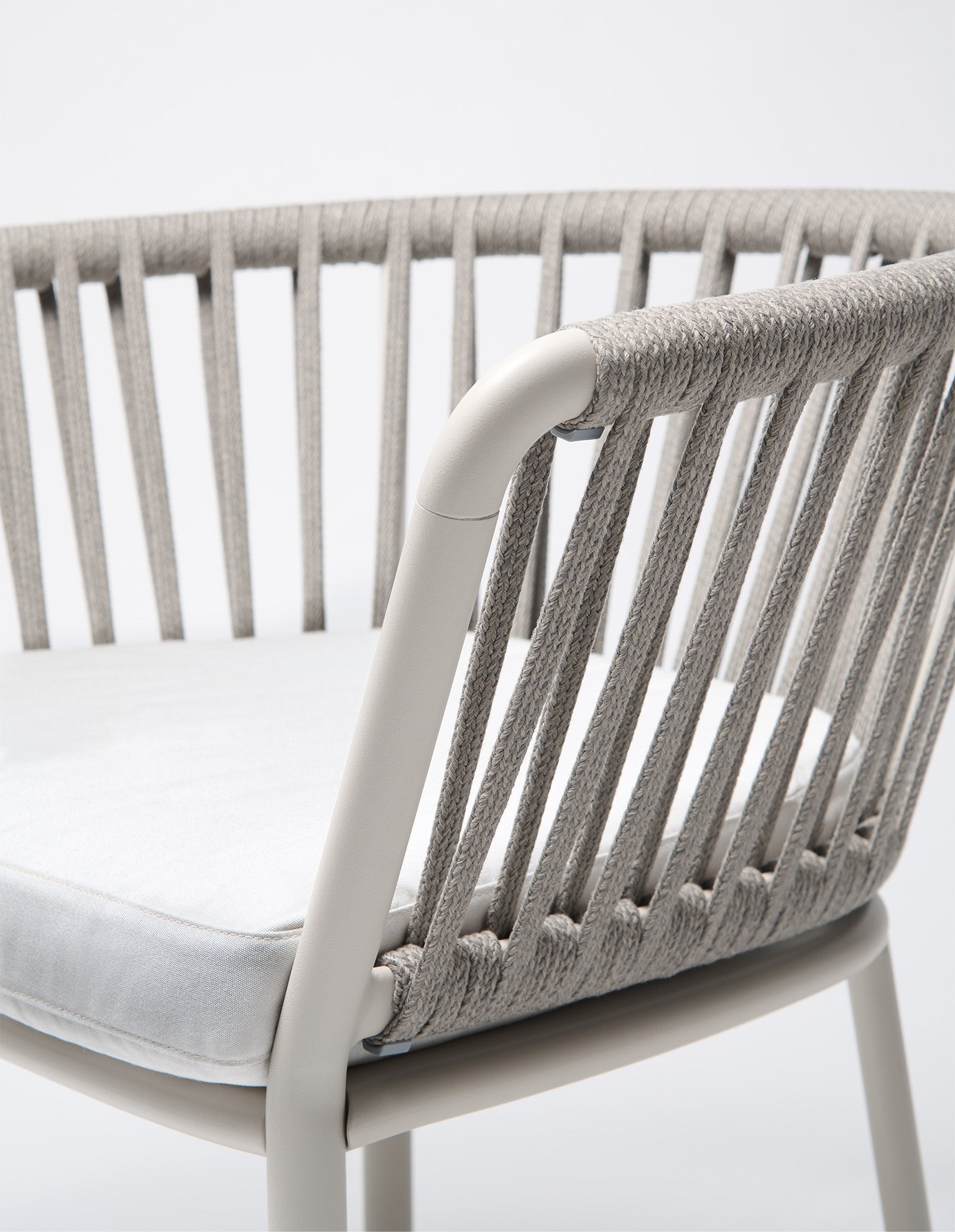 The Ria collection includes: dining armchair in the aluminium, partially woven rope, fully woven rope and with quilted backrest versions, 2/3-seater sofas, armchair, lounge chair and daybed in the woven rope versions.