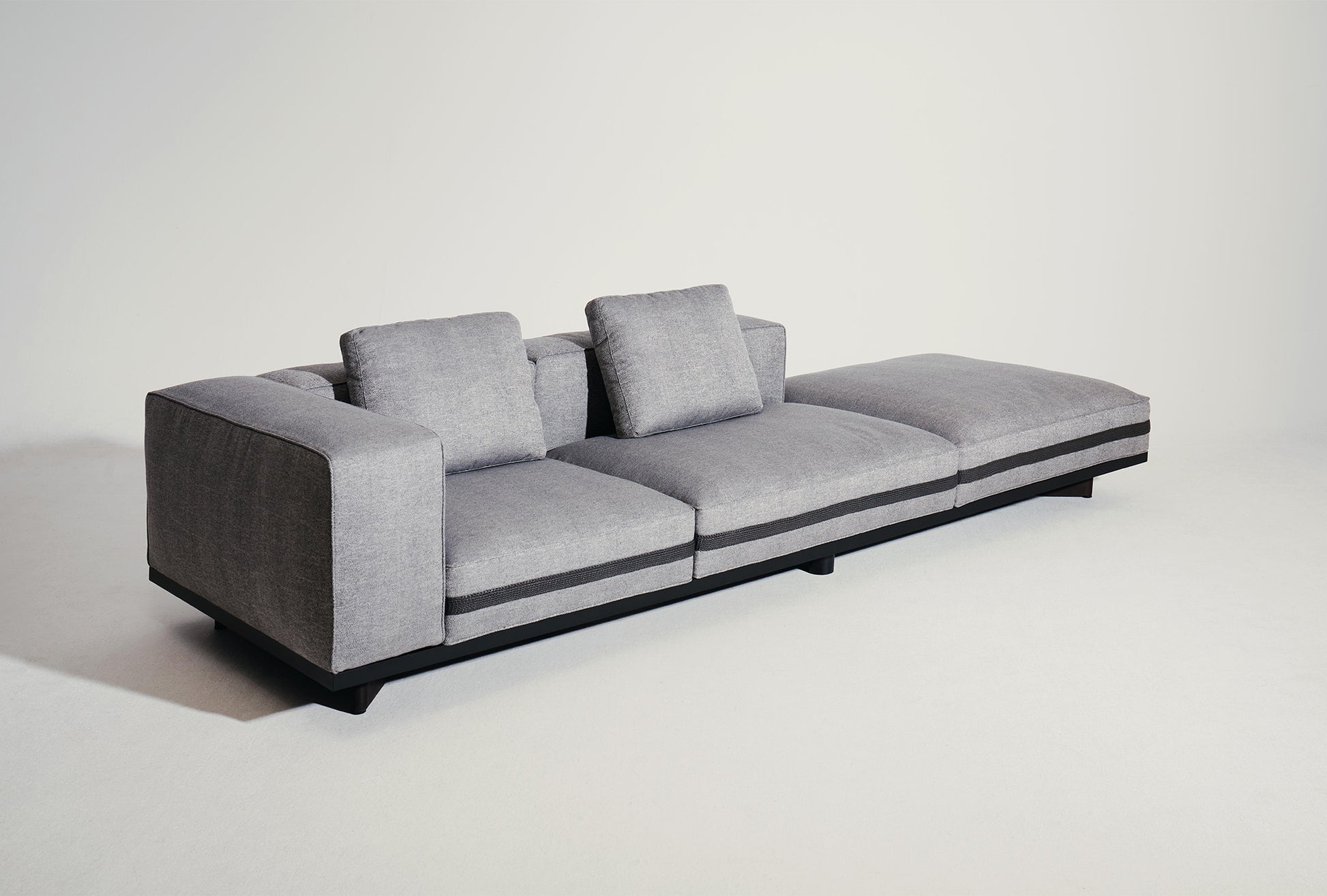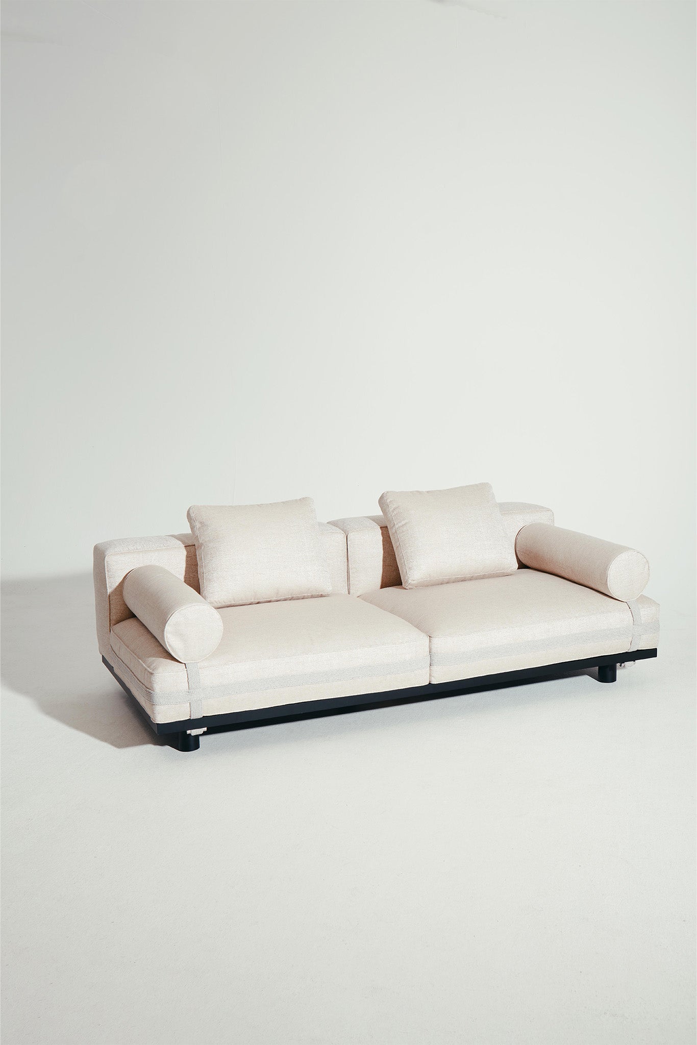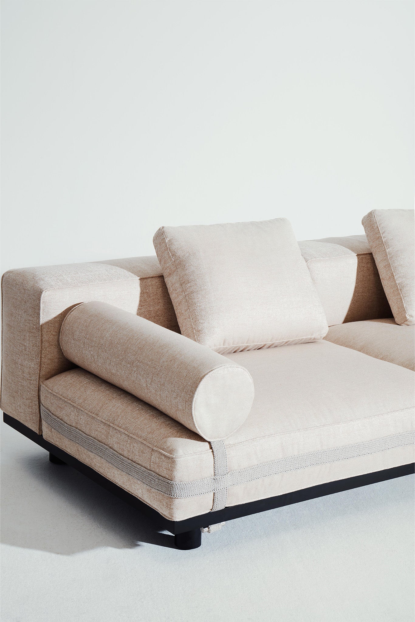 Designed to incorporate the least number of elements possible, each with several possible uses for a decidedly modular product. Variations in cushion shapes are kept to a minimum to promote adaptability, allowing for instance a back cushion to pivot and be used as an armrest. The bolster-shaped cylindrical cushions are a reference to the familiar vocabulary of La Manufacture’s Luizet sofa. Textile straps reminiscent of hiking backpacks provide both a visual accent and a practical solution to secure the cushions in position. The sofa looks as if it is wrapped in precious wrapping paper, like a gift. Boasting a palette of elegant and calming colours, Saint Rémy stands out as a hybrid seating design that will suit both indoor and outdoor environments.
