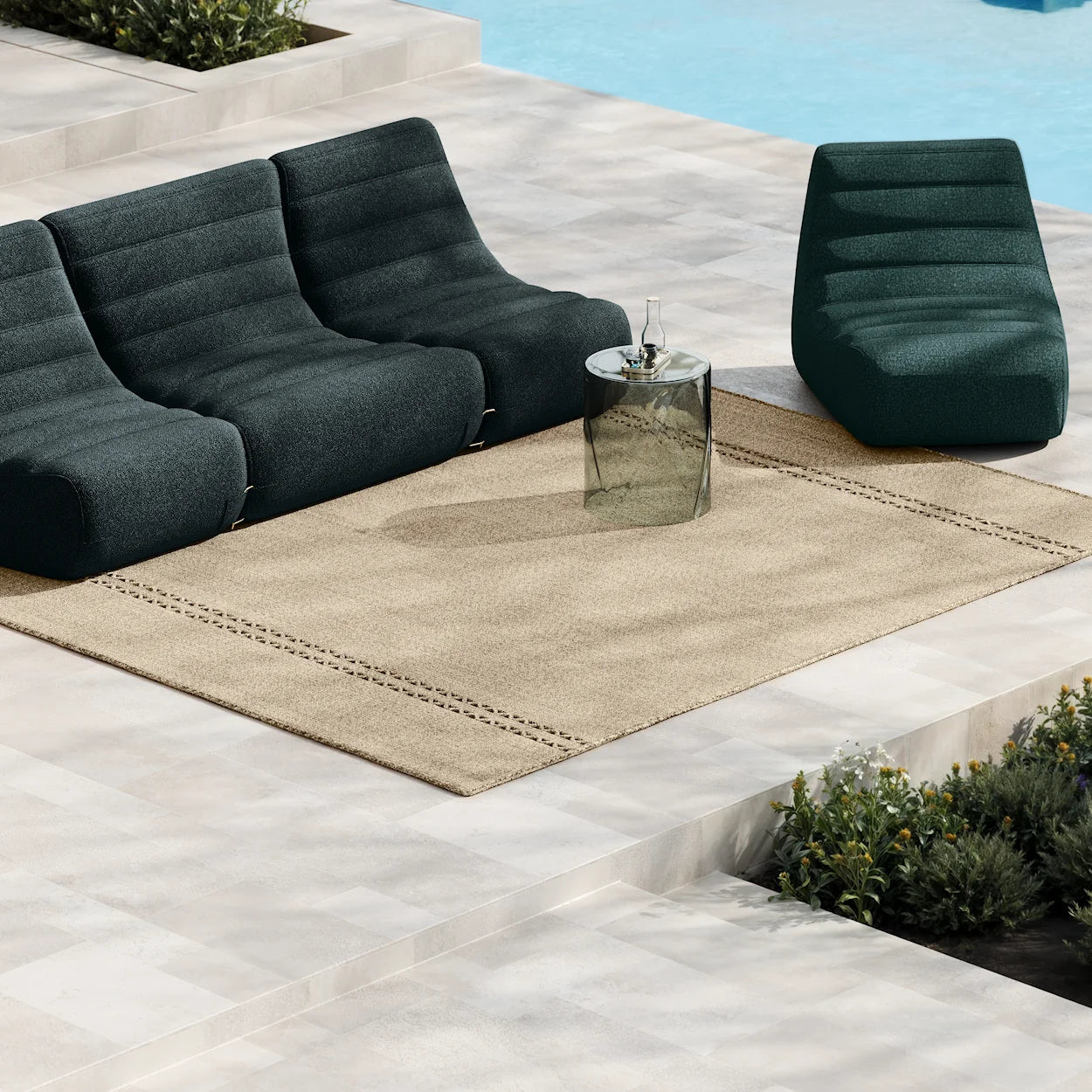 Constructed from man-made fibres the rugs are water-repellent, tear-resistant and fast-drying. These stable and maintenance-friendly properties make the rugs equally suitable for use in interior environments. The polypropylene is solution-dyed, reducing water, dye, and energy consumption in production, requiring no additional performance chemicals and ensuring colour fastness.