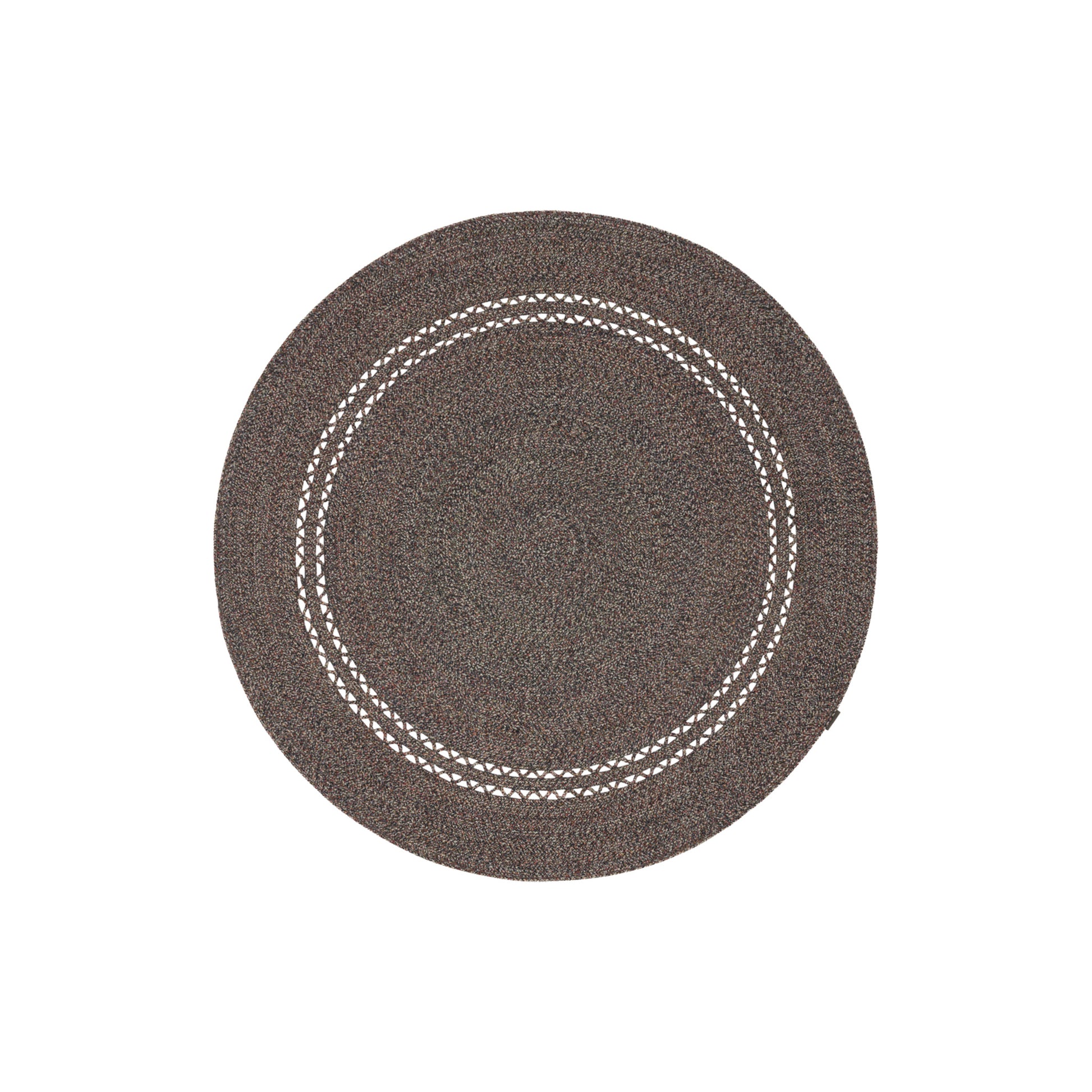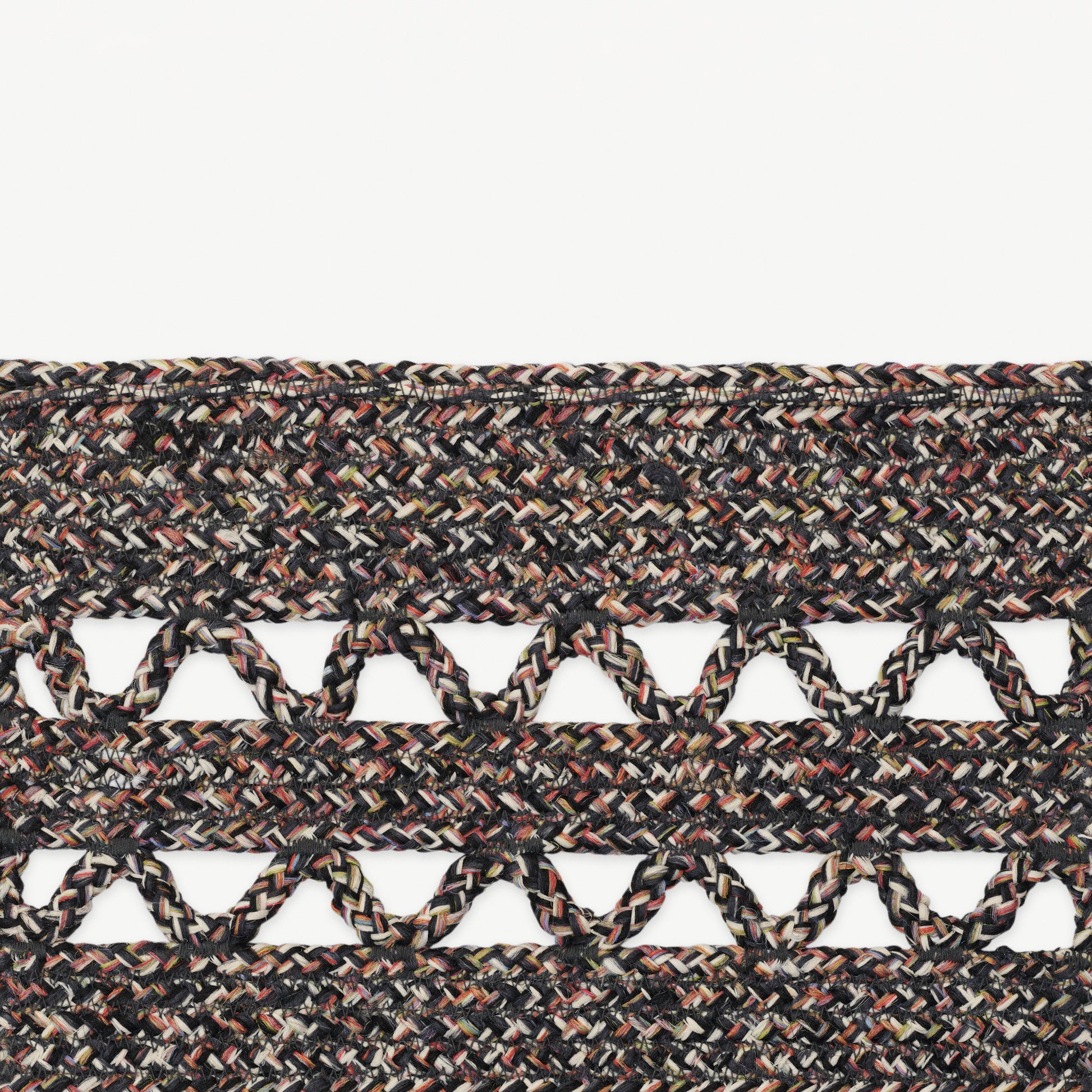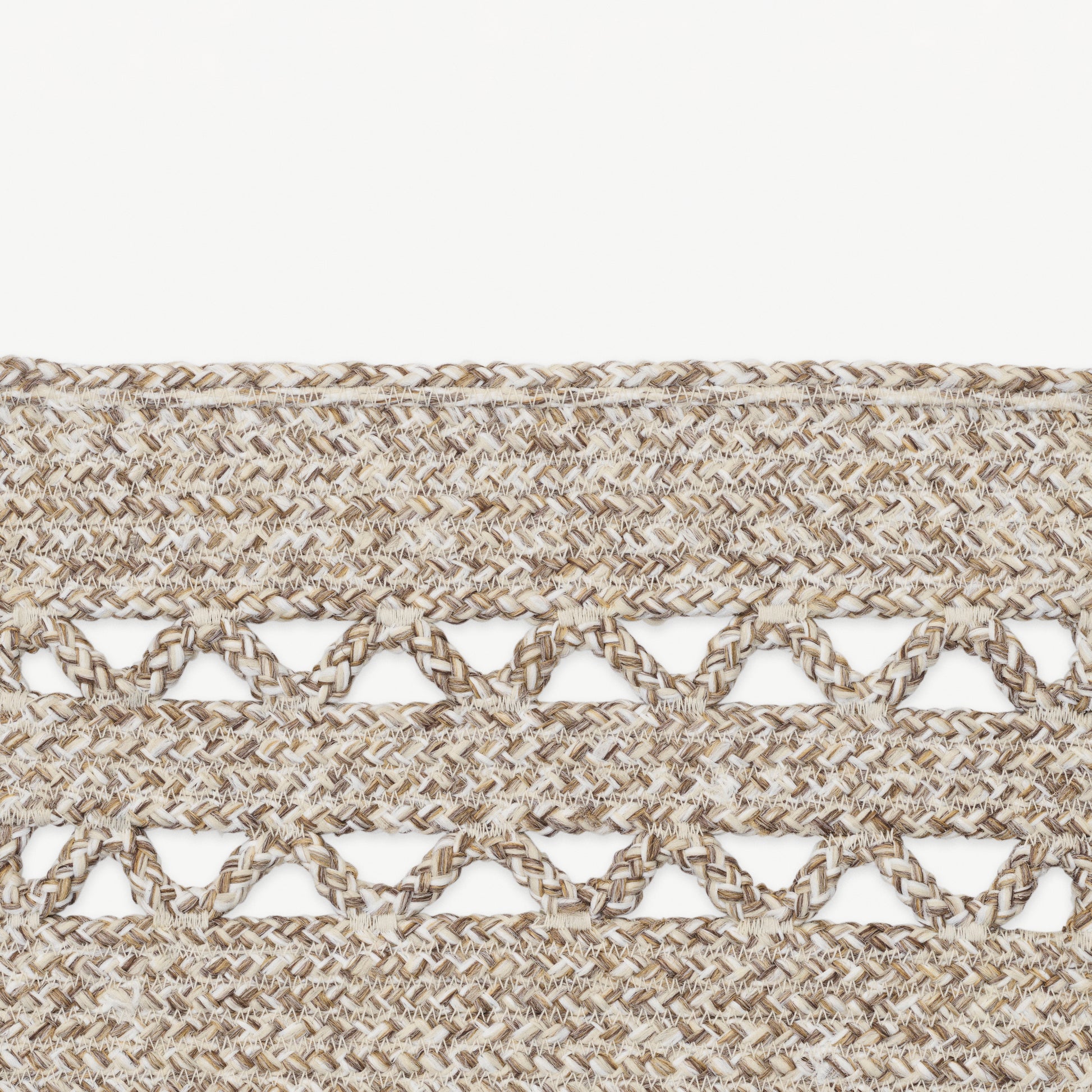 The Sio Outdoor rug features multicoloured braided ropes, stitched together to create a flat, smooth surface with a natural, lively colour effect. The stitching forms a shaded stripe pattern, while an open detail gently softens the structure.