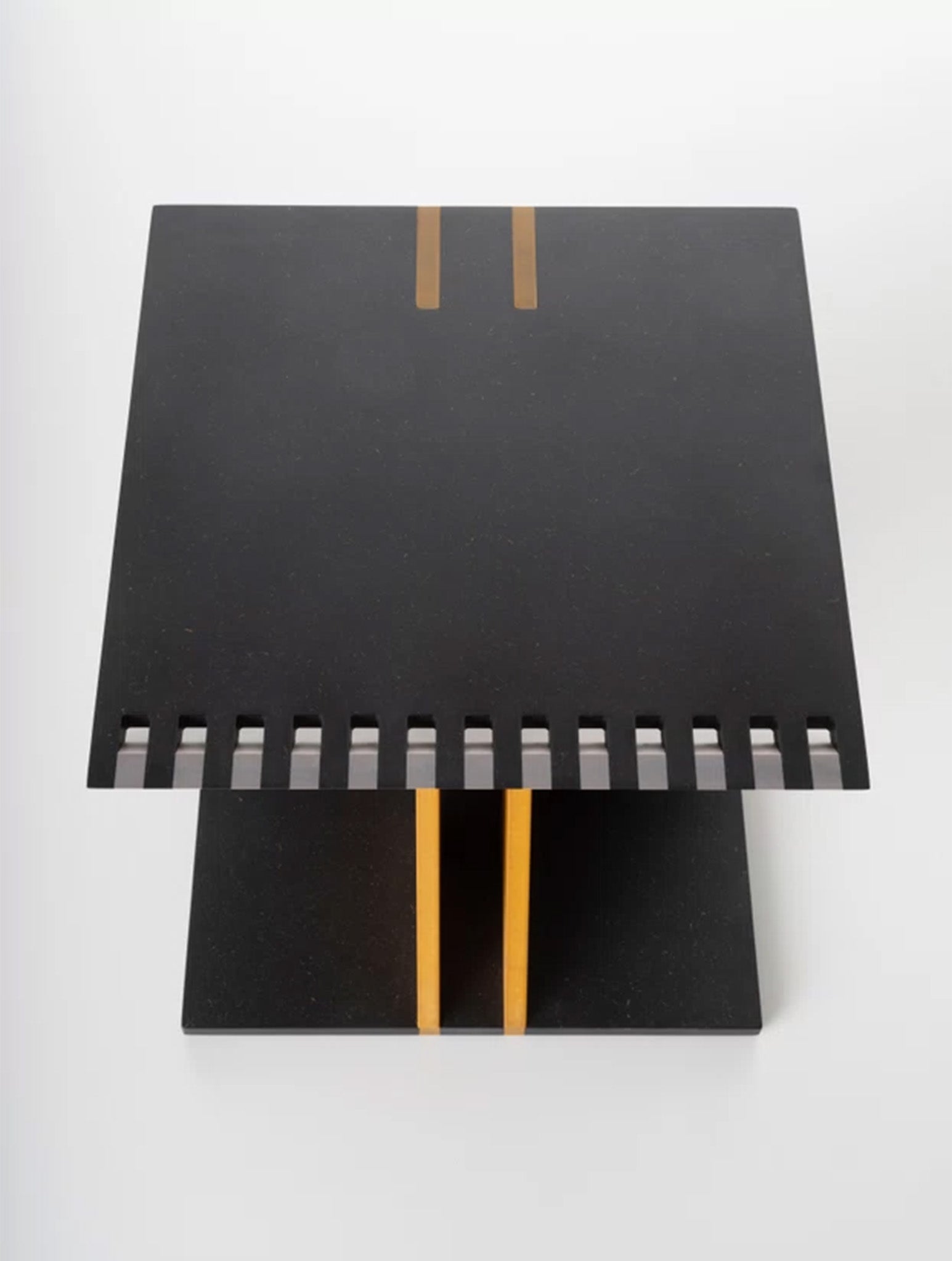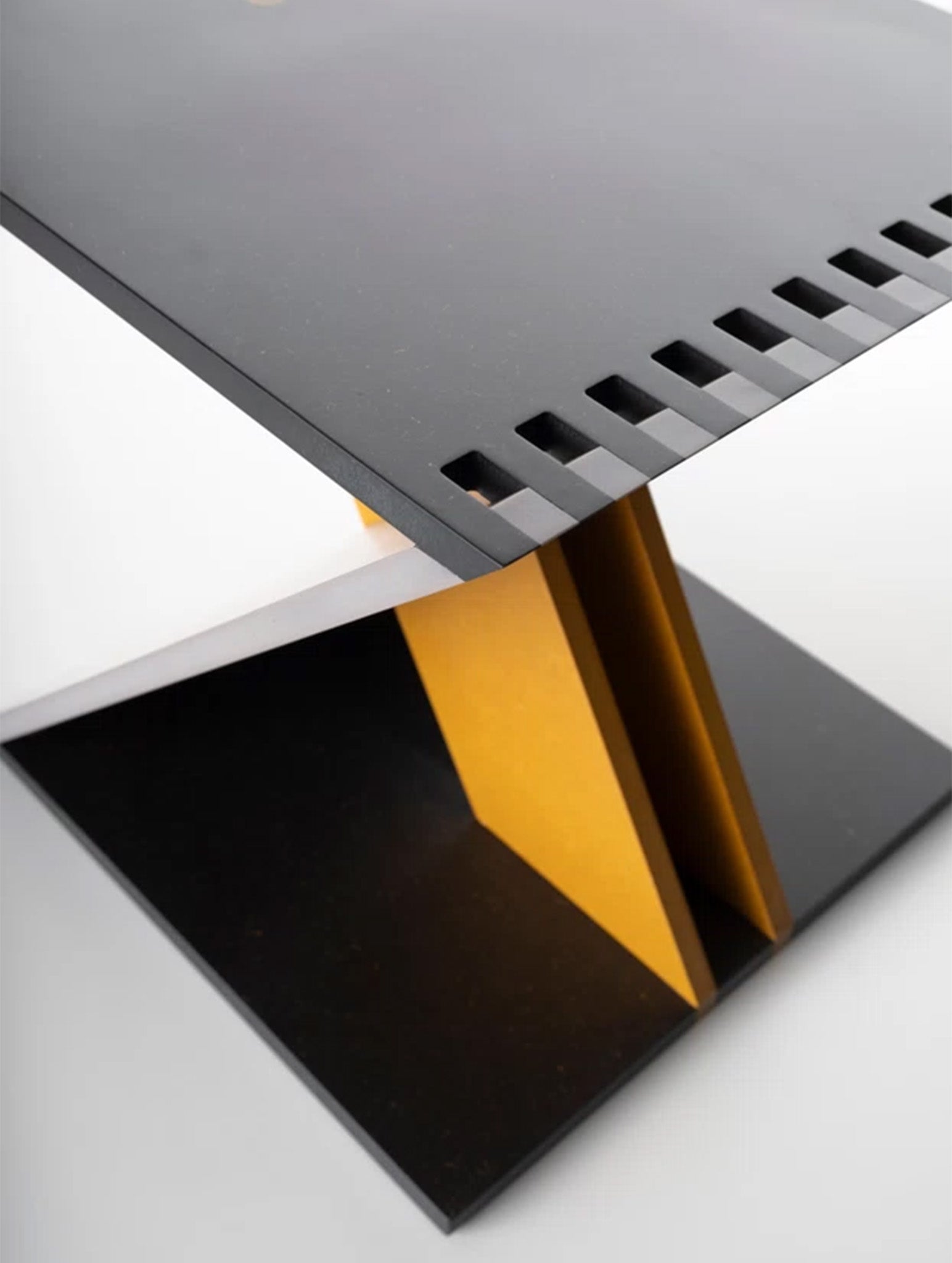 Two diagonal leaves merge with this element, helping to strengthen its structure and giving the design a dynamic and rigorous balance. The result is an object with a strong graphic impact and a distinctive design, an expression of the formal research of Botta, focused on the relationship between horizontal and oblique lines.
