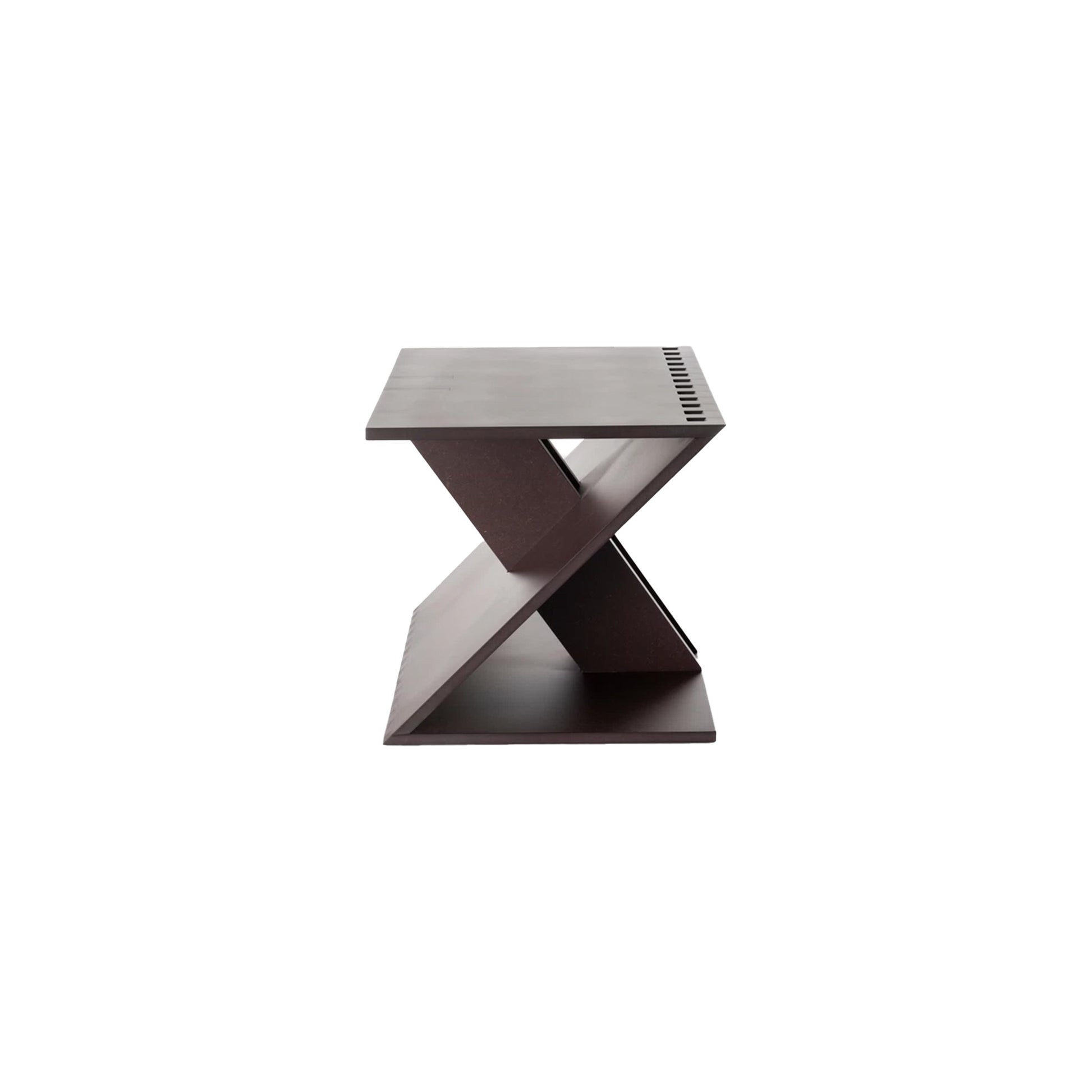 The Zeta stool recalls the letter from which it takes its name: two square elements, serving as base and seat, are joined by a diagonal element secured by a comb joint at each end.