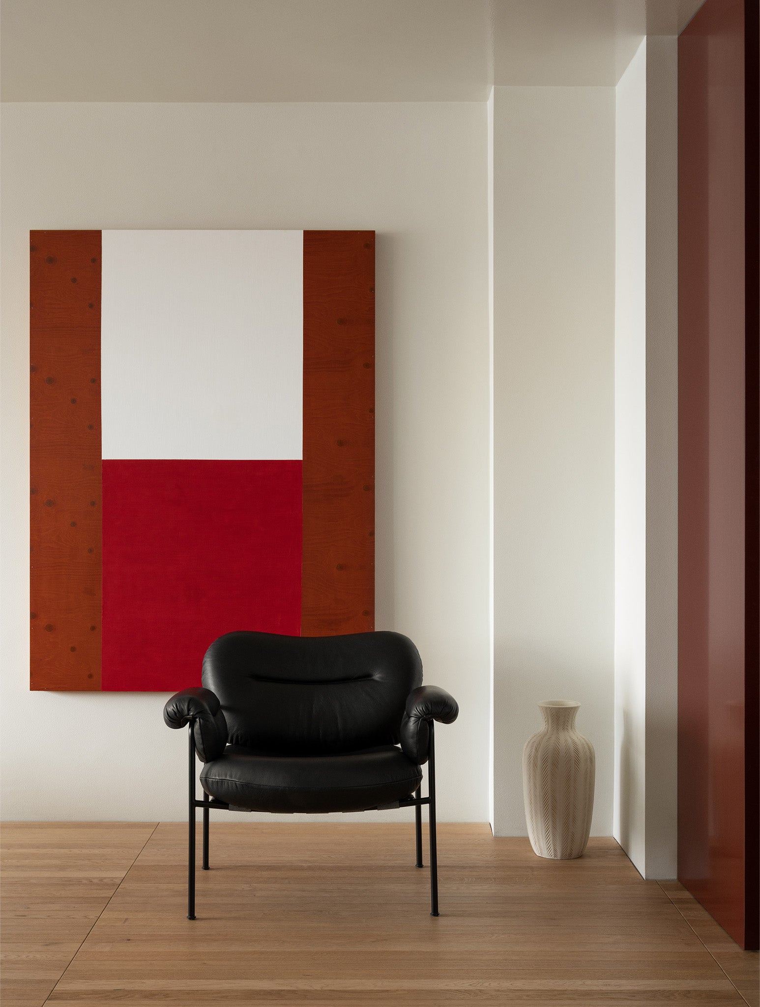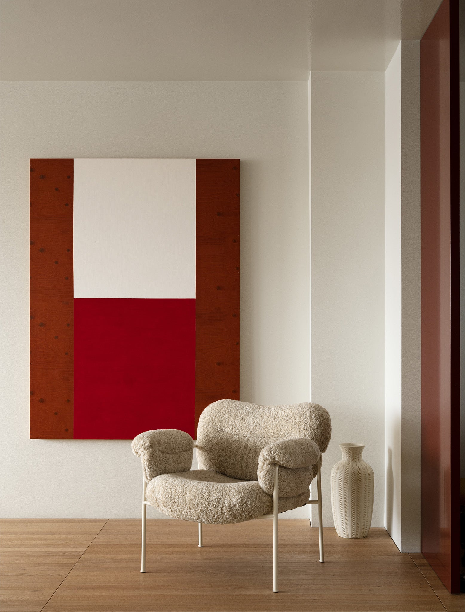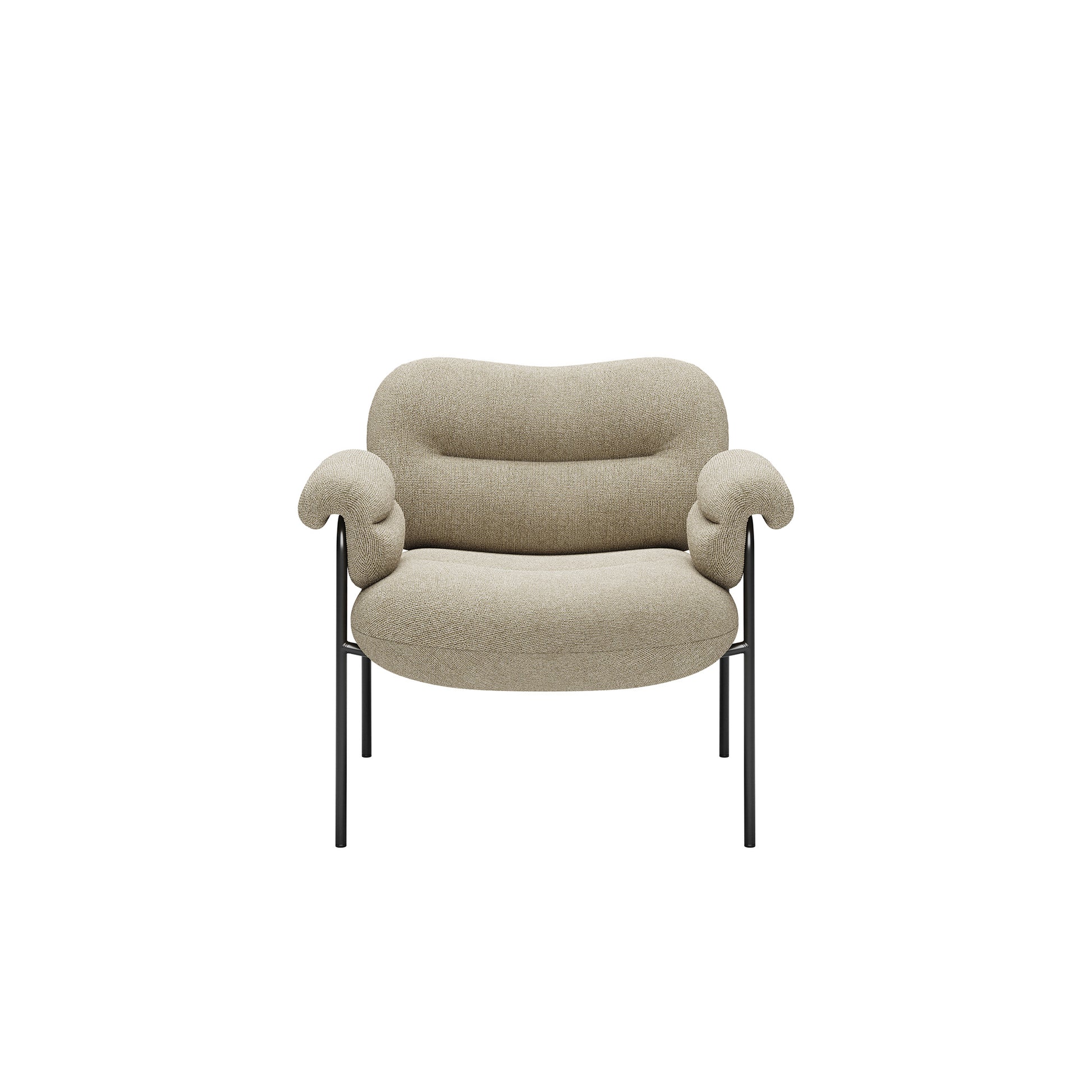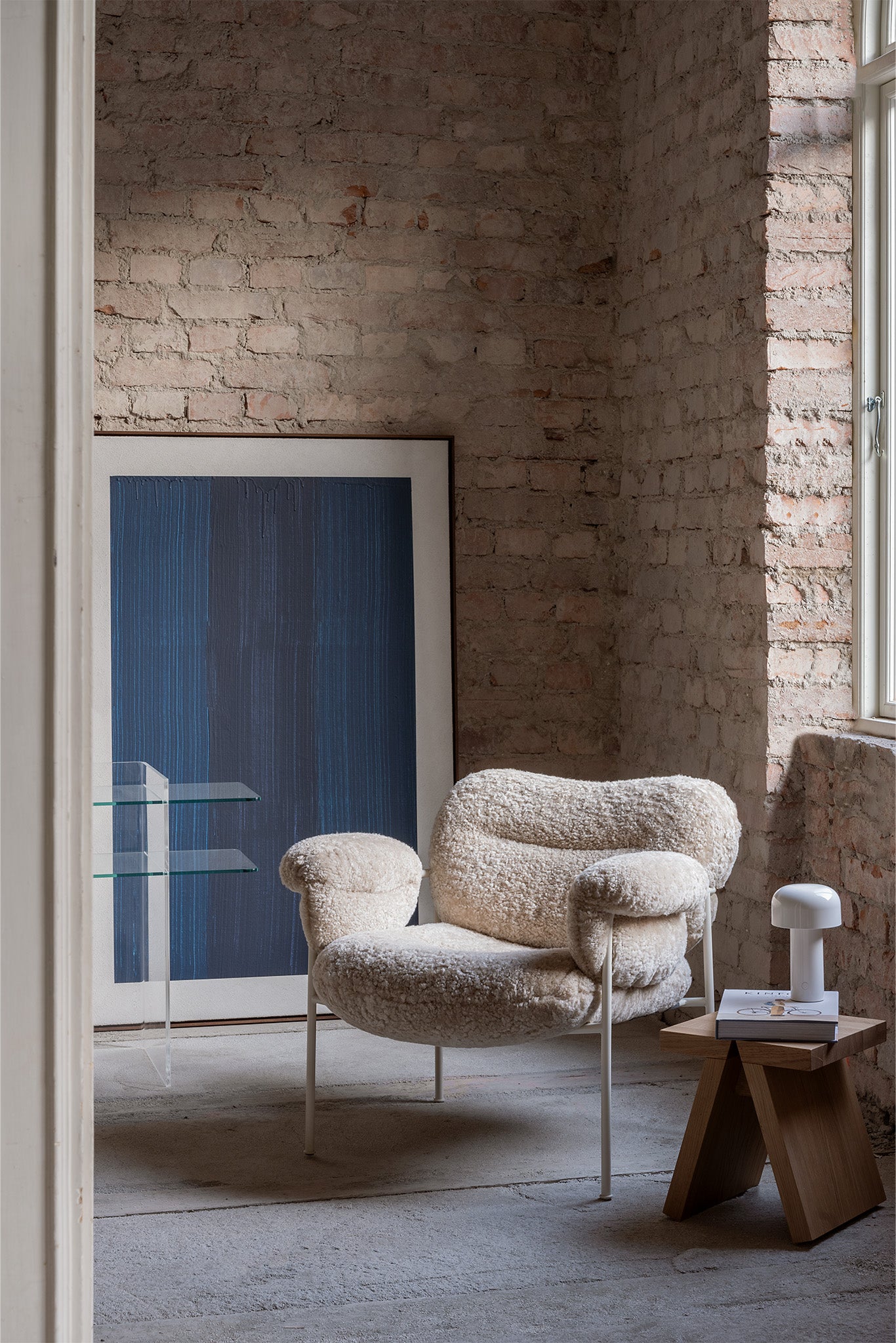 Inspired by the distinct tubular frames of mid-century lounge chairs, its generous cushioning wraps and softens the metal frame.