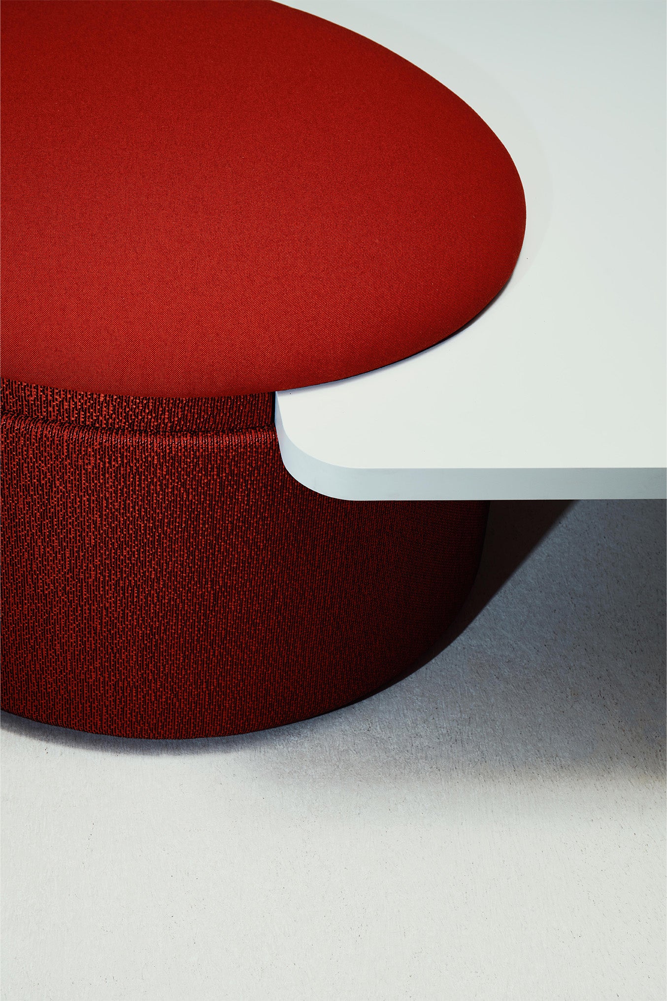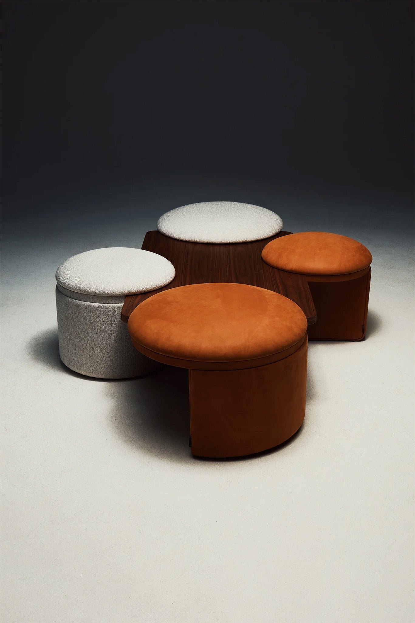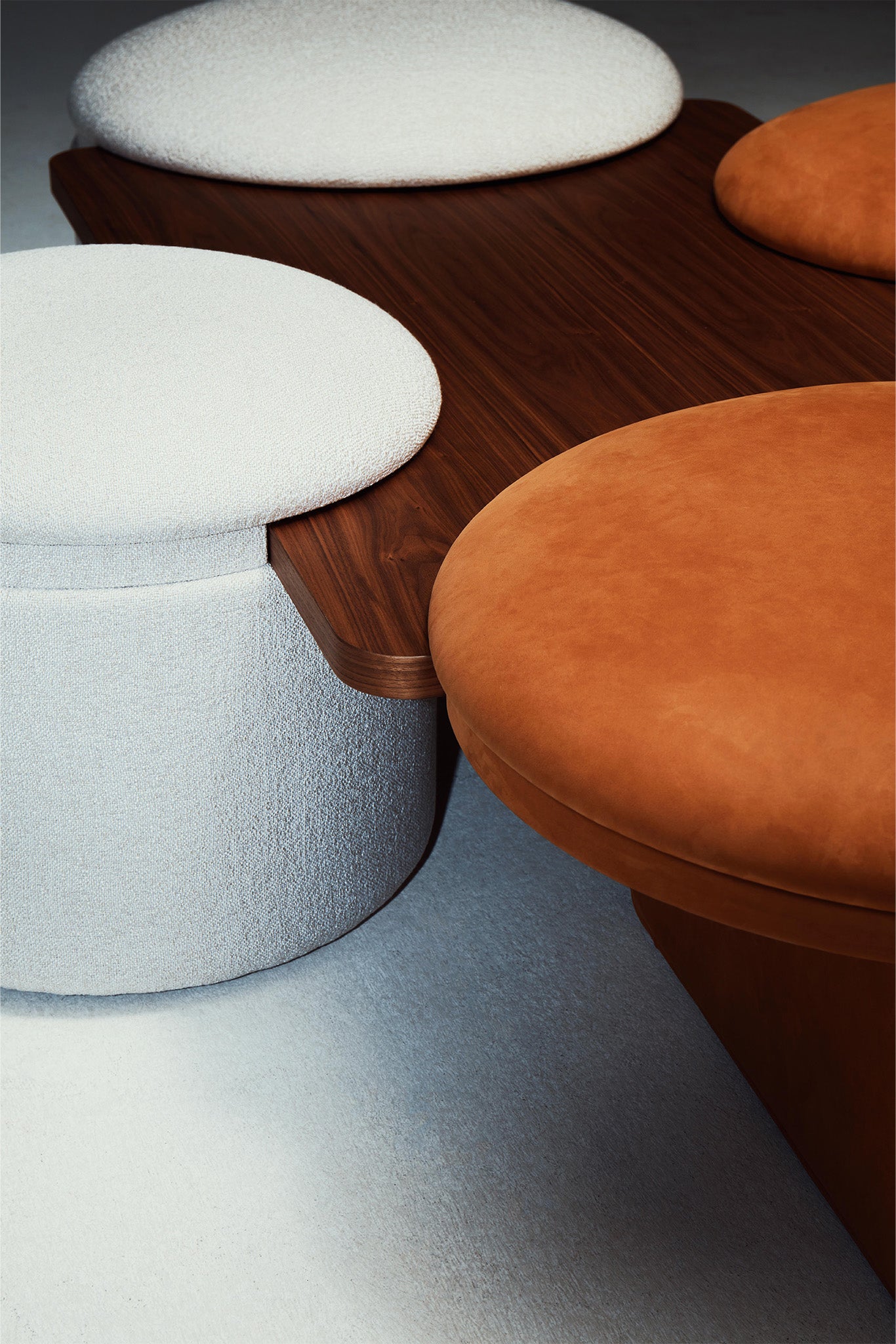 It consists of a crucial centre element: a flat surface in natural or lacquered walnut serving as a coffee table, to which a series of poufs are attached. This informal and collaborative configuration gives users full latitude to choose the position they feel most comfortable in and the way they want to interact with others. The range includes several compositions, meeting a variety of needs for workspace, residential or hospitality environments. Individual upholstered poufs are also available in two sizes and can be combined inside a room into fun and spontaneous clusters to create personalised patterns.