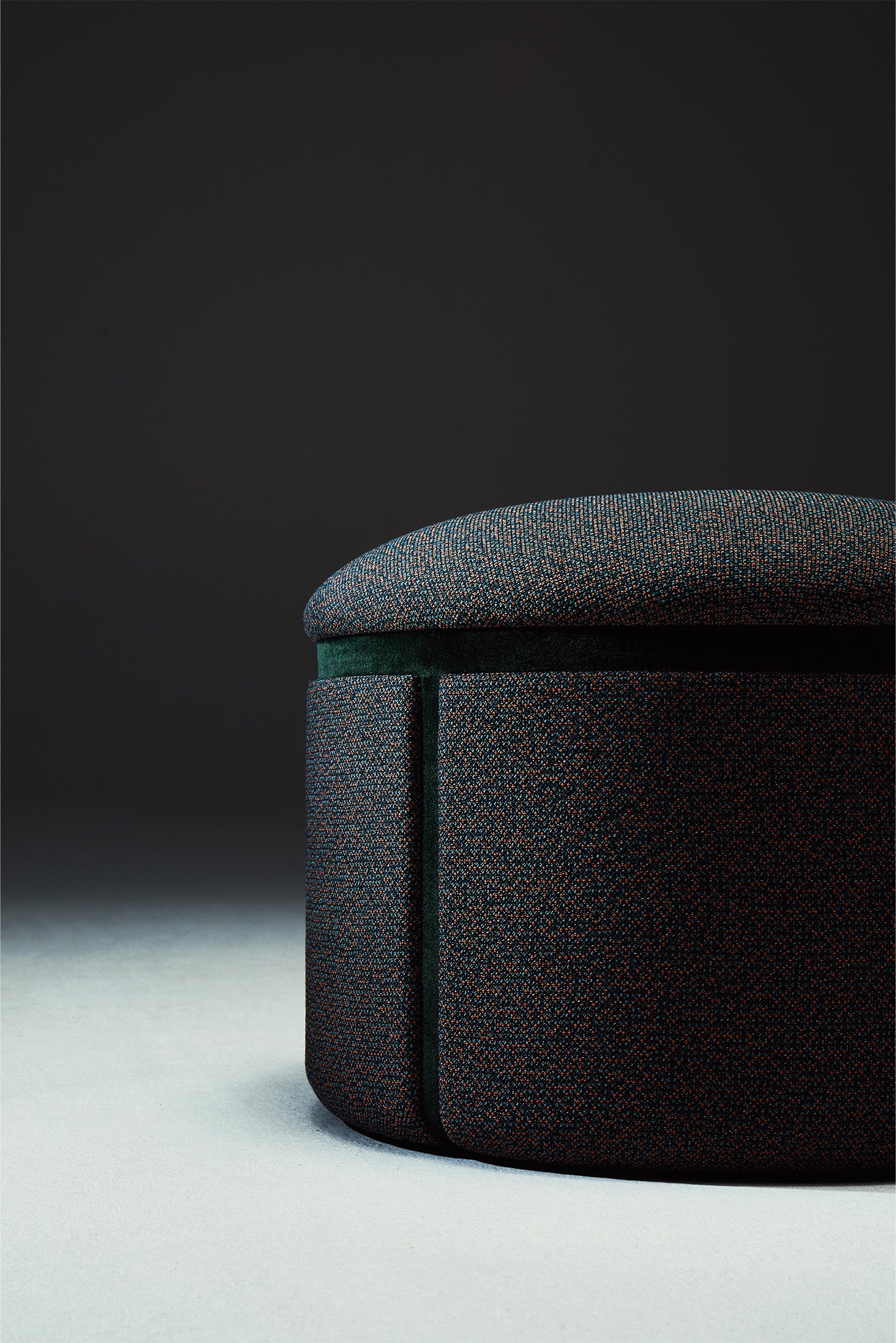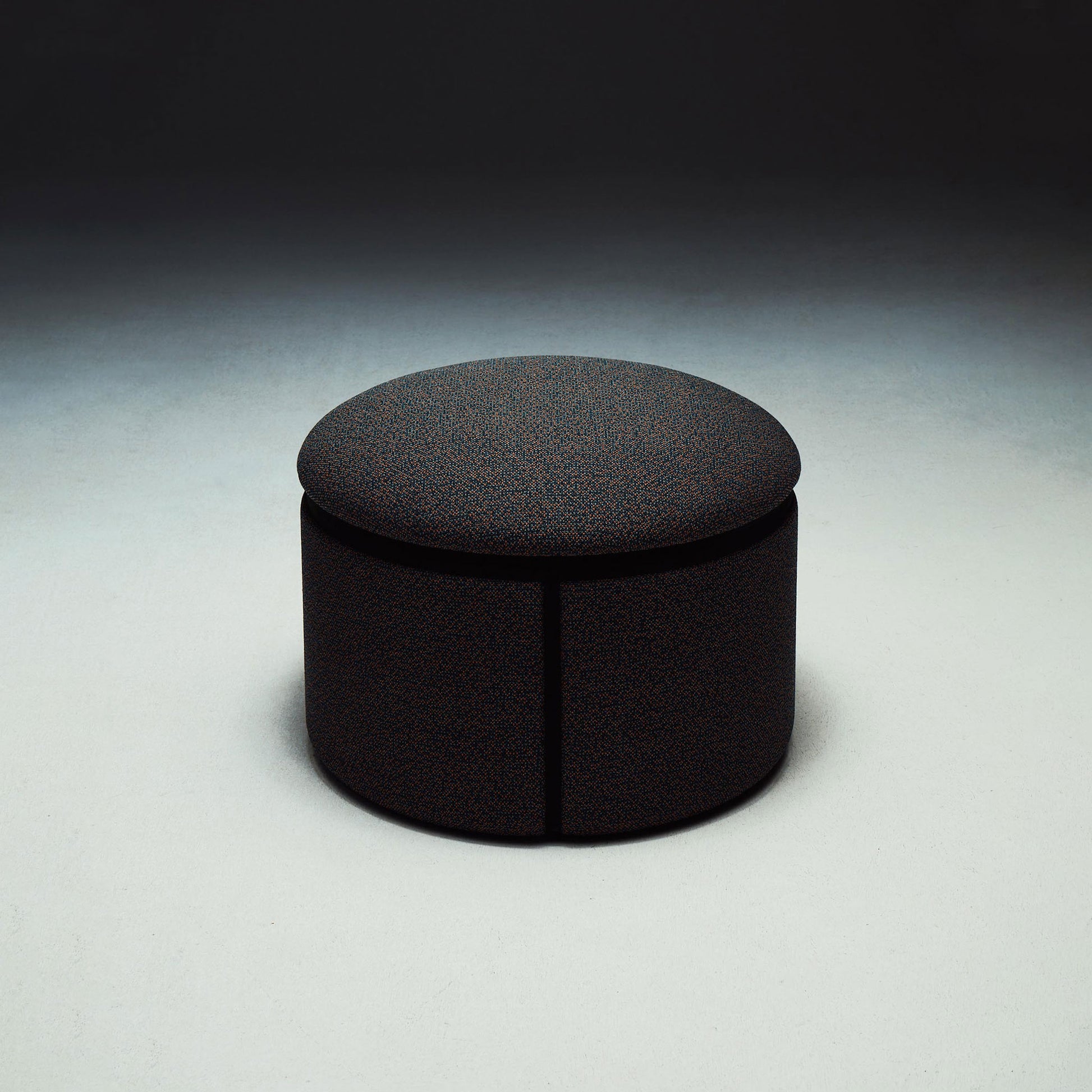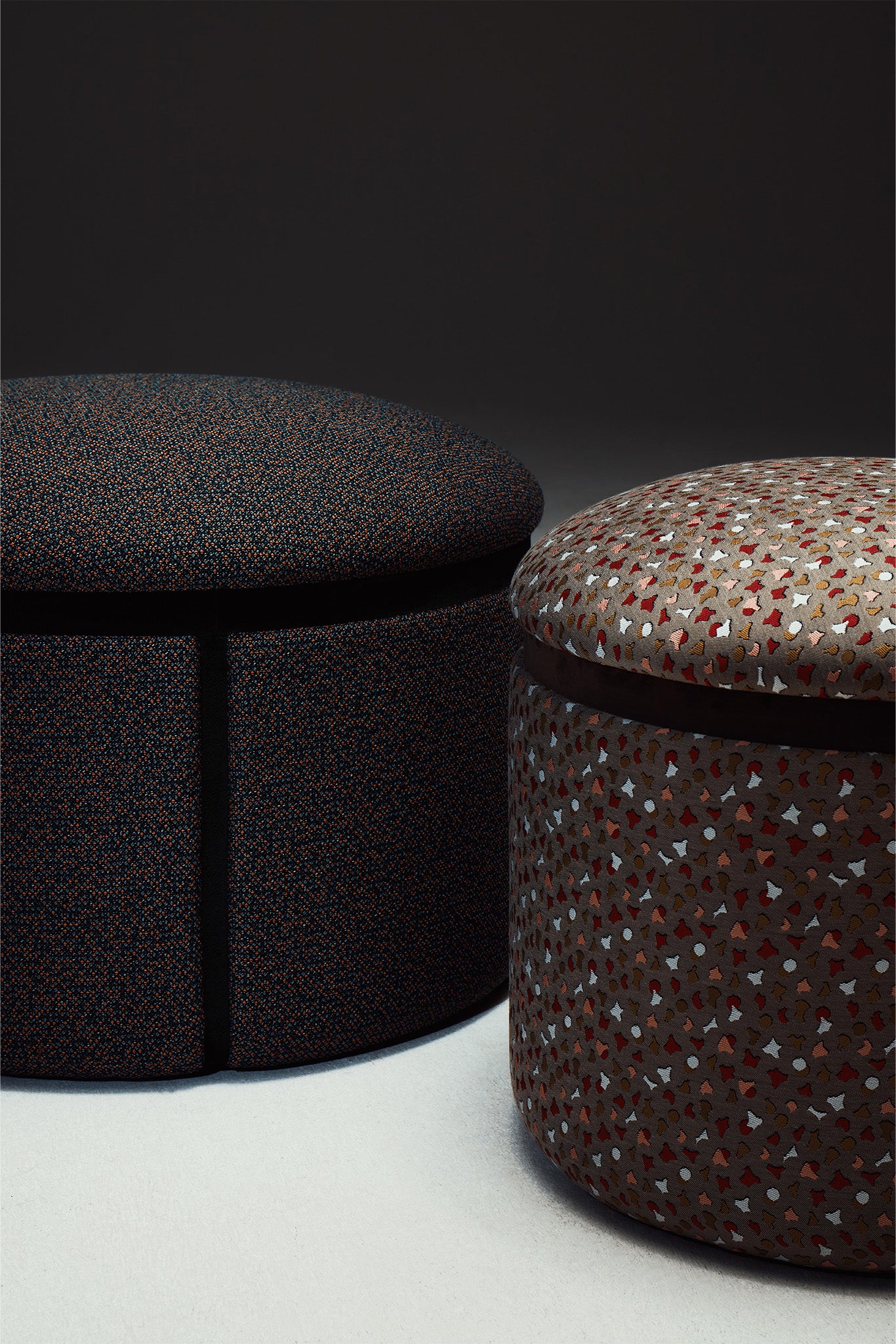 It consists of a crucial centre element: a flat surface in natural or lacquered walnut serving as a coffee table, to which a series of poufs are attached. This informal and collaborative configuration gives users full latitude to choose the position they feel most comfortable in and the way they want to interact with others. The range includes several compositions, meeting a variety of needs for workspace, residential or hospitality environments. Individual upholstered poufs are also available in two sizes and can be combined inside a room into fun and spontaneous clusters to create personalised patterns.