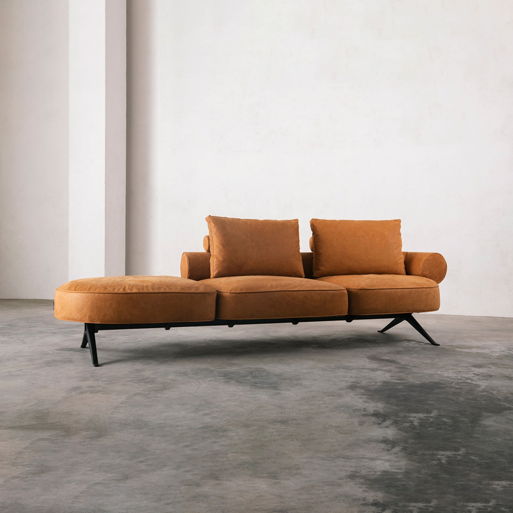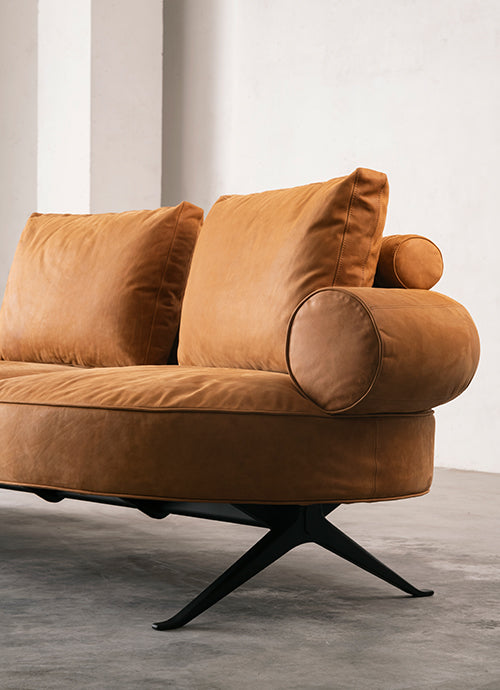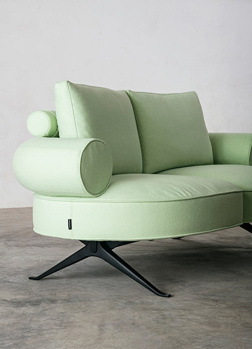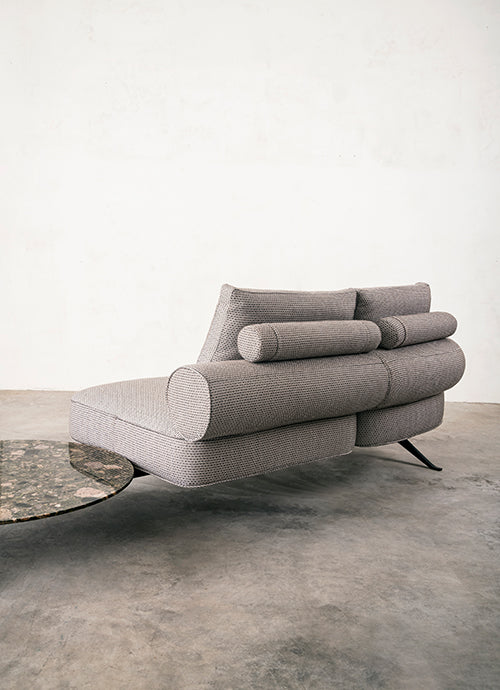 An arched angular piece, a central square and a circular one, available both as a table and as a pouf, are the foundation for a variety of settings. Supported by a discrete and elegant cast aluminium feet, the three modules can be juxtaposed and mixed with the addition of cylindrical and rectangular cushions for the backrest. From a classic three seater sofa to a number of wider and more complex solutions.