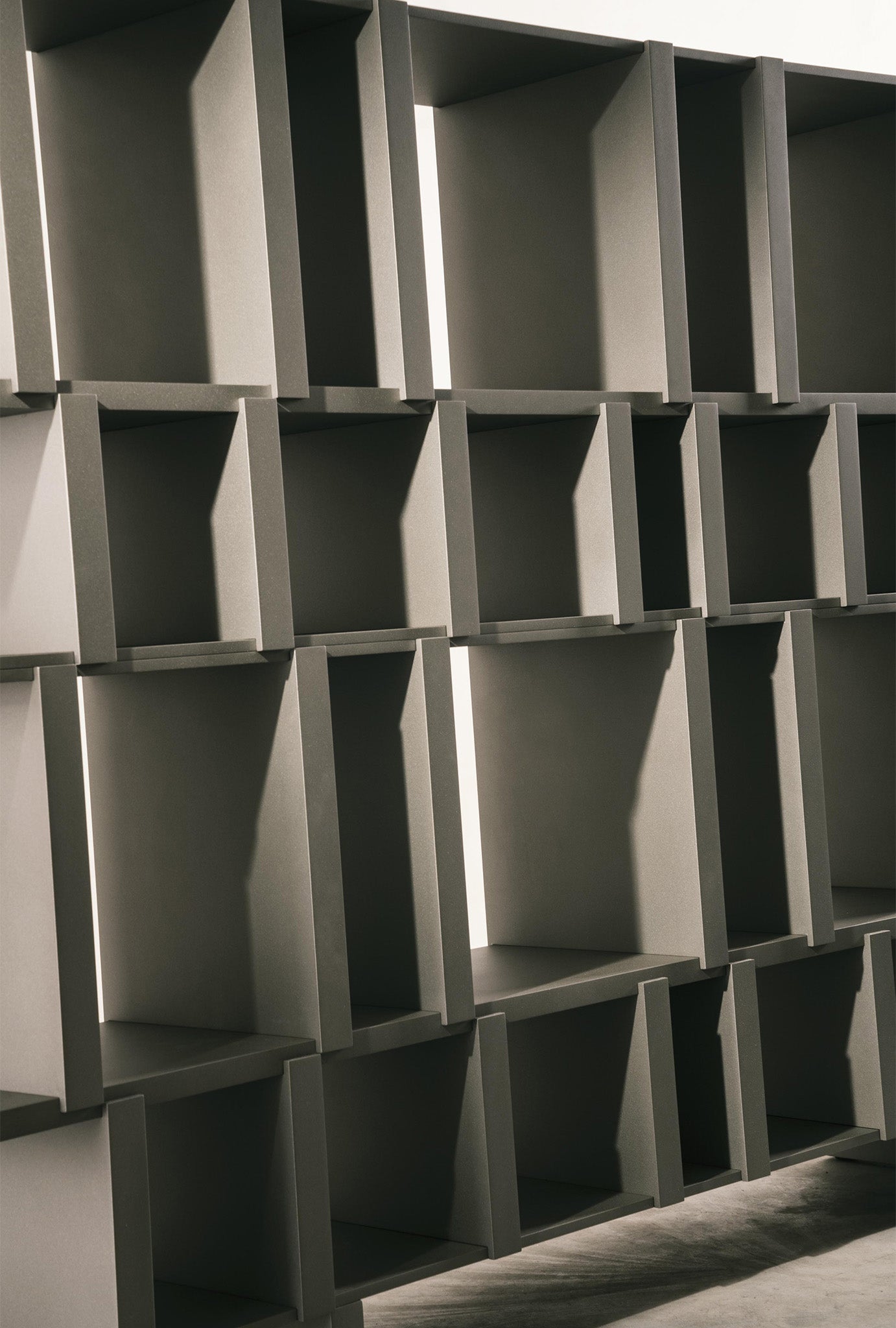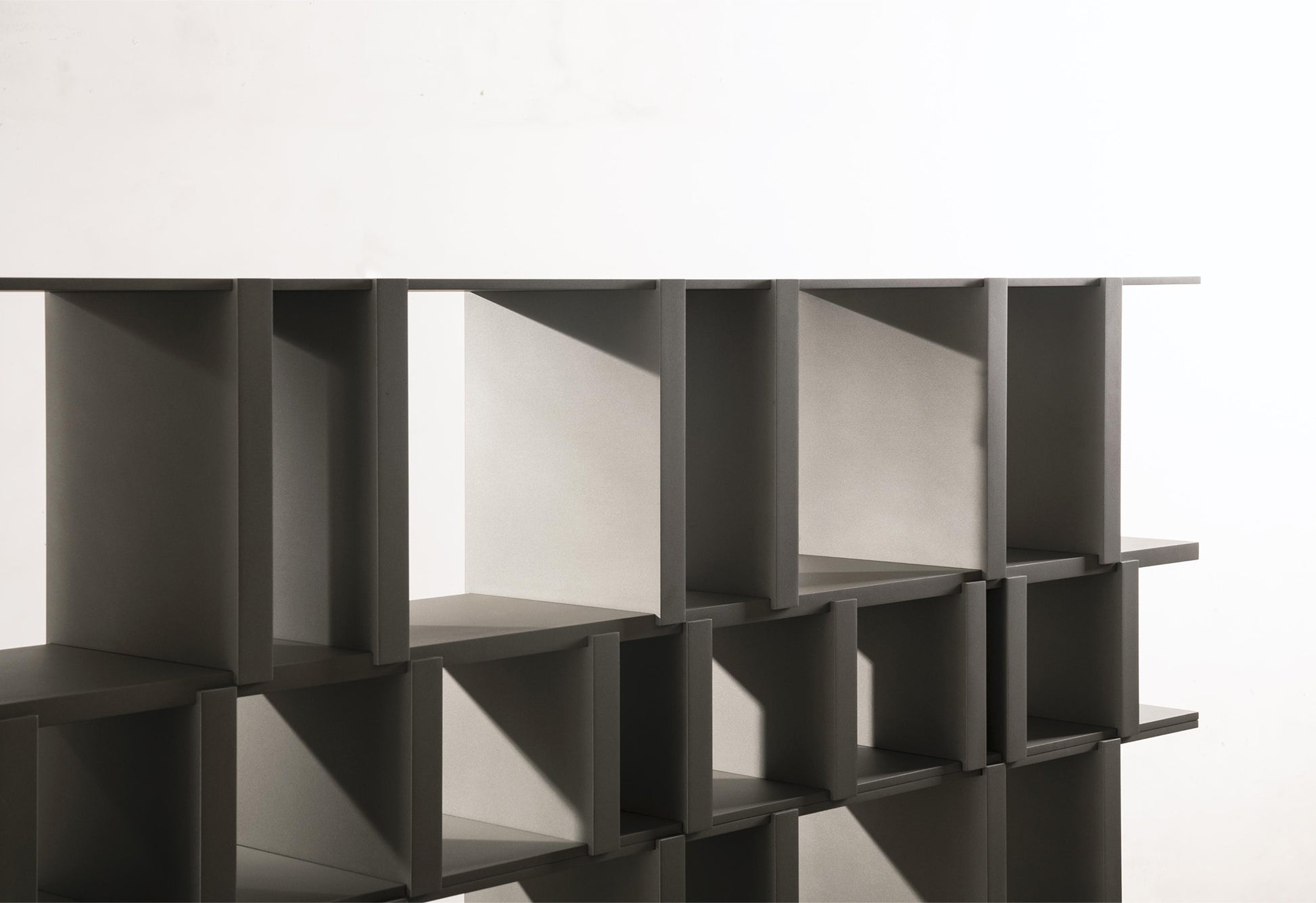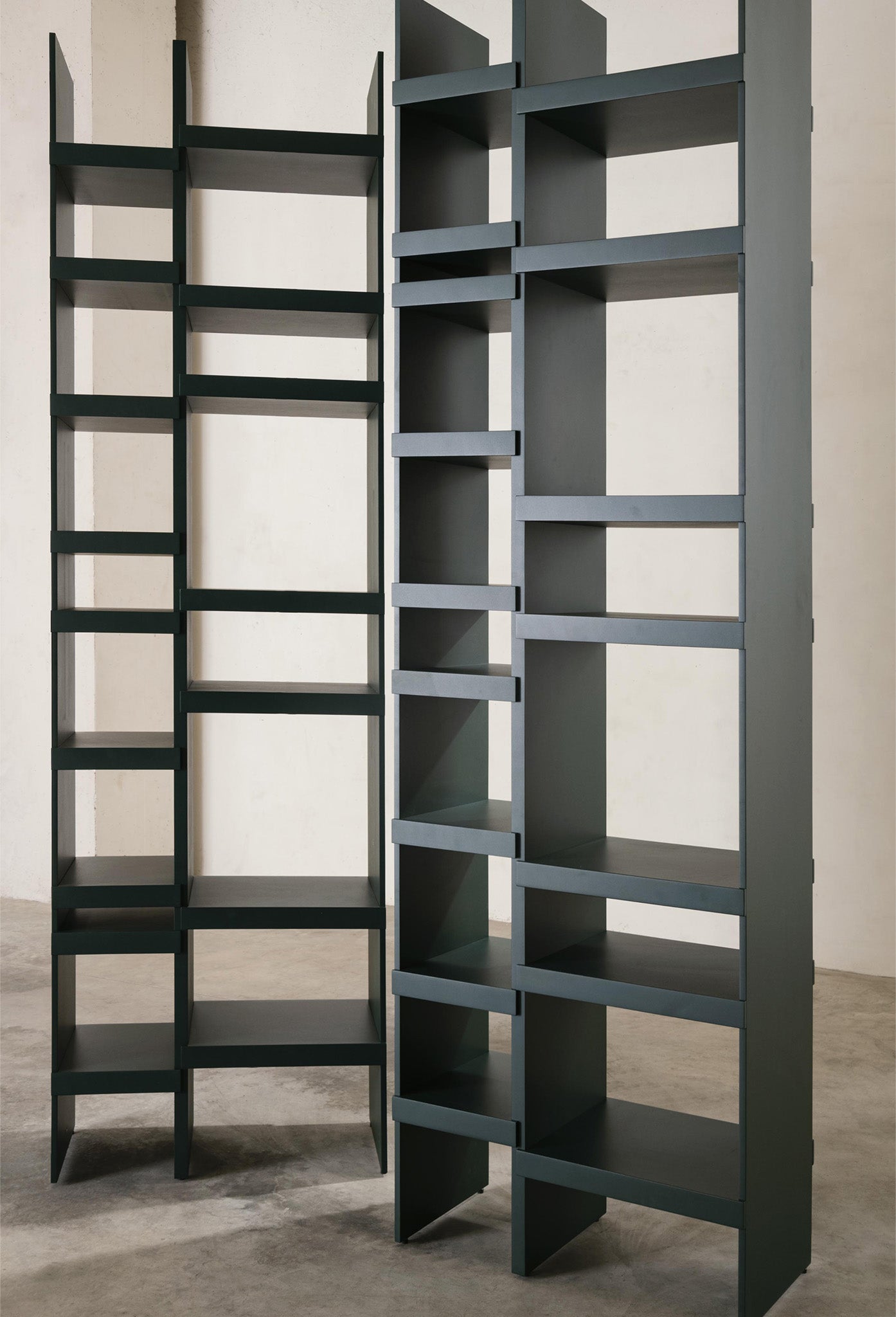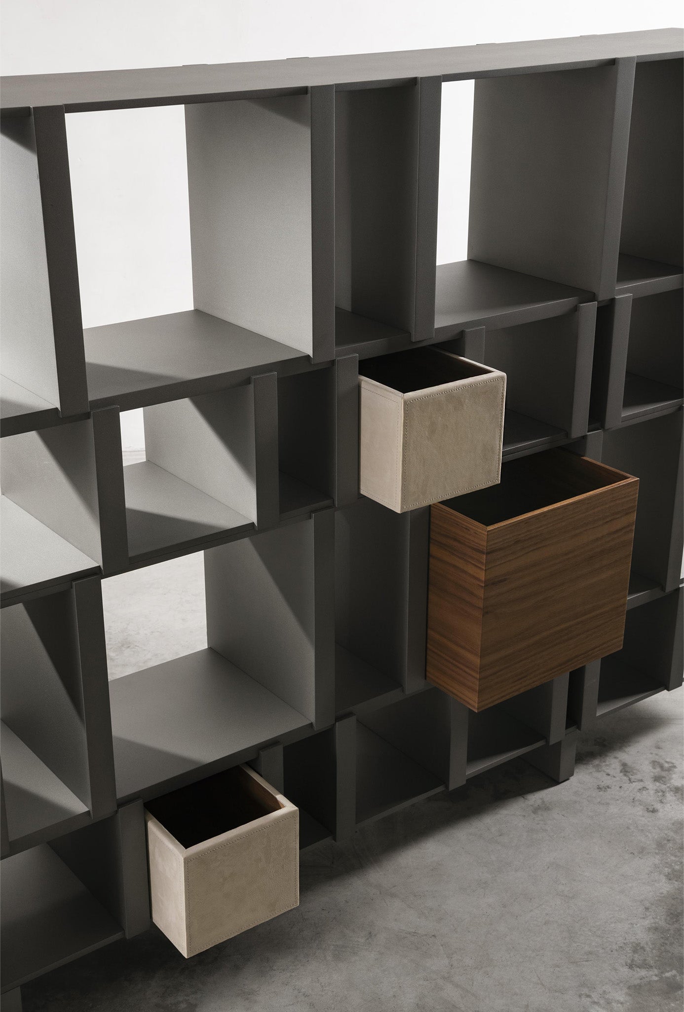 The thin lines of the frame aim for invisibility while contrasting the thicker dividers, in an unusual combination of thicknesses. The different sizes and shapes of the sections combine to give a sense of movement, while drawers in leather or wood can be added to the bookshelf. Pyrite can be used as a single module with two shelves, functioning as a standing alone piece, or it can be combined with others horizontally so to create a larger bookshelf system or either repeated vertically, to cover the length of entire walls.