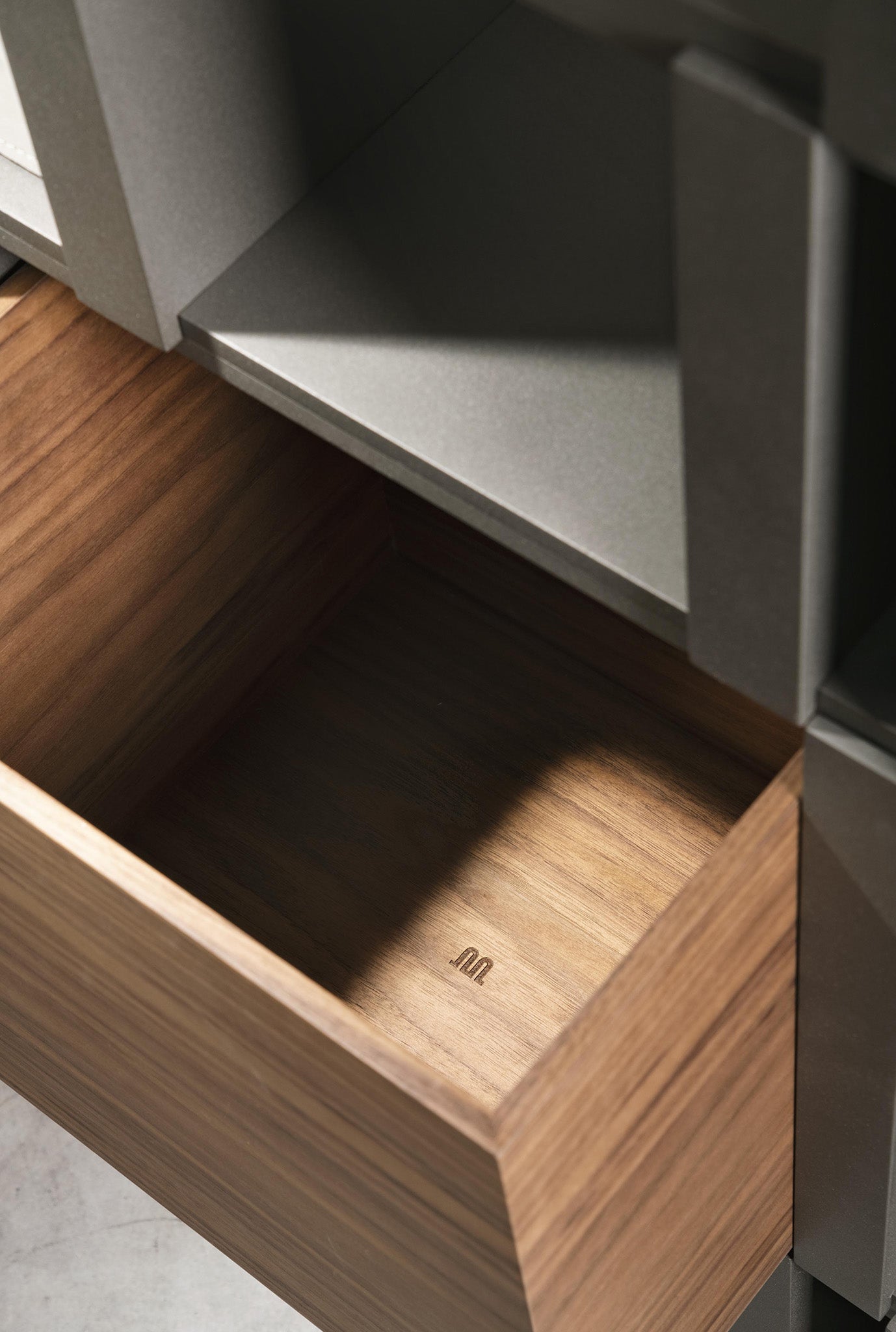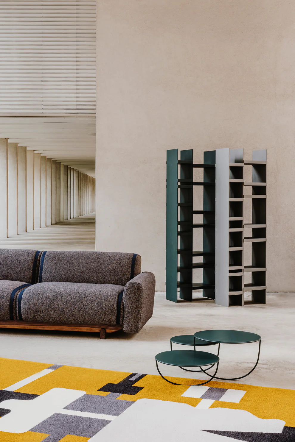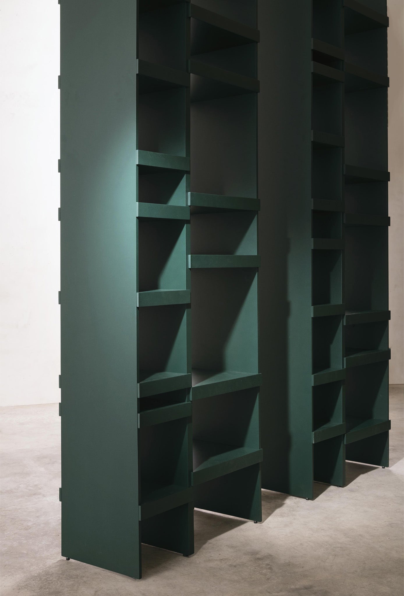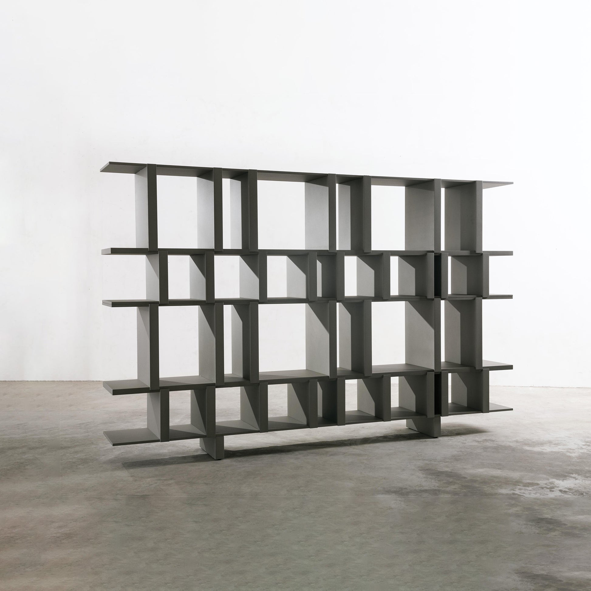 The thin lines of the frame aim for invisibility while contrasting the thicker dividers, in an unusual combination of thicknesses. The different sizes and shapes of the sections combine to give a sense of movement, while drawers in leather or wood can be added to the bookshelf. Pyrite can be used as a single module with two shelves, functioning as a standing alone piece, or it can be combined with others horizontally so to create a larger bookshelf system or either repeated vertically, to cover the length of entire walls.